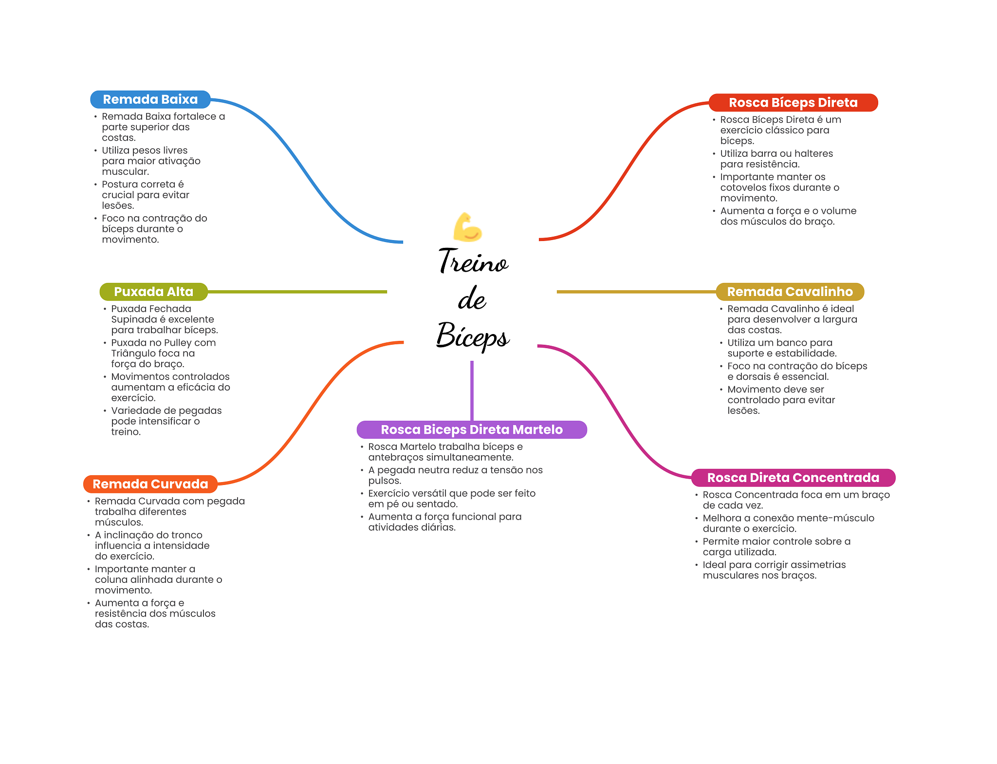 Remada Baixa Rosca Bíceps Direta Remada Baixa fortalece a Rosca Bíceps Direta é um parte superior das exercício clássico para costas. bíceps. Utiliza pesos livres Utiliza barra ou halteres para maior ativação para resistência. muscular. Importante manter Postura correta é cotovelos fixos durante crucial para evitar movimento. lesões. Aumenta a força e volume Foco na contração do dos músculos do braço. bíceps durante movimento. Treino Puxada Alta de Remada Cavalinho Puxada Fechada Remada Cavalinho é ideal Supinada é excelente para desenvolver a largura para trabalhar bíceps. das costas. Puxada no Pulley com Utiliza um banco para Triângulo foca na suporte e estabilidade. força do braço. Foco na contração do bíceps Movimentos controlados e dorsais é essencial. aumentam a eficácia do Movimento deve ser exercício. controlado para evitar Variedade de pegadas lesões. pode intensificar treino. Rosca Biceps Direta Martelo Rosca Martelo trabalha bíceps e antebraços simultaneamente. A pegada neutra reduz a tensão nos Remada Curvada pulsos. Rosca Direta Concentrada Exercício versátil que pode ser feito Rosca Concentrada foca em um braço Remada Curvada com pegada em pé ou sentado. de cada vez. trabalha diferentes músculos. Aumenta a força funcional para Melhora a conexão mente-músculo atividades diárias. durante exercício. A inclinação do tronco influencia a intensidade Permite maior controle sobre a do exercício. carga utilizada. Importante manter a Ideal para corrigir assimetrias coluna alinhada durante musculares nos braços. movimento. Aumenta a força e resistência dos músculos das costas.