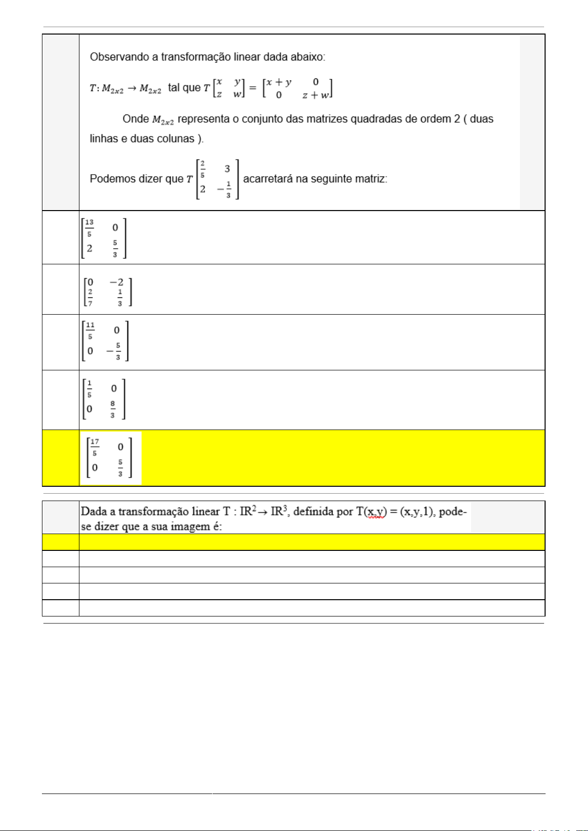 07/01/2026 08:44:19 2/4 Questão 004 X A) B) C) D) E) Questão 005 A) Um plano B) um espaço vetorial. X C) uma esfera de raio 1 D) uma reta que passa por z = 1. E) um disco centrado na origem de raio 1 07/01/2026 08:44:19 3/4 Questão 006 Uma transformação linear do tipo tem como característica tomar um vetor do plano e transforma-lo, rotacionando, aumentando-o, diminuindo-o ou fazendo simultaneamente as informações anteriores além de também pode levá-lo a um outro qualquer. De acordo com as informações apresentadas, verificamos a importância de uma transformação linear em vários campos de estudo, como por exemplo na Física, onde se pode aplicar esse estudo em movimentos de braços de forma linear. Observando o esquema gráfico a seguir, determine qual dentre as transformações apresentadas poderia representá- lo: A) T( x; y ) = ( x; y ) X B) T( x; y) = ( -x; y ) C) T( x; y ) = ( -x; -y ) D) T(x; y ) = ( y; x ) E) T( x; y ) = ( x; -y ) Questão 007 Determine a transformação linear , tal que T(1; 1 ) = ( 2; 0; 2 ) e T(0; -2) = ( -2; 2; 0 ). A) B) C) X D) E) 07/01/2026 08:44:19 4/4 Questão 008 As transformações lineares podem ser muito úteis em vários campos do conhecimento, inclusive na Física, envolvendo deslocamento de vetores no plano cartesiano. Vamos tomar uma situação a respeito desse deslovcamento, veja : O deslocamento de um vetor do segundo um ângulo a pode ser observado graficamente da seguinte forma: A) ( 1 ; -3 ) X B) ( 2; 0 ) C) ( -3 ; 1 ) D) ( - 3; -1 ) E) ( 0; 3 )