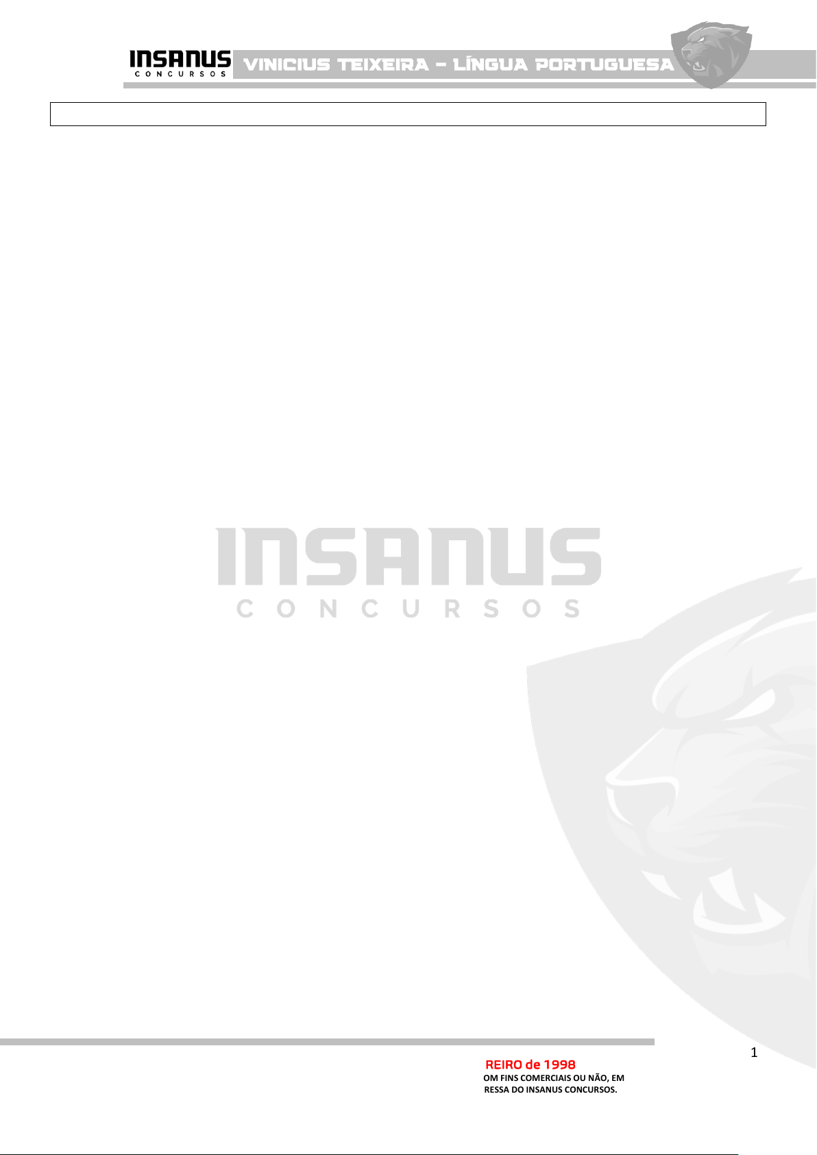 1 LEI DO DIREITO AUTORAL – Nº 9.610 de 19 de FEVEREIRO de 1998 PROÍBE-SE A COMERCIALIZAÇÃO TOTAL OU PARCIAL DESSE MATERIAL OU DIVULGAÇÃO COM FINS COMERCIAIS OU NÃO, EM QUALQUER MEIO DE COMUNICAÇÃO, INCLUSIVE NA INTERNET, SEM AUTORIZAÇÃO EXPRESSA DO INSANUS CONCURSOS. EMPREGO DAS CLASSES GRAMATICAIS I. Estrutura das Palavras A estrutura das palavras é um dos pilares da morfologia, ramo da linguística que estuda a formação e a estrutura das palavras. Compreender como as palavras são formadas e quais elementos as compõem é crucial para a interpretação de textos, a formação de vocabulário e, principalmente, para resolver questões de concursos que abordam ortografia, semântica e formação de palavras. Este material abordará os principais elementos mórficos e os processos de formação de palavras, com foco nos temas mais cobrados em provas. I. Elementos Mórficos (Morfemas) Os morfemas são as menores unidades de significado de uma palavra. São eles que, combinados, dão origem a novas palavras ou modificam o sentido e a função gramatical das existentes. 1. Radical (ou Morfema Lexical) É o elemento principal e irredutível da palavra, que contém seu significado básico e essencial. É a parte que geralmente se mantém em toda a família de palavras. • Exemplos: o Pedra, pedreiro, pedregulho, apedrejar. (Radical: pedr-) o Ferro, ferreiro, ferrugem, enferrujar. (Radical: ferr-) o Livro, livraria, livreiro. (Radical: livr-) 2. Vogal Temática É a vogal que se junta ao radical para permitir a ele a recepção das desinências. É a vogal que indica a conjugação (em verbos) ou a classe de palavras (em nomes). • Vogais Temáticas Verbais: Indicam a conjugação do verbo. o -a-: Verbos de 1ª conjugação (ex: falar, cantar) o -e-: Verbos de 2ª conjugação (ex: vender, comer) o -i-: Verbos de 3ª conjugação (ex: partir, dormir) • Vogais Temáticas Nominais: Ligam o radical às desinências nominais. o -a-: (ex: casa, mesa) o -e-: (ex: arte, dente) o -o-: (ex: livro, cachorro) 3. Tema É a união do radical com a vogal temática. É a base para a adição das desinências. • Exemplos: o Fala (radical fal- + vogal temática -a-) o Vende (radical vend- + vogal temática -e-) o Parti (radical part- + vogal temática -i-) o Livro (radical livr- + vogal temática -o-) 4. Afixos São morfemas que se acrescentam ao radical (ou tema) para formar novas palavras ou para modificar seu sentido. • Prefixos: Vêm antes do radical. o Exemplos: ▪ Refazer (prefixo re- indica repetição) ▪ Infeliz (prefixo in- indica negação) ▪ Desleal (prefixo des- indica oposição) • Sufixos: Vêm depois do radical (ou tema). o Exemplos: ▪ Pedreiro (sufixo -eiro indica profissão/agente) ▪ Felizmente (sufixo -mente forma advérbios de modo) ▪ Casazinha (sufixo -zinha indica diminutivo) 5. Desinências São morfemas que indicam as flexões das palavras (gênero, número, pessoa, tempo, modo). • Desinências Nominais: Indicam as flexões de substantivos, adjetivos e alguns pronomes. o De Gênero: Indicam o masculino ou feminino. 2 LEI DO DIREITO AUTORAL – Nº 9.610 de 19 de FEVEREIRO de 1998 PROÍBE-SE A COMERCIALIZAÇÃO TOTAL OU PARCIAL DESSE MATERIAL OU DIVULGAÇÃO COM FINS COMERCIAIS OU NÃO, EM QUALQUER MEIO DE COMUNICAÇÃO, INCLUSIVE NA INTERNET, SEM AUTORIZAÇÃO EXPRESSA DO INSANUS CONCURSOS. ▪ -o: Menino, bonito ▪ -a: Menina, bonita o De Número: Indicam o singular ou plural. ▪ -s: Livros, mesas (para o plural) ▪ (Ausência de desinência para o singular) • Desinências Verbais: Indicam as flexões de pessoa, número, tempo e modo dos verbos. o Modo-Temporais (DMT): Indicam o tempo e o modo do verbo. ▪ -va-: Cantávamos (Pretérito Imperfeito do Indicativo) ▪ -sse-: Se cantasse (Pretérito Imperfeito do Subjuntivo) ▪ -ra-: Cantara (Pretérito Mais-que-perfeito do Indicativo) o Número-Pessoais (DNP): Indicam a pessoa e o número do verbo. ▪ -mos: Cantávamos (1ª pessoa do plural) ▪ -is: Cantais (2ª pessoa do plural) ▪ -m: Cantam (3ª pessoa do plural) 6. Vogais e Consoantes de Ligação São elementos fonéticos que aparecem entre morfemas para facilitar a pronúncia, sem valor semântico próprio. • Exemplos: o Cafeicultura (ligação entre "café" e "cultura") o Gásômetro (ligação entre "gás" e "metro") o Paulada (ligação entre "pau" e "ada") II. Processos de Formação de Palavras As palavras da Língua Portuguesa são formadas por diferentes processos, sendo os mais comuns a derivação e a composição. 1. Derivação Processo em que uma palavra nova (derivada) é formada a partir de uma já existente (primitiva), pela adição de afixos. • Derivação Prefixa (ou Prefixação): Adição de um prefixo à palavra primitiva. o Exemplos: ▪ Feliz → Infeliz ▪ Fazer → Refazer ▪ Leal → Desleal • Derivação Sufixa (ou Sufixação): Adição de um sufixo à palavra primitiva. o Exemplos: ▪ Pedra → Pedreiro ▪ Casa → Casarinha ▪ Real → Realmente • Derivação Parassintética (ou Parassíntese): Adição simultânea de prefixo e sufixo à palavra primitiva, de modo que nenhum dos afixos pode ser retirado isoladamente sem que a palavra perca o sentido ou deixe de existir na língua. o Importante: Se retirarmos o prefixo ou o sufixo, a palavra resultante NÃO existe ou não tem o mesmo sentido. o Exemplos: ▪ Noite → Enoitecer (não existe "noitecer" nem "enoite") ▪ Triste → Entristecer (não existe "tristecer" nem "entriste") ▪ Pobre → Empobrecer (não existe "pobrecer" nem "empobre") • Derivação Regressiva (ou Deverbal/Substantivação): Formação de substantivos a partir de verbos, sem a adição de sufixo, pela "regressão" do verbo a um substantivo que indica a ação. Geralmente, ocorre a perda da desinência verbal. o Importante: A palavra derivada indica a ação do verbo. o Exemplos: ▪ Comprar → Compra (a compra) ▪ Sacar → Saque (o saque) ▪ Combater → Combate (