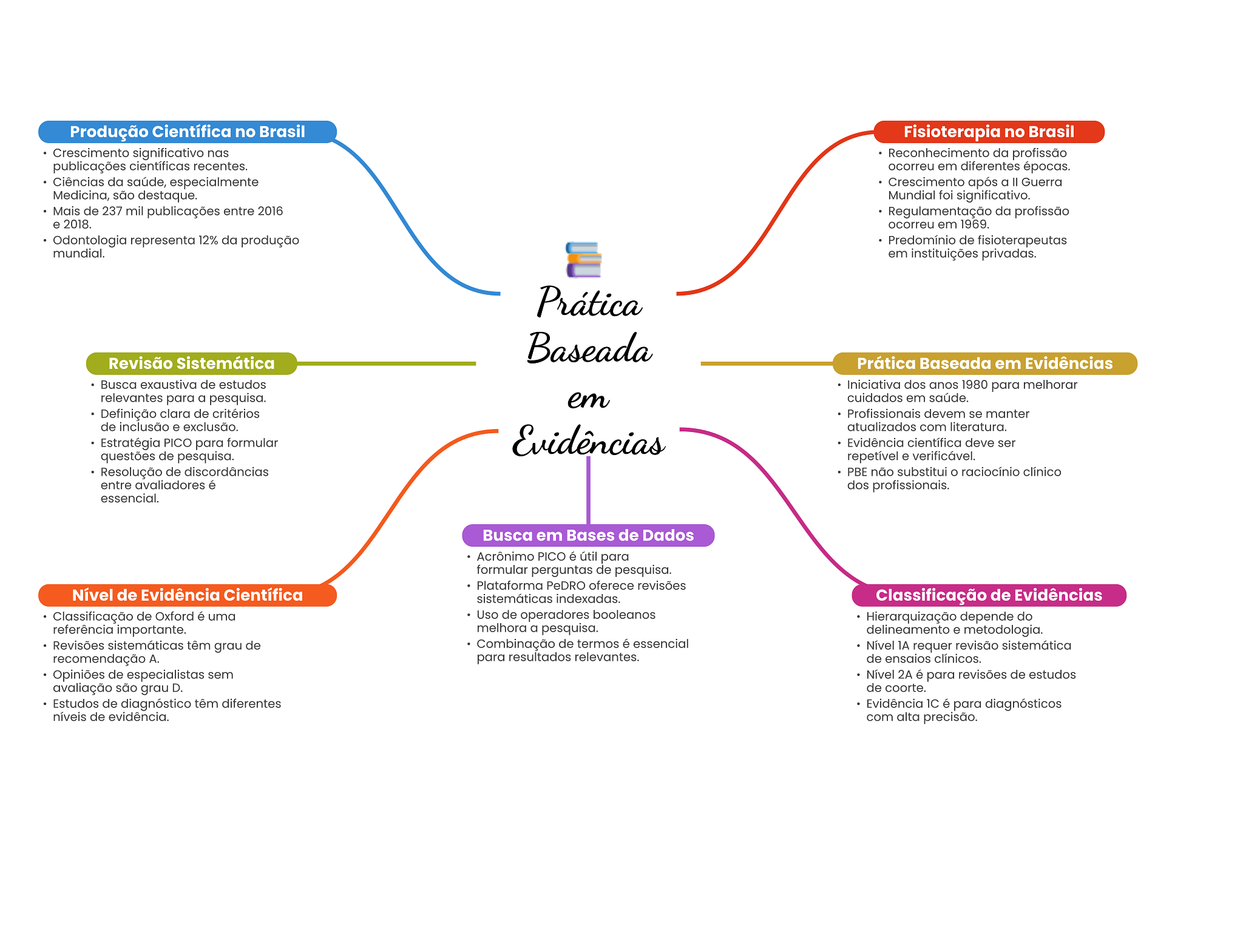 Produção Científica no Brasil Fisioterapia no Brasil Crescimento significativo nas Reconhecimento da profissão publicações científicas recentes. ocorreu em diferentes épocas. Ciências da saúde, especialmente Crescimento após a Guerra Medicina, são destaque. Mundial foi significativo. Mais de 237 mil publicações entre 2016 Regulamentação da profissão e 2018. ocorreu em 1969. Odontologia representa 12% da produção Predomínio de fisioterapeutas mundial. em instituições privadas. Prática Baseada Revisão Sistemática Prática Baseada em Evidências Busca exaustiva de estudos Iniciativa dos anos 1980 para melhorar relevantes para a pesquisa. em cuidados em saúde. Definição clara de critérios Profissionais devem se manter de inclusão e exclusão. atualizados com literatura. Estratégia PICO para formular Evidências Evidência científica deve ser questões de pesquisa. repetível e verificável. Resolução de discordâncias PBE não substitui raciocínio clínico entre avaliadores é dos profissionais. essencial. Busca em Bases de Dados Acrônimo PICO é útil para formular perguntas de pesquisa. Plataforma PeDRO oferece revisões Nível de Evidência Científica sistemáticas indexadas. Classificação de Evidências Classificação de Oxford é uma Uso de operadores booleanos Hierarquização depende do referência importante. melhora a pesquisa. delineamento e metodologia. Revisões sistemáticas têm grau de Combinação de termos é essencial 1A requer revisão sistemática recomendação para resultados relevantes. de ensaios clínicos. Opiniões de especialistas sem Nível 2A é para revisões de estudos avaliação são grau D. de coorte. Estudos de diagnóstico têm diferentes Evidência é para diagnósticos níveis de evidência. com alta precisão.