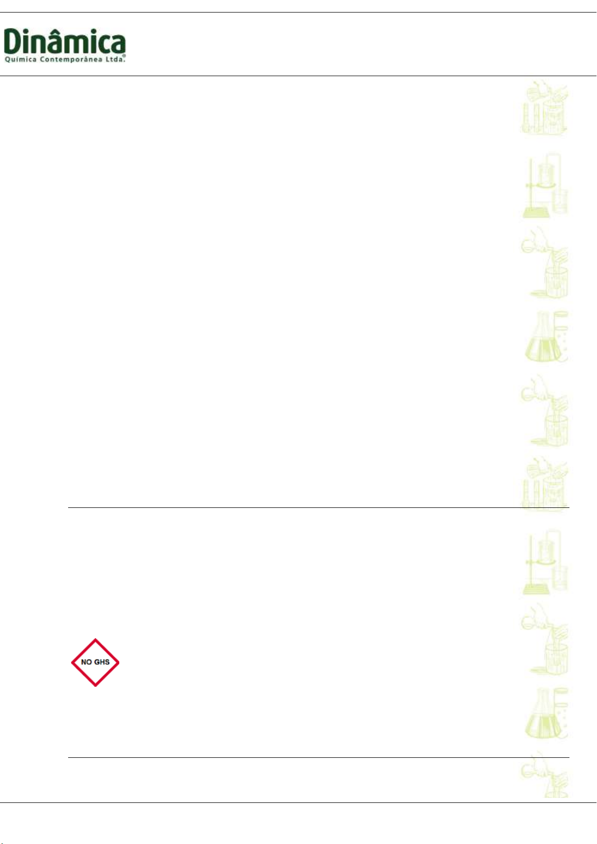 FDS FICHA COM DADOS DE SEGURANÇA Versão 4.0 | 2024 Data de Emissão: 25/03/2025 SOL. PADRAO DE CONDUTIVIDADE 1408 µS/cm www.dinamicaquimica.com.br Página 1 de 13 DG.CQ.001.01 - Rev. 04 Emissão 09/09/2024 1. IDENTIFICAÇÃO 1.1. Identificação do produto Nome do Produto: SOL. PADRÃO DE CONDUTIVIDADE 1408 µS/cm Código do Produto: P.01.0204.012.46 Marca: Dinâmica Química® 1.2. Outras maneiras de identificação 1.3. Usos recomendados e restrições de uso Utilizações identificadas: Utilização em Laboratório de Controle de Qualidade Utilizações desaconselhadas: Não permitido para fins alimentícios e medicinais 1.4. Detalhes do fornecedor Nome: Dinâmica Química Contemporânea LTDA Endereço: Rua Crisolita, 145 • Recreio Campestre Jóia, Indaiatuba - SP - Brasil Telefone: +55 19 3114-9250 | +55 19 3114-9244 E-mail: dinamica@dinamicaquimica.com.br 1.5. Número do telefone de emergência (19) 3114-9244 2. IDENTIFICAÇÃO DE PERIGOS 2.1. Classificação GHS da substância/mistura ou outra informação nacional ou regional Não classificado como perigoso de acordo com a ABNT NBR 14725. 2.2. Elementos de rotulagem do GHS, incluindo frases de precaução Sem exigência de pictograma de advertência, palavra sinalizadora ou de frases de perigo ou precaução. 2.3. Outros perigos que não resultam em uma classificação Nenhum. mailto:dinamica@dinamicaquimica.com.br FDS FICHA COM DADOS DE SEGURANÇA Versão 4.0 | 2024 Data de Emissão: 25/03/2025 SOL. PADRAO DE CONDUTIVIDADE 1408 µS/cm www.dinamicaquimica.com.br Página 2 de 13 DG.CQ.001.01 - Rev. 04 Emissão 09/09/2024 3. COMPOSIÇÃO E INFORMAÇÕES SOBRE OS INGREDIENTES 3.1. Substâ ncia 3.2. Mistura Identidade química CAS Classificação de perigo Concentração Água Ultra Pura [7732-18-5] Produto não perigoso de acordo com o Sistema Globalmente Harmonizado (GHS). Máx. 100% Cloreto de Potássio PA [7447-40-7] Toxicidade aguda, Oral (Categoria 5), H303. Máx. 1% 4. MEDIDAS DE PRIMEIROS-SOCORROS 4.1. Descrição de medidas necessárias de primeiros-socorros Inalação Após inalação: Exposição ao ar fresco. Contato com a pele Retirar imediatamente toda a roupa contaminada. Enxaguar a pele com água / tomar uma ducha. Contato com os olhos Após contato com os olhos: Enxaguar abundantemente com água. Remova as lentes de contato. Ingestão Após ingestão: fazer a vítima beber água (dois copos no máximo). Consultar um médico. 4.2. Sintomas e efeitos mais importantes, agudos ou tardios Os sintomas e efeitos mais importantes conhecidos estão descritos no rótulo do produto e na seção 2.2 e/ou 11 deste documento. 4.3. Indicação de atenção médica imediata e tratamentos especiais requeridos, se necessário Não disponível. FDS FICHA COM DADOS DE SEGURANÇA Versão 4.0 | 2024 Data de Emissão: 25/03/2025 SOL. PADRAO DE CONDUTIVIDADE 1408 µS/cm www.dinamicaquimica.com.br Página 3 de 13 DG.CQ.001.01 - Rev. 04 Emissão 09/09/2024 5. MEDIDAS DE COMBATE A INCÊNDIO 5.1. Meios de extinção Meios de extinção adequados Adapte as medidas de combate a incêndios às condições locais e ao ambiente que esta situado ao seu redor. Meios de extinção inadequados Para esta substância/mistura, não há limitações dos agentes de extinção. 5.2. Perigos específicos provenientes da substância ou mistura Óxidos de potássio Cloreto de hidrogênio gasoso Não combustível. 5.3. Medidas de proteção especiais para a equipe de combate a incêndio Evitar a contaminação de águas superficiais e subterrâneas pela água de combate a incêndios. 6. MEDIDAS DE CONTROLE PARA DERRAMAMENTO OU VAZAMENTO 6.1. Precauções pessoais, equipamento de proteção e procedimentos de emergência 6.1.1. Para o pessoal que não faz parte dos serviços de emergência Conselho para o pessoal da não emergência: Evitar a inalação de vapores e aerossóis. Evacuar a área de perigo, observar os procedimentos de emergência, consultar um especialista. Para a proteção individual, consultar a seção 8. 6.1.2. Para o pessoal do serviço de emergência Usar equipamento de respiração autônomo em casos de incêndio. Para a proteção individual, consultar a seção 8. 6.2. Precauções ao meio ambiente Não permitir a entrada do produto no sistema de esgotos. 6.3. Métodos e materiais para a contenção e limpeza Absorver com absorvente de líquidos. Proceder à eliminação de resíduos. Limpar área afetada. Observar as possíveis restrições materiais (ver seções 7 e 10). FDS FICHA COM DADOS DE SEGURANÇA Versão 4.0 | 2024 Data de Emissão: 25/03/2025 SOL. PADRAO DE CONDUTIVIDADE 1408 µS/cm www.dinamicaquimica.com.br Página 4 de 13 DG.CQ.001.01 - Rev. 04 Emissão 09/09/2024 6.4. Remissão para outras seções Para eliminação de resíduos verificar seção 13. 7. MANUSEIO E ARMAZENAMENTO 7.1. Precauções para manuseio seguro Mudar a roupa contaminada. Depois de terminar o trabalho, lavar as mãos. Ver precauções na seção 2.2. 7.2. Condições de armazenamento seguro, incluindo qualquer incompatibilidade Guardar o recipiente hermeticamente fechado. Estabilidade em armazenamento Temperatura recomendada de armazenamento: 15 - 30°C. 7.3. Utilizações finais específicas Não disponível. 8. CONTROLE DE EXPOSIÇÃO E PROTEÇÃO INDIVIDUAL 8.1. Parâmetros de controle Componentes a controlar com relação ao local de trabalho Não contém substâncias com valores limites de exposição profissional. 8.2. Medidas de controle técnico Manusear de acordo com as boas práticas industriais de higiene e segurança. 8.3. Medidas de proteção pessoal Equipamento de Proteção Individual (EPI) Proteção ocular / facial Use equipamento de proteção ocular testado e aprovado de acordo com as normas governamentais adequadas, tais como NIOSH (US) ou EN 166 (EU). Óculos de segurança. Proteção da pele Manusear com luvas. FDS FICHA COM DADOS DE SEGURANÇA Versão 4.0 | 2024 Data de Emissão: 25/03/2025 SOL. PADRAO DE CONDUTIVIDADE 1408 