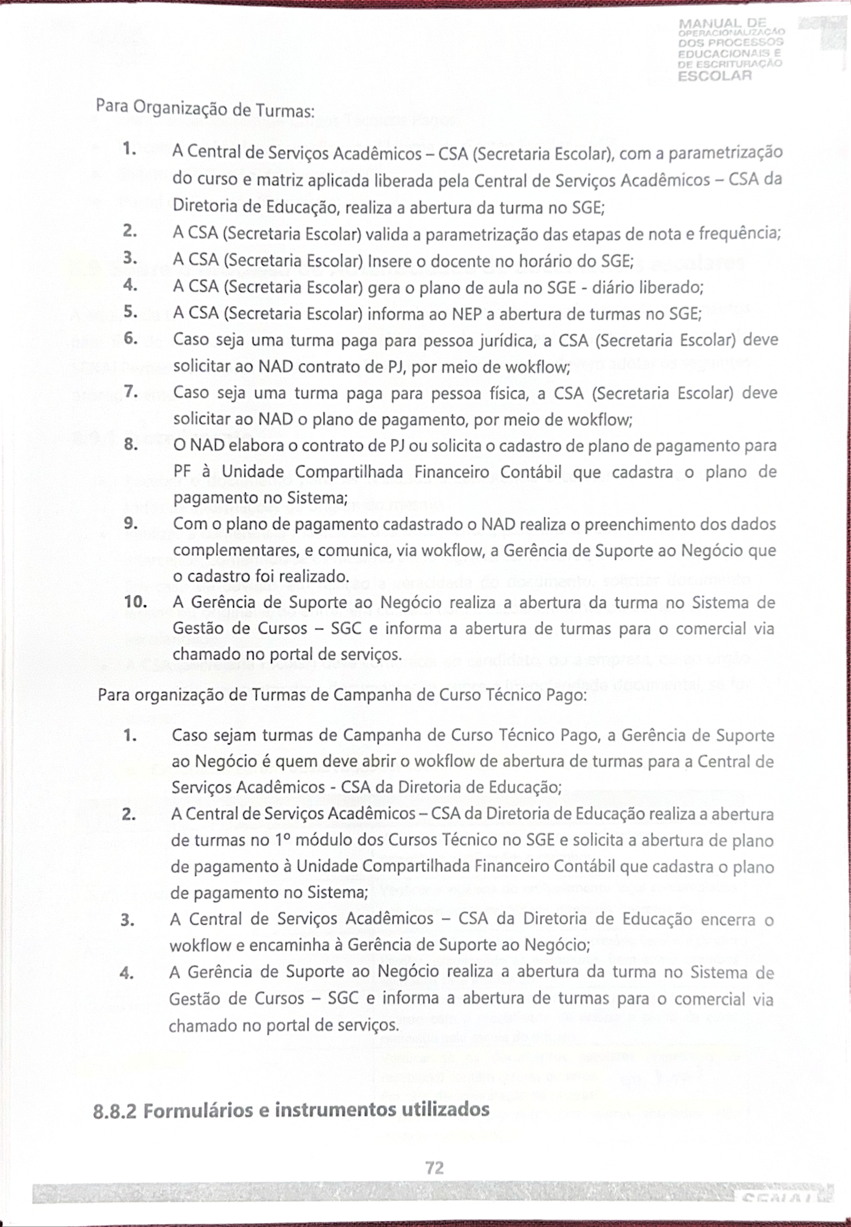 MANUAL DE DOS PROCESSOS EDUCACIONAIS E DE ESCRITURAÇÃO ESCOLAR Para Organização de Turmas: 1. A Central de Serviços Acadêmicos CSA (Secretaria Escolar), com a parametrização do curso e matriz aplicada liberada pela Central de Serviços Acadêmicos CSA da Diretoria de Educação, realiza a abertura da turma no SGE; 2. A CSA (Secretaria Escolar) valida a parametrização das etapas de nota e frequência; 3. A CSA (Secretaria Escolar) Insere o docente no horário do SGE; 4. A CSA (Secretaria Escolar) gera o plano de aula no SGE diário liberado; 5. A CSA (Secretaria Escolar) informa ao NEP a abertura de turmas no SGE; 6. Caso seja uma turma paga para pessoa jurídica, a CSA (Secretaria Escolar) deve solicitar ao NAD contrato de PJ, por meio de wokflow; 7. Caso seja uma turma paga para pessoa física, a CSA (Secretaria Escolar) deve solicitar ao NAD o plano de pagamento, por meio de wokflow; 8. NAD elabora o contrato de PJ ou solicita cadastro de plano de pagamento para PF à Unidade Compartilhada Financeiro Contábil que cadastra plano de pagamento no Sistema; 9. Com o plano de pagamento cadastrado o NAD realiza o preenchimento dos dados complementares, e comunica, via wokflow, a Gerência de Suporte ao Negócio que o cadastro foi realizado. 10. A Gerência de Suporte ao Negócio realiza a abertura da turma no Sistema de Gestão de Cursos SGC e informa a abertura de turmas para comercial via chamado no portal de serviços. Para organização de Turmas de Campanha de Curso Técnico Pago: 1. Caso sejam turmas de Campanha de Curso Técnico Pago, a Gerência de Suporte ao Negócio é quem deve abrir o wokflow de abertura de turmas para a Central de Serviços Acadêmicos CSA da Diretoria de Educação; 2. A Central de Serviços Acadêmicos CSA da Diretoria de Educação realiza a abertura de turmas no módulo dos Cursos Técnico no SGE e solicita a abertura de plano de pagamento à Unidade Compartilhada Financeiro Contábil que cadastra plano de pagamento no Sistema; 3. A Central de Serviços Acadêmicos CSA da Diretoria de Educação encerra wokflow e encaminha à Gerência de Suporte ao Negócio; 4. A Gerência de Suporte ao Negócio realiza a abertura da turma no Sistema de Gestão de Cursos SGC e informa a abertura de turmas para o comercial via chamado no portal de serviços. 8.8.2 Formulários e instrumentos utilizados 72MANUAL DE DOS PROCESSOS EDUCACIONAIS E DE ESCRITURAÇÃO ESCOLAR Planilha Campanha de Cursos Técnicos Pagos; Processo realizado via wokflow no Sistema de Gestão Escolar - SGE. Sistema de Gestão de Cursos (SGC); Portal de Serviços 8.9 Sobre processo de Autenticidade de documentos escolares A equipe da CSA (Secretaria escolar), quando do recebimento e conferência de documentos para fins de matrícula, e quando do recebimento de documentos emitidos em nome do SENAI Pernambuco, para fins de validação de documento escolar, devem adotar os seguintes procedimentos: 8.9.1 Procedimento Receber o documento para ser realizada a conferência e coletar com o candidato, todas as informações de origem do mesmo; Realizar a conferência minuciosa dos documentos, para fins de comprovação ou não a terceiros; conferindo se os mesmos estão legíveis, sem rasuras, e com boa resolução. Em caso de dúvidas em relação a veracidade do documento, solicitar documento legível ou original e/ou entrar em contato com a escola emitente do comprovante de escolaridade. A CSA (Secretaria Escolar) deve comunicar ao candidato, ou a empresa, ou ao órgão que esteja apresentando a documentação, sobre a irregularidade documental, se for caso; a. Critérios a serem observados na conferência dos documentos escolares: CRITÉRIO AÇÃO Discrepância dos atos autorizativos Verificar os atos autorizativos, confrontando-os com as respectivas publicações e carimbos Vigência errônea dos atos legais Verificar a vigência do embasamento legal contemplados nos documentos (lei federal, diretrizes, decretos, etc.). Assinaturas e carimbos condizentes Verificar a situação funcional do Secretário Escolar e Diretor Escolar, examinando as assinaturas, bem como carimbos utilizados pela Instituição. Cargas horárias regulares Verificar o cumprimento fidedigno da carga horária, de acordo com a modalidade de ensino e plano de curso oferecida pela escola de origem. Rasuras e erros Verificar se documentos escolares (expedidos ou recebidos) contêm rasuras ou erros. on line? Em caso de constatação de rasuras: Documentos expedidos por outras entidades: Não deverão ser aceitos. 73MANUAL DE OPERACIONALIZAÇÃO DOS PROCESSOS EDUCACIONAIS E DE ESCRITURAÇÃO ESCOLAR CRITÉRIO AÇÃO Documentos expedidos por escolas do SENAI: Solicitar correção e expedição de novo documento. Rastreabilidade Verificar a rastreabilidade dos dados escolares do candidato ou ex-aluno. Documentos expedidos por outras entidades: Deverão ser validados durante o período de matrícula. Caso necessário, a escola de origem poderá ser contatada, para realizar a validação documental. Assim, até que a escola de origem dê resposta quanto à solicitação de validação de autenticidade documental, a escola SENAI poderá informar ao candidato à Cursos Técnicos que o prazo de matrícula poderá estendido. Essa ação é para evitar que o candidato se matricule e prossiga os estudos, não estando apto para fazê-lo e o SENAI no decorrer do processo formativo tenha que tratar a situação mais agravada. Documentos expedidos por escolas do SENAI: Quando do recebimento de certificados, diplomas e históricos escolares em nome do SENAI, para fins de comprovação de sua veracidade, a escola deverá conferir: Se o "suposto ex aluno" já foi aluno do SENAI, na escola e no curso referenciados no respectivo documento; Se os documentos apresentados estão nos formulários padrões e da época utilizados pelo SENAI. Se os nomes do (a) Secretário (a) Escolar e Diretor (a) escolar correspondem aos profissionais que de fato ocupam(vam