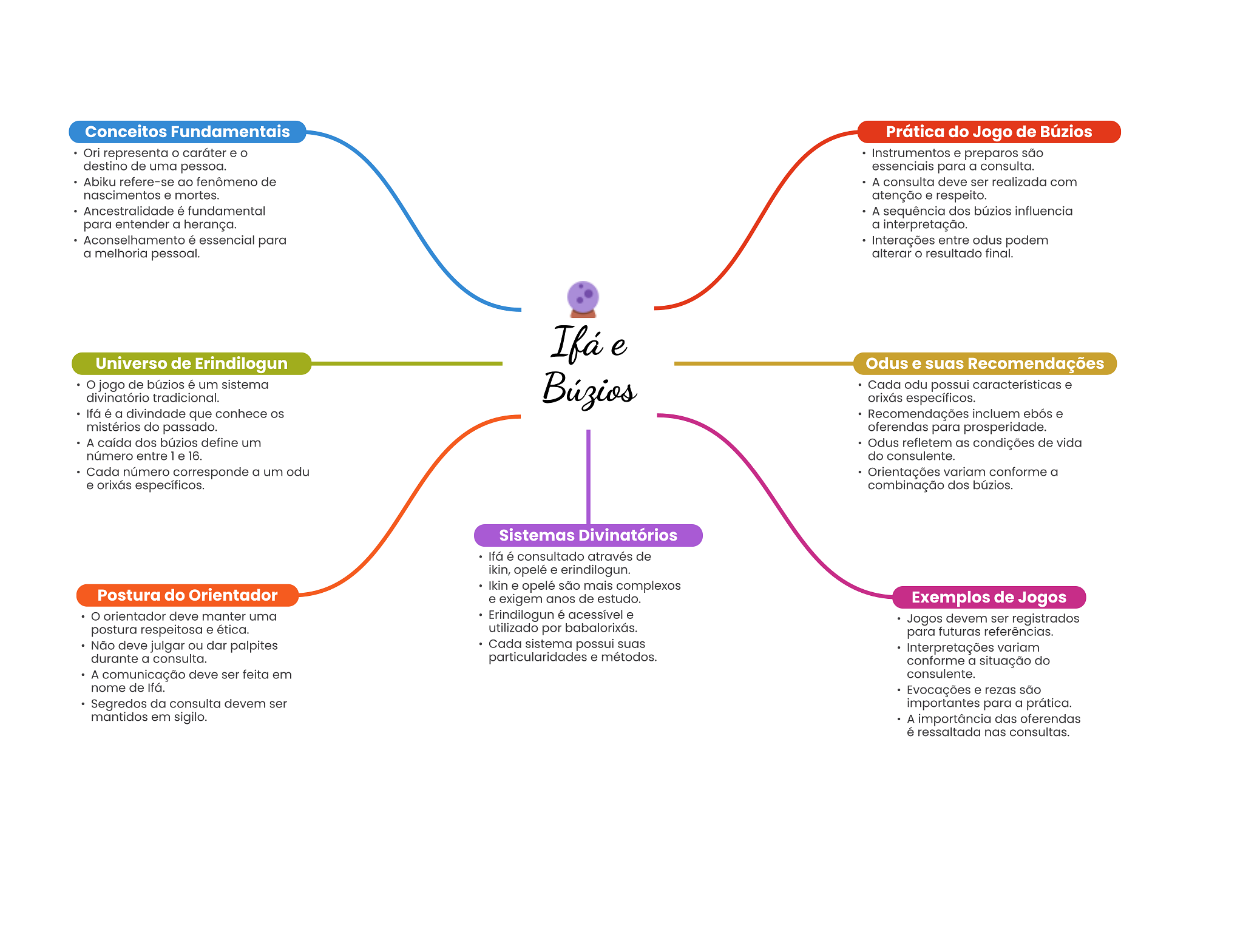 Conceitos Fundamentais Prática do Jogo de Búzios Ori representa caráter e Instrumentos e preparos são destino de uma pessoa. essenciais para a consulta. Abiku refere-se ao fenômeno de A consulta deve ser realizada com nascimentos e mortes. atenção e respeito. Ancestralidade é fundamental A sequência dos búzios influencia para entender a herança. a interpretação. Aconselhamento é essencial para Interações entre odus podem a melhoria pessoal. alterar resultado final. Ifáe Universo de Erindilogun Odus e suas Recomendações jogo de búzios é um sistema Búzios Cada odu possui características e divinatório tradicional. orixás específicos. Ifá é a divindade que conhece OS Recomendações incluem ebós e mistérios do passado. oferendas para prosperidade. A caída dos búzios define um Odus refletem as condições de vida número entre 1 e 16. do consulente. Cada número corresponde a um odu Orientações variam conforme a e orixás específicos. combinação dos búzios. Sistemas Divinatórios Ifá é consultado através de ikin, opelé e erindilogun. Ikin e opelé são mais complexos Postura do Orientador e exigem anos de estudo. Exemplos de Jogos orientador deve manter uma Erindilogun é acessível e Jogos devem ser registrados postura respeitosa e ética. utilizado por babalorixás. para futuras referências. Não deve julgar ou dar palpites Cada sistema possui suas Interpretações variam durante a consulta. particularidades e métodos. conforme a situação do A comunicação deve ser feita em consulente. nome de Ifá. Evocações e rezas são Segredos da consulta devem ser importantes para a prática. mantidos em sigilo. A importância das oferendas é ressaltada nas consultas.