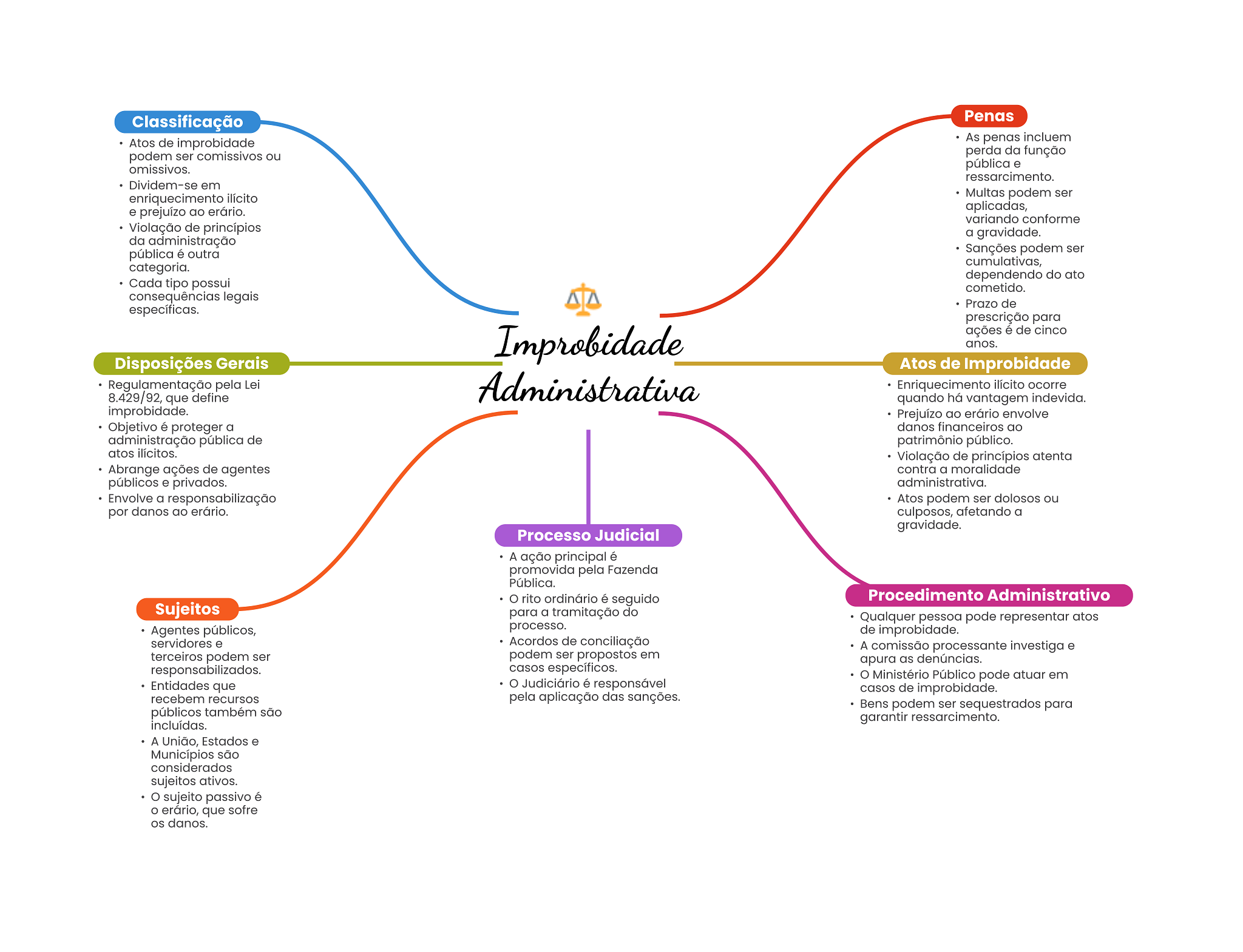 Classificação Penas Atos de improbidade As penas incluem podem ser comissivos ou perda da função omissivos. pública e ressarcimento. Dividem-se em enriquecimento ilícito Multas podem ser e prejuízo ao erário. aplicadas, variando conforme Violação de princípios a gravidade. da administração pública é outra Sanções podem ser categoria. cumulativas, dependendo do ato Cada tipo possui cometido. consequências legais Prazo de específicas. prescrição para Improbidade ações é de cinco anos. Disposições Gerais Atos de Improbidade Regulamentação pela Lei 8.429/92, que define Administrativa Enriquecimento ilícito ocorre quando há vantagem indevida. improbidade. Prejuízo ao erário envolve Objetivo é proteger a danos financeiros ao administração pública de patrimônio público. atos ilícitos. Violação de princípios atenta Abrange ações de agentes contra a moralidade públicos e privados. administrativa. Envolve a responsabilização Atos podem ser dolosos ou por danos ao erário. culposos, afetando a gravidade. Processo Judicial A ação principal é promovida pela Fazenda Pública. rito ordinário é seguido Procedimento Administrativo Sujeitos para a tramitação do Qualquer pessoa pode representar atos Agentes públicos, processo. de improbidade. servidores e Acordos de conciliação A comissão processante investiga e terceiros podem ser podem ser propostos em apura as denúncias. responsabilizados. casos específicos. Ministério Público pode atuar em Entidades que Judiciário é responsável casos de improbidade. recebem recursos pela aplicação das sanções. Bens podem ser sequestrados para públicos também são garantir ressarcimento. incluídas. A União, Estados e Municípios são considerados sujeitos ativos. sujeito passivo é O erário, que sofre danos.