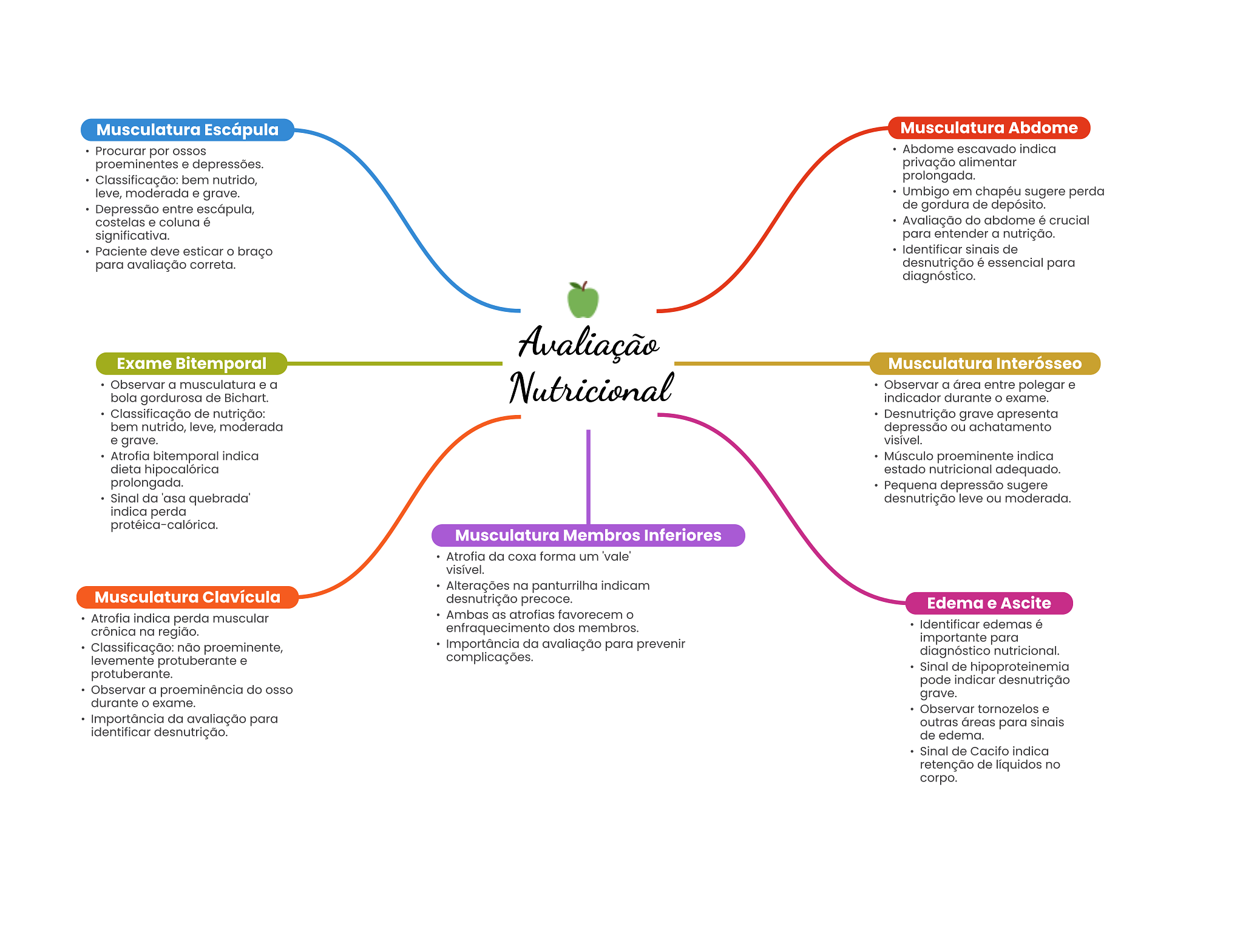 Musculatura Escápula Musculatura Abdome Procurar por Abdome escavado indica proeminentes e depressões. privação alimentar Classificação: bem nutrido, prolongada. leve, moderada e grave. Umbigo em chapéu sugere perda Depressão entre escápula, de gordura de depósito. costelas e coluna é Avaliação do abdome é crucial significativa. para entender a nutrição. Paciente deve esticar braço Identificar sinais de para avaliação correta. desnutrição é essencial para diagnóstico. Avaliação Exame Bitemporal Musculatura Interósseo Observar a musculatura e a Nutricional Observar a área entre polegar e bola gordurosa de Bichart. indicador durante exame. Classificação de nutrição: Desnutrição grave apresenta bem nutrido, leve, moderada depressão ou achatamento e grave. visível. Atrofia bitemporal indica Músculo proeminente indica dieta hipocalórica estado nutricional adequado. prolongada. Pequena depressão sugere Sinal da 'asa desnutrição leve ou moderada. indica perda protéica-calórica. Musculatura Membros Inferiores Atrofia da coxa forma um 'vale' visível. Alterações na panturrilha indicam Musculatura Clavícula desnutrição precoce. Edema e Ascite Atrofia indica perda muscular Ambas as atrofias favorecem crônica na região. enfraquecimento dos membros. Identificar edemas é Classificação: não proeminente, Importância da avaliação para prevenir importante para complicações. diagnóstico nutricional. levemente protuberante e Sinal de hipoproteinemia protuberante. pode indicar desnutrição Observar a proeminência do grave. durante exame. Observar tornozelos e Importância da avaliação para outras áreas para sinais identificar desnutrição. de edema. Sinal de Cacifo indica retenção de líquidos no corpo.