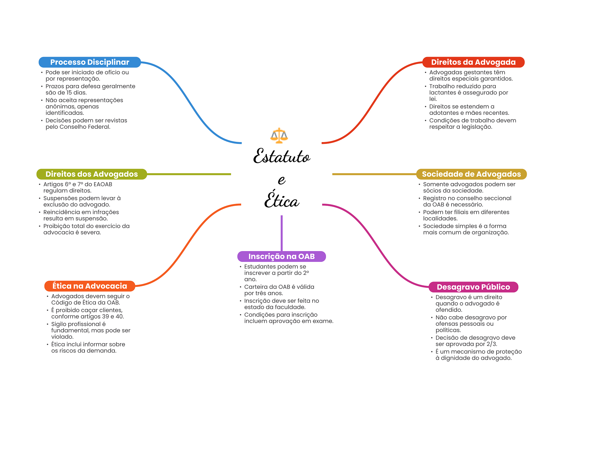 Processo Disciplinar Direitos da Advogada Pode ser iniciado de ofício ou Advogadas gestantes têm por representação. direitos especiais garantidos. Prazos para defesa geralmente Trabalho reduzido para são de 15 dias. lactantes é assegurado por Não aceita representações lei. anônimas, apenas Direitos se estendem a identificadas. adotantes e mães recentes. Decisões podem ser revistas Condições de trabalho devem pelo Conselho Federal. respeitar a legislação. Estatuto Direitos dos Advogados Sociedade de Advogados Artigos 6° e 7° do EAOAB e Somente advogados podem ser regulam direitos. sócios da sociedade. Suspensões podem levar à exclusão do advogado. Ética Registro no conselho seccional da OAB é necessário. Reincidência em infrações Podem ter filiais em diferentes resulta em suspensão. localidades. Proibição total do exercício da Sociedade simples é a forma advocacia é severa. mais comum de organização. Inscrição na OAB Estudantes podem se inscrever a partir do 2° ano. Ética na Advocacia Carteira da OAB é válida Desagravo Público Advogados devem seguir por três anos. Desagravo é um direito Código de Ética da OAB. Inscrição deve ser feita no estado da faculdade. quando advogado é É proibido caçar clientes, ofendido. conforme artigos 39 e 40. Condições para inscrição Não cabe desagravo por Sigilo profissional é incluem aprovação em exame. ofensas pessoais ou fundamental, mas pode ser políticas. violado. Decisão de desagravo deve Ética inclui informar sobre ser aprovada por 2/3. riscos da demanda. É um mecanismo de proteção à dignidade do advogado.