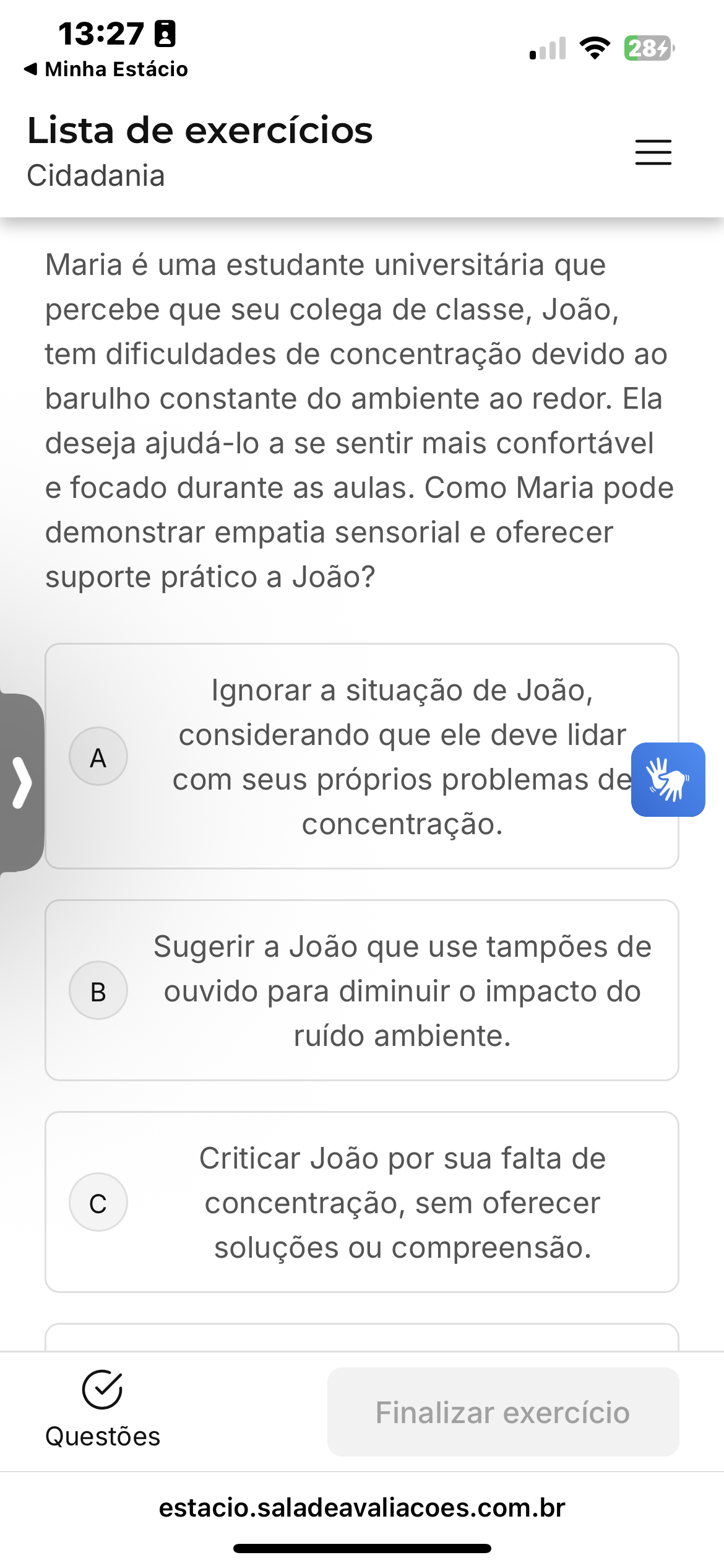 13:27 284 Minha Estácio Lista de exercícios Cidadania Maria é uma estudante universitária que percebe que seu colega de classe, João, tem dificuldades de concentração devido ao barulho constante do ambiente ao redor. Ela deseja ajudá-lo a se sentir mais confortável e focado durante as aulas. Como Maria pode demonstrar empatia sensorial e oferecer suporte prático a João? Ignorar a situação de João, considerando que ele deve lidar A com seus próprios problemas de concentração. Sugerir a João que use tampões de ouvido para diminuir impacto do ruído ambiente. Criticar João por sua falta de c concentração, sem oferecer soluções ou compreensão. Finalizar exercício Questões estacio.saladeavaliacoes.com.br