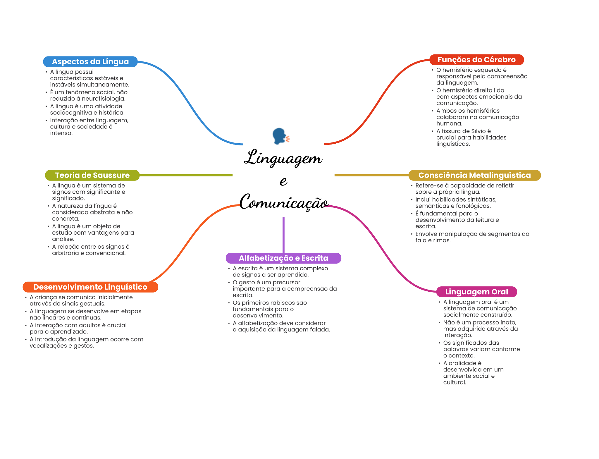 Aspectos da Língua Funções do Cérebro A língua possui hemisfério esquerdo é características estáveis e responsável pela compreensão instáveis da linguagem. É um fenômeno social, não hemisfério direito lida reduzido à neurofisiologia. com aspectos emocionais da A língua é uma atividade comunicação. sociocognitiva e histórica. Ambos hemisférios Interação entre linguagem, colaboram na comunicação humana. cultura e sociedade é intensa. A fissura de Sílvio é crucial para habilidades linguísticas. Linguagem Teoria de Saussure Consciência Metalinguística A língua é um sistema de e Refere-se à capacidade de refletir signos com significante e sobre a própria língua. significado. A natureza da língua é Comunicação Inclui habilidades sintáticas, semânticas e fonológicas. considerada abstrata e não É fundamental para concreta. desenvolvimento da leitura e A língua é um objeto de escrita. estudo com vantagens para Envolve manipulação de segmentos da análise. fala e rimas. A relação entre signos é arbitrária e convencional. Alfabetização e Escrita A escrita é um sistema complexo de signos a ser aprendido. gesto é um precursor Desenvolvimento Linguístico importante para a compreensão da A criança se comunica inicialmente escrita. Linguagem Oral através de sinais gestuais. Os primeiros rabiscos são A linguagem oral é um A linguagem se desenvolve em etapas fundamentais para sistema de comunicação não lineares e contínuas. desenvolvimento. socialmente construído. A interação com adultos é crucial A alfabetização deve considerar Não é um processo inato, para aprendizado. a aquisição da linguagem falada. mas adquirido através da interação. A introdução da linguagem ocorre com vocalizações e gestos. Os significados das palavras variam conforme contexto. A oralidade é desenvolvida em um ambiente social e cultural.