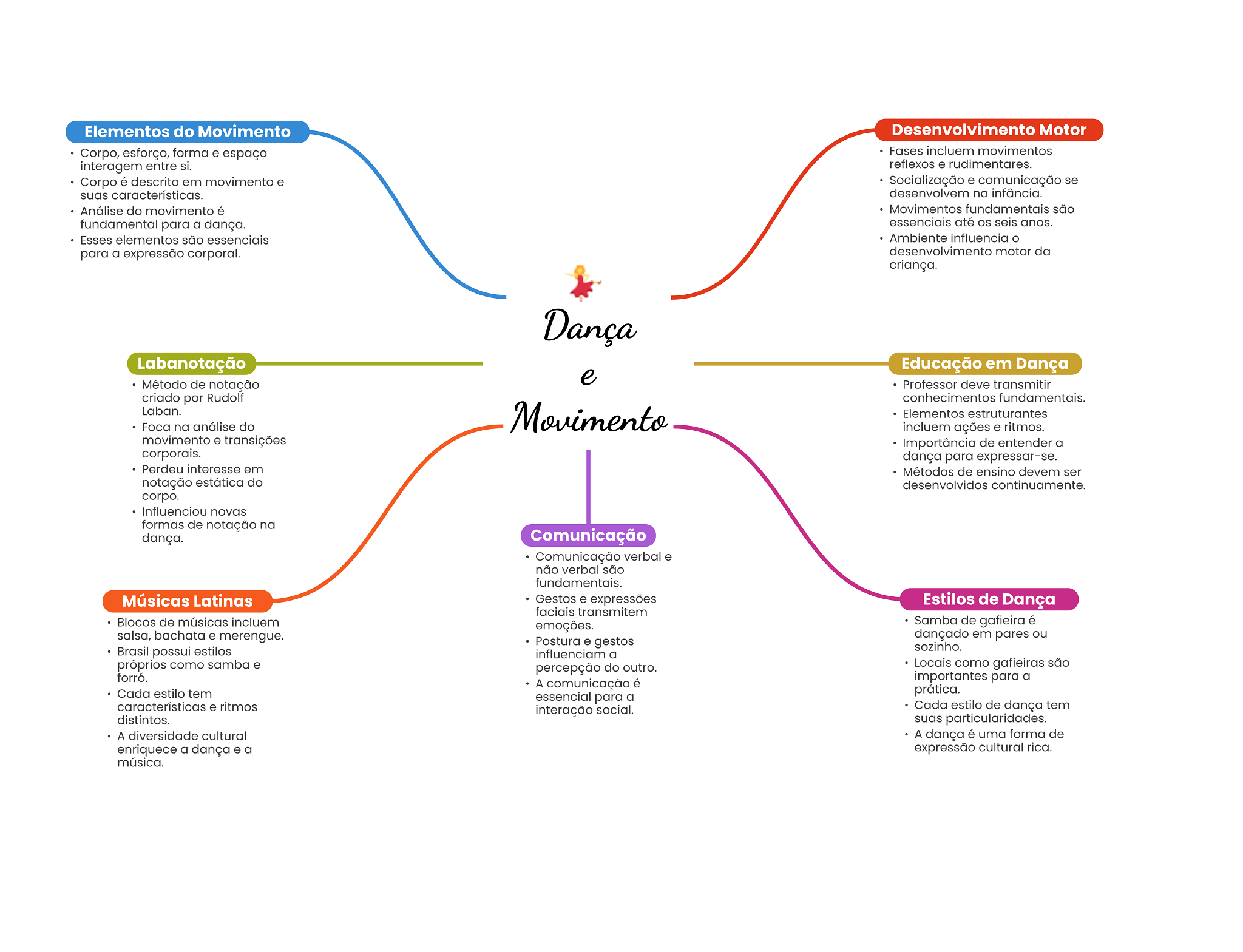 Elementos do Movimento Desenvolvimento Motor Corpo, esforço, forma e espaço Fases incluem movimentos interagem entre si. reflexos e rudimentares. Corpo é descrito em movimento e Socialização e comunicação se suas características. desenvolvem na infância. Análise do movimento é Movimentos fundamentais são fundamental para a dança. essenciais até seis anos. Esses elementos são essenciais Ambiente influencia para a expressão corporal. desenvolvimento motor da criança. Dança Labanotação Educação em Dança e Método de notação Professor deve transmitir criado por Rudolf conhecimentos fundamentais. Laban. Movimento Elementos estruturantes Foca na análise do incluem ações e ritmos. movimento e transições Importância de entender a corporais. dança para expressar-se. Perdeu interesse em Métodos de ensino devem ser notação estática do desenvolvidos continuamente. corpo. Influenciou novas formas de notação na dança. Comunicação Comunicação verbal e não verbal são fundamentais. Músicas Latinas Gestos e expressões Estilos de Dança faciais transmitem Blocos de músicas incluem emoções. Samba de gafieira é salsa, bachata e merengue. dançado em pares ou Postura e gestos Brasil possui estilos sozinho. influenciam a próprios como samba e percepção do outro. Locais como gafieiras são forró. importantes para a A comunicação é Cada estilo tem prática. essencial para a características e ritmos interação social. Cada estilo de dança tem distintos. suas particularidades. A diversidade cultural A dança é uma forma de enriquece a dança e a expressão cultural rica. música.