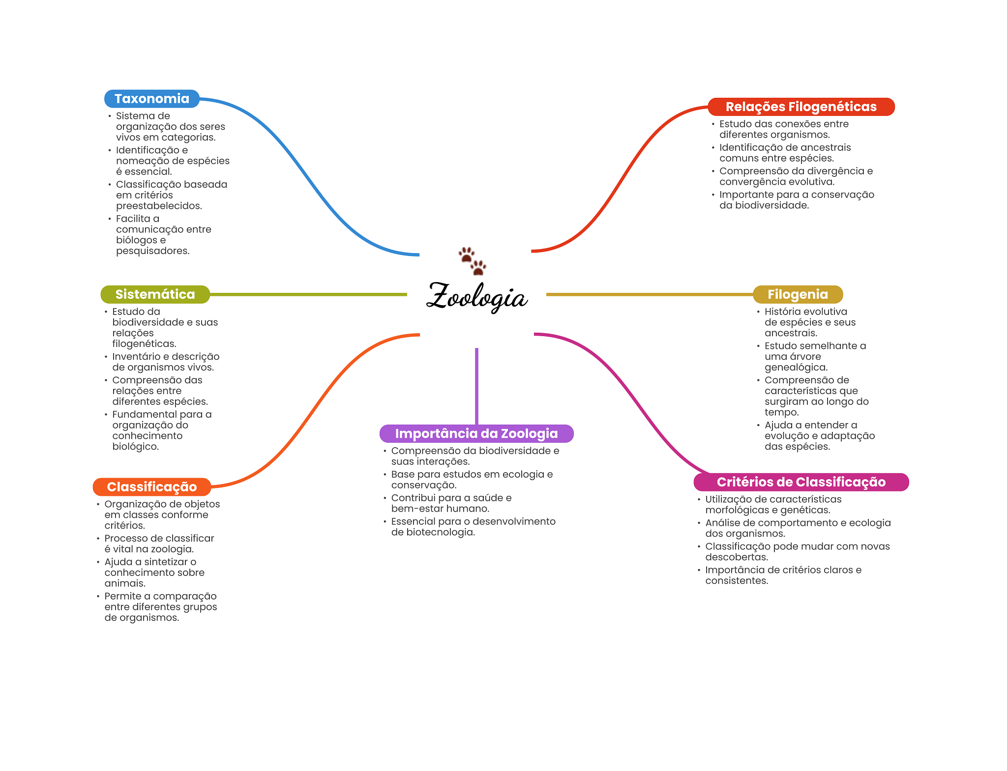 Taxonomia Relações Filogenéticas Sistema de organização dos seres Estudo das conexões entre vivos em categorias. diferentes organismos. Identificação e Identificação de ancestrais nomeação de espécies comuns entre espécies. é essencial. Compreensão da divergência e Classificação baseada convergência evolutiva. em critérios Importante para a conservação preestabelecidos. da biodiversidade. Facilita a comunicação entre biólogos e pesquisadores. Sistemática Zoologia Filogenia Estudo da História evolutiva biodiversidade e suas de espécies e seus relações ancestrais. filogenéticas. Estudo semelhante a Inventário e descrição uma árvore de organismos vivos. genealógica. Compreensão das Compreensão de relações entre características que diferentes espécies. surgiram ao longo do Fundamental para a tempo. organização do Ajuda a entender a conhecimento Importância da Zoologia evolução e adaptação biológico. Compreensão da biodiversidade e das espécies. suas interações. Base para estudos em ecologia e Classificação conservação. Critérios de Classificação Contribui para a saúde e Organização de objetos Utilização de características bem-estar humano. em classes conforme morfológicas e genéticas. critérios. Essencial para desenvolvimento Análise de comportamento e ecologia Processo de classificar de biotecnologia. dos organismos. é vital na zoologia. Classificação pode mudar com novas descobertas. Ajuda a sintetizar conhecimento sobre Importância de critérios claros e animais. consistentes. Permite a comparação entre diferentes grupos de organismos.