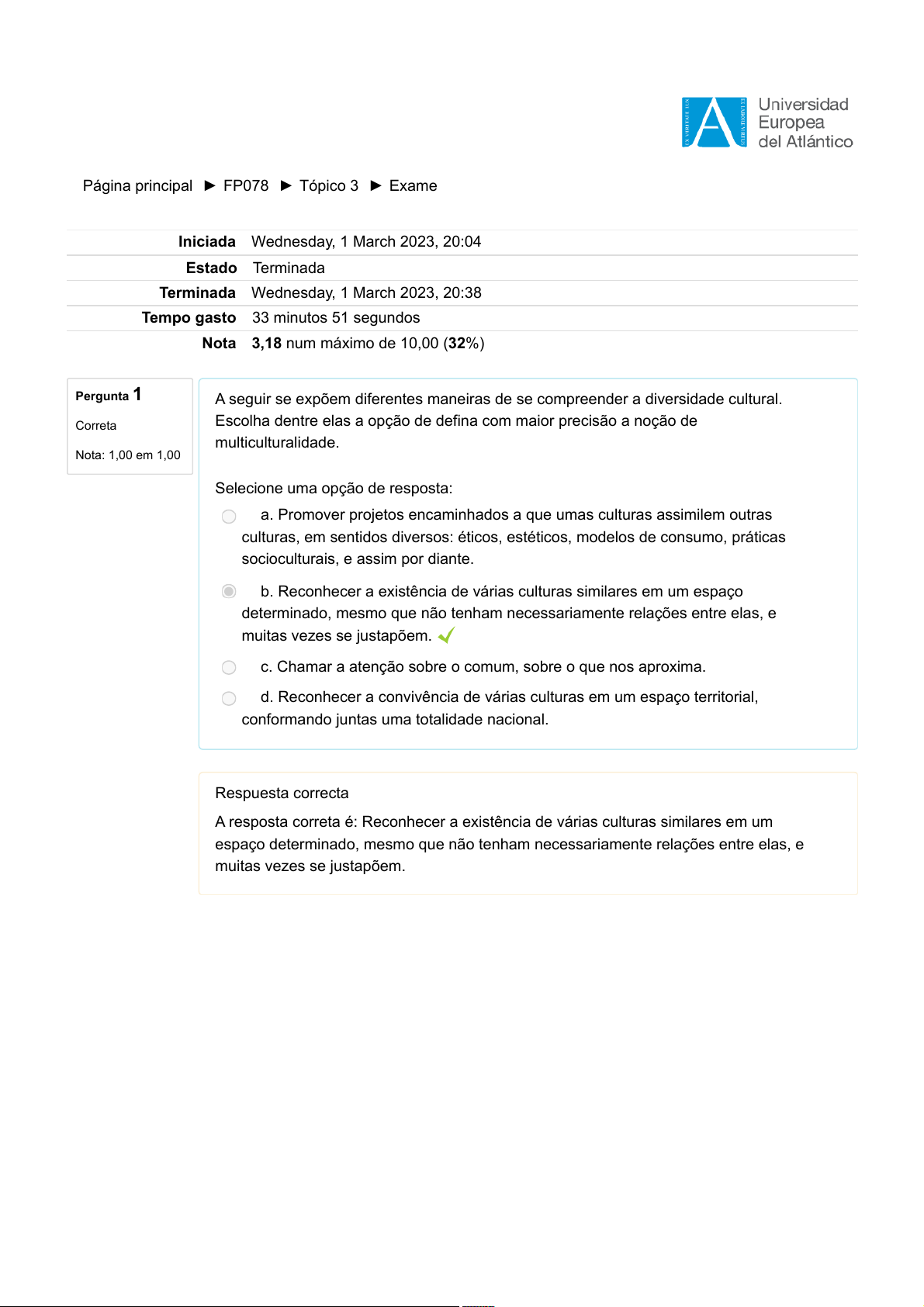 Impresso por Fabiano Correas, E-mail fabiano.correas@gmail.com para uso pessoal e privado. Este material pode ser protegido por direitos autorais e não pode ser reproduzido ou repassado para terceiros. 06/10/2025, 10:41:38 Página principal ► FP078 ► Tópico 3 ► Exame Pergunta 1 Correta Nota: 1,00 em 1,00 Iniciada Wednesday, 1 March 2023, 20:04 Estado Terminada Terminada Wednesday, 1 March 2023, 20:38 Tempo gasto 33 minutos 51 segundos Nota 3,18 num máximo de 10,00 (32%) A seguir se expõem diferentes maneiras de se compreender a diversidade cultural. Escolha dentre elas a opção de defina com maior precisão a noção de multiculturalidade. Selecione uma opção de resposta: a. Promover projetos encaminhados a que umas culturas assimilem outras culturas, em sentidos diversos: éticos, estéticos, modelos de consumo, práticas socioculturais, e assim por diante. b. Reconhecer a existência de várias culturas similares em um espaço determinado, mesmo que não tenham necessariamente relações entre elas, e muitas vezes se justapõem. c. Chamar a atenção sobre o comum, sobre o que nos aproxima. d. Reconhecer a convivência de várias culturas em um espaço territorial, conformando juntas uma totalidade nacional. Respuesta correcta A resposta correta é: Reconhecer a existência de várias culturas similares em um espaço determinado, mesmo que não tenham necessariamente relações entre elas, e muitas vezes se justapõem. Impresso por Fabiano Correas, E-mail fabiano.correas@gmail.com para uso pessoal e privado. Este material pode ser protegido por direitos autorais e não pode ser reproduzido ou repassado para terceiros. 06/10/2025, 10:41:38 Pergunta 2 Incorreta Nota: 0,00 em 1,00 Pergunta 3 Incorreta Nota: 0,00 em 1,00 A seguir se expõem alguns critérios que informam de uma valoração crítica à compreensão da diversidade cultural que aporta a interculturalidade. Escolha dentre elas uma opção que expresse alguma das valorações realizadas em relação ao interculturalidade. Selecione uma opção de resposta: a. Promove a transformação da ordem social como resposta às formas coloniais de poder. b. Supõe uma diversidade que se expressa de forma radical, como separatismos ou etnocentrismos e, de maneira liberal, em atitudes de aceitação e tolerância. c. Não questiona como é que opera a colonialidade. d. É uma ferramenta política para a manutenção da situação de dominação. Respuesta incorrecta. A resposta correta é: Promove a transformação da ordem social como resposta às formas coloniais de poder. Dos seguintes postulados defendidos por diversos autores em relação às condições que deve cumprir o discurso intercultural numa educação intercultural, escolha qual NÃO é correto: Selecione uma opção de resposta: a. Tem que abranger as estruturas e processos intergrupais de constituição, diferenciação e integração das sociedades contemporâneas. b. Deve assumir como ponto de partida as 'políticas de identidade' que caracterizam às pessoas dos diferentes grupos e os seus respectivos sistemas educacionais. c. Deve pôr em diálogo as dimensões tanto teóricas como práticas, prescritivas como descritivas do discurso intercultural. d. Deve analisar as diferentes propostas interculturais desde uma perspectiva pedagógica, de modo a cuidar os interesses dos contextos educativos. Respuesta incorrecta. A resposta correta é: Deve analisar as diferentes propostas interculturais desde uma perspectiva pedagógica, de modo a cuidar os interesses dos contextos educativos. Impresso por Fabiano Correas, E-mail fabiano.correas@gmail.com para uso pessoal e privado. Este material pode ser protegido por direitos autorais e não pode ser reproduzido ou repassado para terceiros. 06/10/2025, 10:41:38 Pergunta 4 Incorreta Nota: 0,00 em 1,00 Relacione um elemento da coluna da direita com outro da esquerda. Só há uma opção correta. - As identidades resultantes da pertença simultânea a mais de um grupo, de participar de mais do que uma 'subcultura', não são levadas em consideração. - As identidades se constituem num processo de múltiplas tensões entre homogeneização e diversidade cultural, e entre os saberes locais e os universais. - As identidades de se constituem a partir de enfoques muito diversos, desde a assimilação até o pluralismo cultural. Respuesta incorrecta. A resposta correcta é: - As identidades resultantes da pertença simultânea a mais de um grupo, de participar de mais do que uma 'subcultura', não são levadas em consideração. → Estados Unidos, - As identidades se constituem num processo de múltiplas tensões entre homogeneização e diversidade cultural, e entre os saberes locais e os universais. → África, - As identidades de se constituem a partir de enfoques muito diversos, desde a assimilação até o pluralismo cultural. → Europa Impresso por Fabiano Correas, E-mail fabiano.correas@gmail.com para uso pessoal e privado. Este material pode ser protegido por direitos autorais e não pode ser reproduzido ou repassado para terceiros. 06/10/2025, 10:41:38 Pergunta 5 Parcialmente correta Nota: 0,60 em 1,00 As afirmações seguintes são consideradas particularidades dos modelos da educação intercultural. Indique verdadeiro (V) ou falso (F): - No modelo tecnológico, o objetivo da educação intercultural é o de compensar os déficits das culturas distintas à maioritária. - O modelo hermenêutico promove a aquisição de destrezas nos estudantes, sob a orientação de especialistas. - O modelo hermenêutico é assimilacionista. - Os modelo básicos que tem orientado as práticas de educação intercultural tem sido construídos sob os grandes referentes de produção de conhecimento, e articulam-se com distintas teorias que vão além da educação. - A incerteza, como condição dos modelos educativos e sociais em geral, não é compatível com um modelo tecnológico determinista. Respuesta parcialmente correcta.