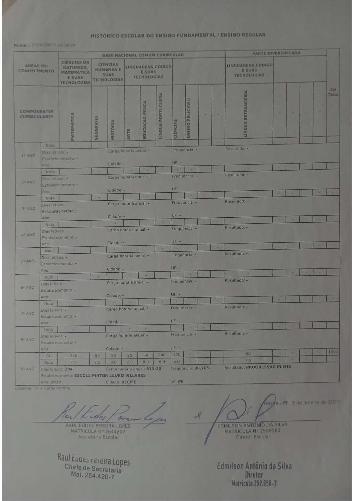 HISTORICO ESCOLAR DO ENSINO FUNDAMENTAL / ENSINO REGULAR Nome: EDSON BRITO DA SILVA BASE NACIONAL COMUM CURRICULAR PARTE DIVERSIFICADA CIÊNCIAS DA AREAS DO LINGUAGENS, CONHECIMENTO HUMANAS E E SUAS E SUAS MATEMATICA SUAS E SUAS TECNOLOGIAS TECNOLOGIAS TECNOLOGIAS TECNOLOGIAS CH Total COMPONENTES CURRICULARES MATEMÁTICA GEOGRAFIA HISTÓRIA EDUCAÇÃO FISICA PORTUGUESA ENSINO RELIGIOSO ESTRANGEIRA ARTE - Nota Carga horária anual: Frequência Resultado: Dias letivos: Estabelecimento: Ano: Cidade UF - - Nota Carga horaria anual: Frequência Resultado: Dias letivos: ANO Estabelecimento: Cidade: UF - Ano: - - Nota Carga horária anual: Frequência: - Resultado: Dias letivos: ANO Estabelecimento: Cidade UF Ano: - Nota - Carga horária - - Resultado: Dias letivos: ANO Estabelecimento: Ano Cidade UF - - - Nota Dias letivos: Carga horária Frequência: Resultado: ANO Estabelecimento: Ano Cidade: UF Nota Resultado: Dias letivos: Carga horária anual: ANO Estabelecimento: Ano: Cidade UF - Nota Dias letivos: Frequência: Resultado: Carga horaria anual: ANO Estabelecimento: Cidade UF Ano Nota Dias letivos: Carga horária anual Resultado: ANO Estabelecimento: Ano Cidade UF 1000 CH 240 80 80 80 80 240 120 Nota 7,5 8,0 7,0 7,5 ANO Dias letivos: 204 Carga horária anual 833:20 Frequência: 89,70% Resultado: PROGRESSÃO PLENA Estabelecimento: ESCOLA PINTOR LAURO VILLARES 2019 RECIFE UF PE CH Carga Recife 9 de Janeiro de 2023 RAUL EUDES PEREIRA LOPES EDMILSON ANTÓNIO DA SILVA MATRICULA 2644207 MATRICULA 2598582 Secretário Escolar Diretor Escolar Raul Lopes Chefe de Secretaria Edmilson Antônio da Silva Mat. 264.420-7 Diretor 259.858-2