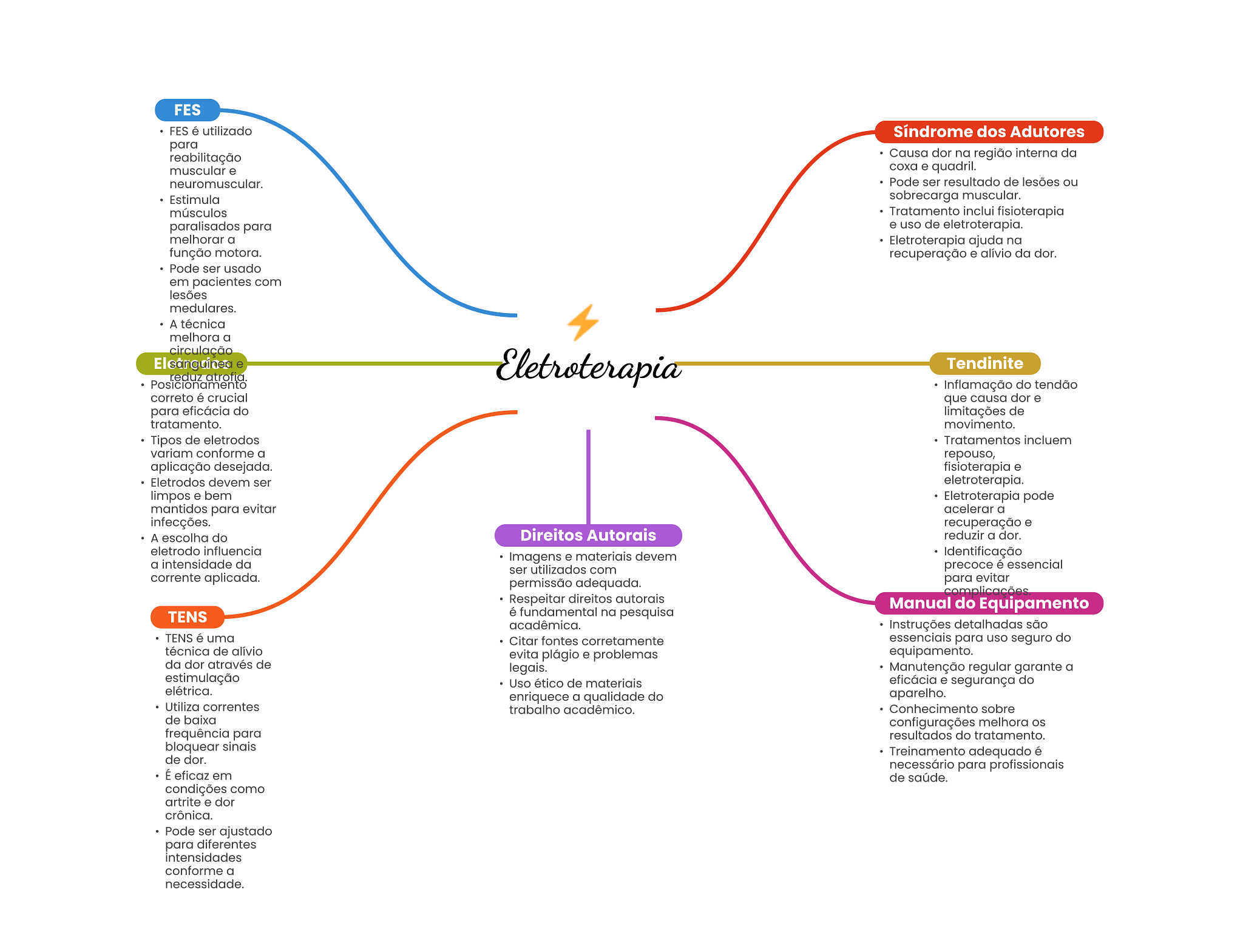 FES FES é utilizado Síndrome dos Adutores para reabilitação Causa dor na região interna da muscular e coxa e quadril. neuromuscular. Pode ser resultado de lesões ou Estimula sobrecarga muscular. músculos Tratamento inclui fisioterapia paralisados para e uso de eletroterapia. melhorar a Eletroterapia ajuda na função motora. recuperação e alívio da dor. Pode ser usado em pacientes com lesões medulares. A técnica melhora a circulação e Eletroterapia Tendinite r.eduz atrofia. Posicionamento Inflamação do tendão correto é crucial que causa dor e para eficácia do limitações de tratamento. movimento. Tipos de eletrodos Tratamentos incluem variam conforme a repouso, aplicação desejada. fisioterapia e Eletrodos devem ser eletroterapia. limpos e bem Eletroterapia pode mantidos para evitar acelerar a infecções. recuperação e A escolha do Direitos Autorais reduzir a dor. eletrodo influencia Imagens e materiais devem Identificação a intensidade da ser utilizados com precoce é essencial corrente aplicada. permissão adequada. para evitar complicações Respeitar direitos autorais Manual do Equipamento TENS é fundamental na pesquisa acadêmica. Instruções detalhadas são TENS é uma Citar fontes corretamente essenciais para uso seguro do técnica de alívio evita plágio e problemas equipamento. da dor através de legais. Manutenção regular garante a estimulação Uso ético de materiais eficácia e segurança do elétrica. enriquece a qualidade do aparelho. Utiliza correntes trabalho acadêmico. Conhecimento sobre de baixa configurações melhora frequência para resultados do tratamento. bloquear sinais Treinamento adequado é de dor. necessário para profissionais É eficaz em de saúde. condições como artrite e dor crônica. Pode ser ajustado para diferentes intensidades conforme a necessidade.