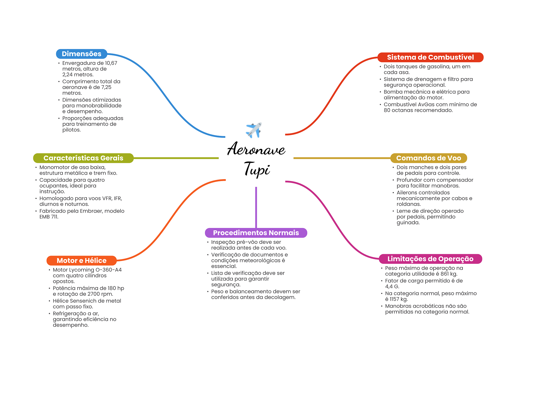Dimensões Sistema de Combustível Envergadura de 10,67 metros, altura de Dois tanques de gasolina, um em 2,24 metros. cada asa. Comprimento total da Sistema de drenagem e filtro para aeronave é de 7,25 segurança operacional. metros. Bomba mecânica e elétrica para Dimensões otimizadas alimentação do motor. para manobrabilidade Combustível AvGas com mínimo de e desempenho. 80 octanas recomendado. Proporções adequadas para treinamento de pilotos. Aeronave Características Gerais Comandos de Voo Monomotor de asa baixa, Tupi Dois manches e dois pares estrutura metálica e trem fixo. de pedais para controle. Capacidade para quatro Profundor com compensador ocupantes, ideal para para facilitar manobras. instrução. Ailerons controlados Homologado para VFR, IFR, mecanicamente por cabos e diurnos e noturnos. roldanas. Fabricado pela Embraer, modelo Leme de direção operado EMB 711. por pedais, permitindo guinada. Procedimentos Normais Inspeção pré-vôo deve ser realizada antes de cada VOO. Verificação de documentos e Motor e Hélice condições meteorológicas é Limitações de Operação essencial. Motor Lycoming O-360-A4 Peso máximo de operação na com quatro cilindros Lista de verificação deve ser categoria utilidade é 861 kg. opostos. utilizada para garantir Fator de carga permitido é de segurança. Potência máxima de 180 hp 4,4 G. Peso e balanceamento devem ser e rotação de 2700 rpm. Na categoria normal, peso máximo conferidos antes da decolagem. Hélice Sensenich de metal é 1157 kg. com passo fixo. Manobras acrobáticas não são Refrigeração a ar, permitidas na categoria normal. garantindo eficiência no desempenho.