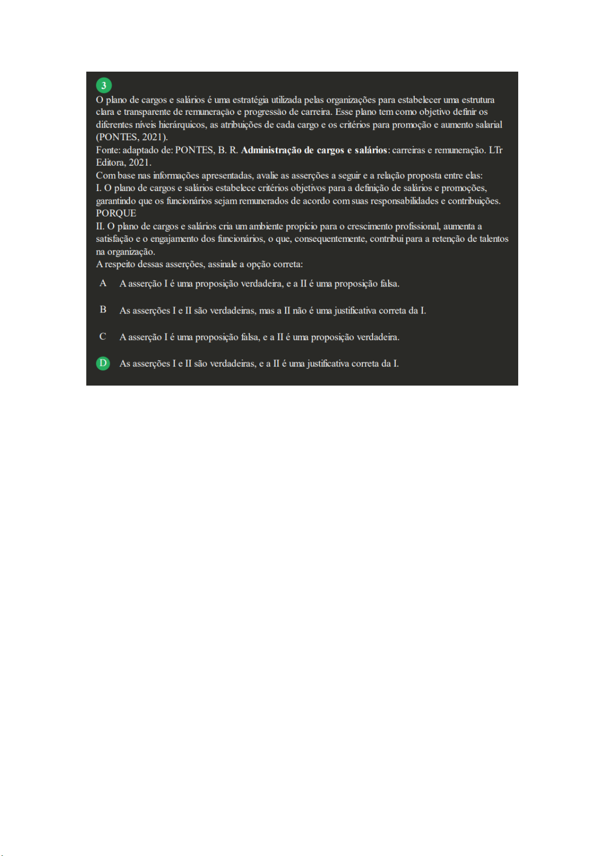 3 plano de cargos e salários é uma estratégia utilizada pelas organizações para estabelecer uma estrutura clara e transparente de remuneração e progressão de carreira. Esse plano tem como objetivo definir os diferentes níveis hierárquicos, as atribuições de cada cargo e os critérios para promoção e aumento salarial (PONTES, 2021). Fonte: adaptado de: PONTES, B. R. Administração de cargos e salários: carreiras e remuneração. LTr Editora, 2021. Com base nas informações apresentadas, avalie as asserções a seguir e a relação proposta entre elas: I. plano de cargos e salários estabelece critérios objetivos para a definição de salários e promoções, garantindo que os funcionários sejam remunerados de acordo com suas responsabilidades e contribuições. PORQUE II. plano de cargos e salários cria um ambiente propício para o crescimento profissional, aumenta a satisfação e o engajamento dos funcionários, o que, consequentemente, contribui para a retenção de talentos na organização. A respeito dessas asserções, assinale a opção correta: A A asserção I é uma proposição verdadeira, e a II é uma proposição falsa. As asserções I e II são verdadeiras, mas a II não é uma justificativa correta da I. C A asserção I é uma proposição falsa, e a II é uma proposição verdadeira. D As asserções I e II são verdadeiras, e a II é uma justificativa correta da I.