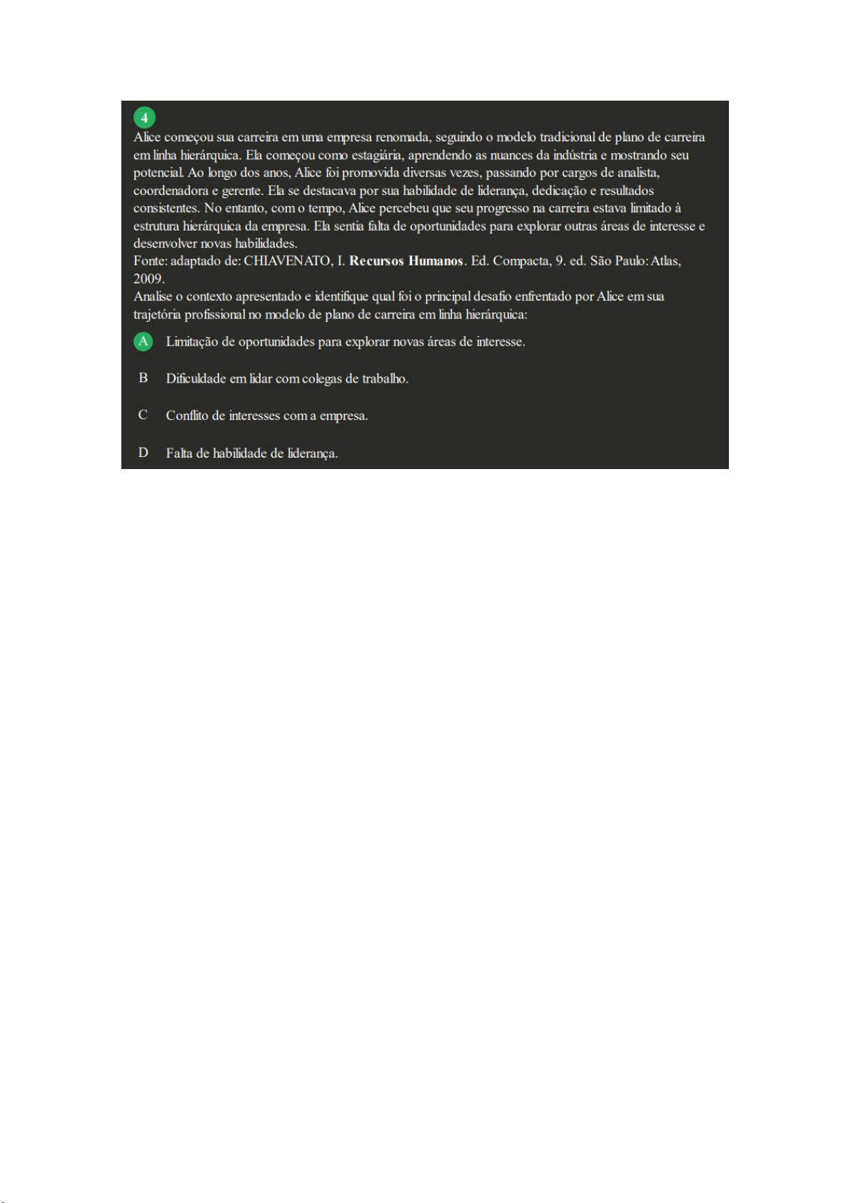 4 Alice começou sua carreira em uma empresa renomada, seguindo o modelo tradicional de plano de carreira em linha hierárquica. Ela começou como estagiária, aprendendo as nuances da indústria e mostrando seu potencial. Ao longo dos anos, Alice foi promovida diversas vezes, passando por cargos de analista, coordenadora e gerente. Ela se destacava por sua habilidade de liderança, dedicação e resultados consistentes. No entanto, com o tempo, Alice percebeu que seu progresso na carreira estava limitado à estrutura hierárquica da empresa. Ela sentia falta de oportunidades para explorar outras áreas de interesse e desenvolver novas habilidades. Fonte: adaptado de: CHIAVENATO, I. Recursos Humanos. Ed. Compacta, 9. ed. São Paulo: Atlas, 2009. Analise o contexto apresentado e identifique qual foi o principal desafio enfrentado por Alice em sua trajetória profissional no modelo de plano de carreira em linha hierárquica: A Limitação de oportunidades para explorar novas áreas de interesse. Dificuldade em lidar com colegas de trabalho. C Conflito de interesses com a empresa. D Falta de habilidade de liderança.