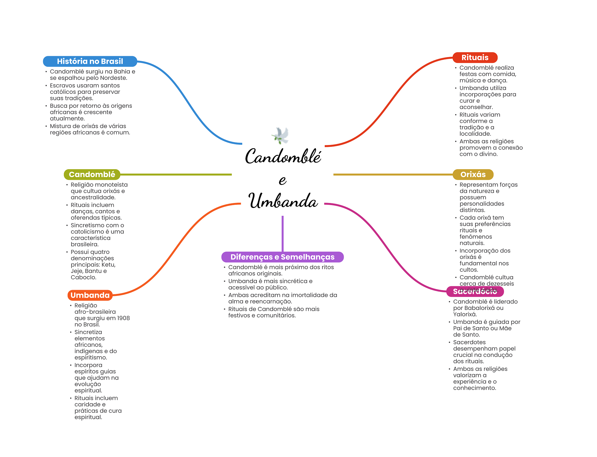 História no Brasil Rituais Candomblé realiza Candomblé surgiu na Bahia e festas com comida, se espalhou pelo Nordeste. música e dança. Escravos usaram santos Umbanda utiliza católicos para preservar incorporações para suas tradições. curar e Busca por retorno às origens aconselhar. africanas é crescente Rituais variam atualmente. conforme a Mistura de orixás de várias tradição e a regiões africanas é comum. localidade. Ambas as religiões promovem a conexão Candomblé com divino. Candomblé Orixás Religião monoteísta e Representam forças que cultua orixás e da natureza e ancestralidade. Umbanda possuem Rituais incluem personalidades danças, cantos e distintas. oferendas típicas. Cada orixá tem Sincretismo com O suas preferências catolicismo é uma rituais e característica fenômenos brasileira. naturais. Possui quatro Incorporação dos denominações Diferenças e Semelhanças orixás é principais: Ketu, fundamental nos Candomblé é mais próximo dos ritos Jeje, Bantu e cultos. africanos originais. Caboclo. Candomblé cultua Umbanda é mais sincrética e cerca de dezesseis acessível ao público. Umbanda Ambas acreditam na imortalidade da alma e reencarnação. Candomblé é liderado Religião afro-brasileira Rituais de Candomblé são mais por Babalorixá ou festivos e comunitários. Yalorixá. que surgiu em 1908 no Brasil. Umbanda é guiada por Pai de Santo ou Mãe Sincretiza de Santo. elementos africanos, Sacerdotes indígenas e do desempenham papel espiritismo. crucial na condução dos rituais. Incorpora espíritos guias Ambas as religiões que ajudam na valorizam a evolução experiência e espiritual. conhecimento. Rituais incluem caridade e práticas de cura espiritual.