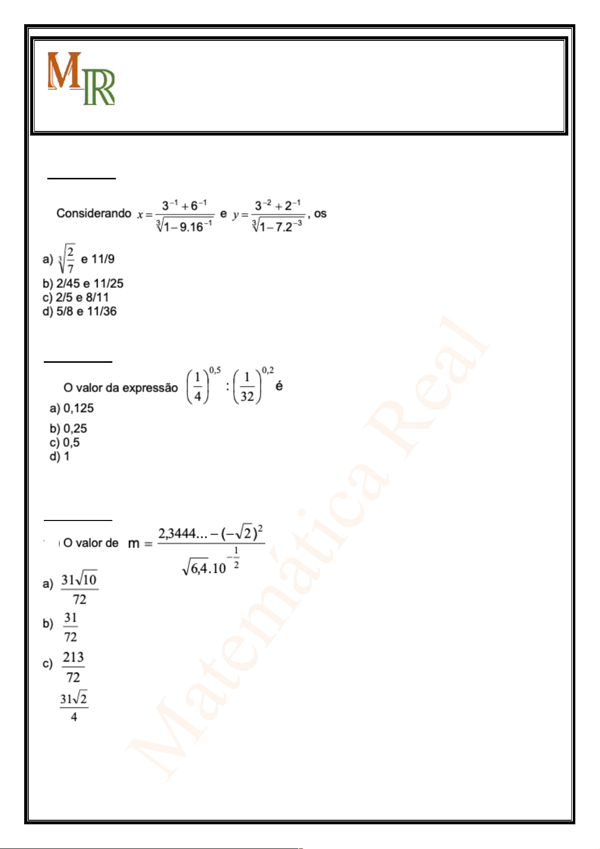 MATEMÁTICA REAL Questão 1 Questão 2 Questão 3 M ate máti ca R ea l marcelo siqueira da silva CANCELADA Questão 4 Questão 5 Questão 6 M ate máti ca R ea l Questão 7 a) b) c) d) M ate máti ca R ea l Respostas 1 – a 2 – d 3 - b 4 – c 5 – d 6 – e 7 a) ! " b) "# %&& 𝑜𝑢 0,53 c) 7 d) %! # Questão 9 M ate máti ca R ea l Questão 10 Questão 11 Questão 12 Questão 13 Questão 14 Questão 15 Questão 16 Questão 17 Questão 1 Questão 2 Questão 3 Questão 18 Questão 4 Questão 5 Questão 6 Questão 7 Questão 8 Questão 9 Questão 10 Questão 11 Questão 12 Questão 13 Questão 14 Questão 15 Questão 16 Questão 17 Questão 15