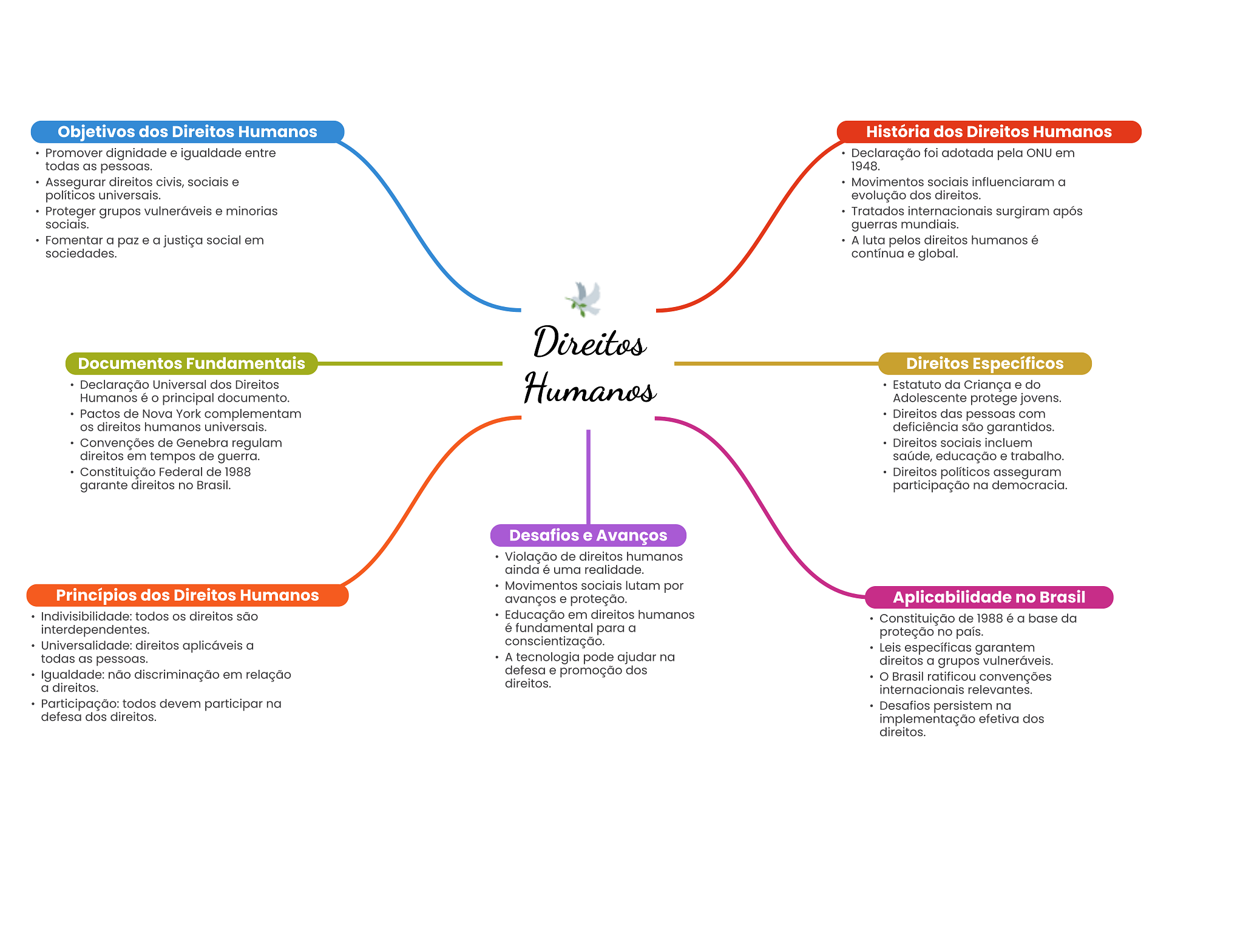 Objetivos dos Direitos Humanos História dos Direitos Humanos Promover dignidade e igualdade entre Declaração foi adotada pela ONU em todas as pessoas. 1948. Assegurar direitos civis, sociais e Movimentos sociais influenciaram a políticos universais. evolução dos direitos. Proteger grupos vulneráveis e minorias Tratados internacionais surgiram após sociais. guerras mundiais. Fomentar a paz e a justiça social em A luta pelos direitos humanos é sociedades. contínua e global. Direitos Documentos Fundamentais Direitos Específicos Declaração Universal dos Direitos Humanos Estatuto da Criança e do Humanos é O principal documento. Adolescente protege jovens. Pactos de Nova York complementam Direitos das pessoas com direitos humanos universais. deficiência são garantidos. Convenções de Genebra regulam Direitos sociais incluem direitos em tempos de guerra. saúde, educação e trabalho. Constituição Federal de 1988 Direitos políticos asseguram garante direitos no Brasil. participação na democracia. Desafios e Avanços Violação de direitos humanos ainda é uma realidade. Movimentos sociais lutam por Princípios dos Direitos Humanos avanços e proteção. Aplicabilidade no Brasil Indivisibilidade: todos os direitos são Educação em direitos humanos Constituição de 1988 é a base da interdependentes. é fundamental para a proteção no país. Universalidade: direitos aplicáveis a conscientização. Leis específicas garantem todas as pessoas. A tecnologia pode ajudar na direitos a grupos vulneráveis. Igualdade: não discriminação em relação defesa e promoção dos direitos. O Brasil ratificou convenções a direitos. internacionais relevantes. Participação: todos devem participar na Desafios persistem na defesa dos direitos. implementação efetiva dos direitos.