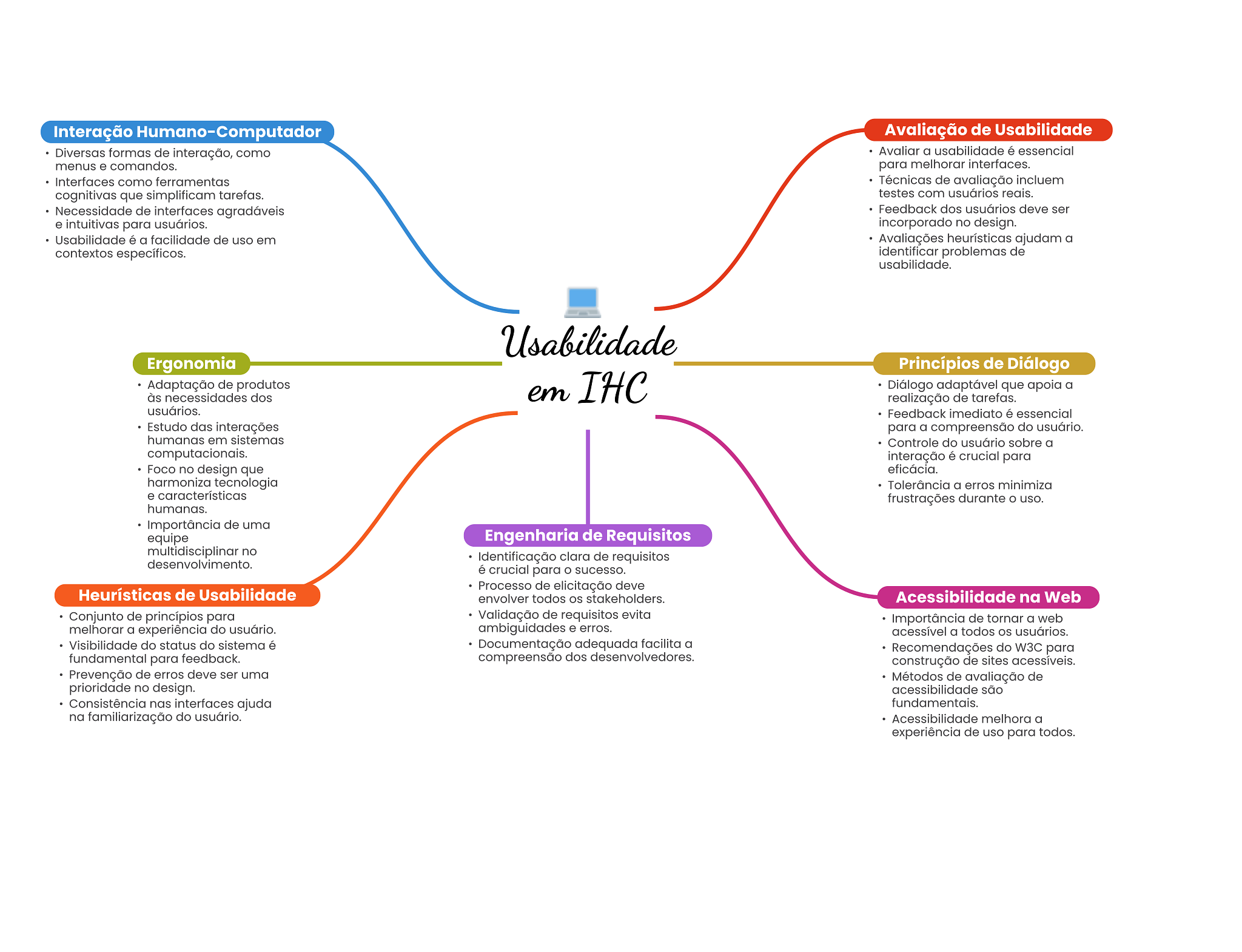 Interação Humano-Computador Avaliação de Usabilidade Diversas formas de interação, como Avaliar a usabilidade é essencial menus e comandos. para melhorar interfaces. Interfaces como ferramentas Técnicas de avaliação incluem cognitivas que simplificam tarefas. testes com usuários reais. Necessidade de interfaces agradáveis Feedback dos usuários deve ser e intuitivas para usuários. incorporado no design. Usabilidade é a facilidade de uso em Avaliações heurísticas ajudam a contextos específicos. identificar problemas de usabilidade. Usabilidade Ergonomia Princípios de Diálogo Adaptação de produtos em IHC Diálogo adaptável que apoia a às necessidades dos realização de tarefas. usuários. Feedback imediato é essencial Estudo das interações para a compreensão do usuário. humanas em sistemas Controle do usuário sobre a computacionais. interação é crucial para Foco no design que eficácia. harmoniza tecnologia Tolerância a erros minimiza e características frustrações durante O uso. humanas. Importância de uma equipe Engenharia de Requisitos multidisciplinar no Identificação clara de requisitos desenvolvimento. é crucial para sucesso. Processo de elicitação deve Heurísticas de Usabilidade envolver todos OS stakeholders. Acessibilidade na Web Conjunto de princípios para Validação de requisitos evita Importância de tornar a web melhorar a experiência do usuário. ambiguidades e erros. acessível a todos usuários. Visibilidade do status do sistema é Documentação adequada facilita a Recomendações do W3C para fundamental para feedback. compreensão dos desenvolvedores. construção de sites acessíveis. Prevenção de erros deve ser uma Métodos de avaliação de prioridade no design. acessibilidade são Consistência nas interfaces ajuda fundamentais. na familiarização do usuário. Acessibilidade melhora a experiência de uso para todos.