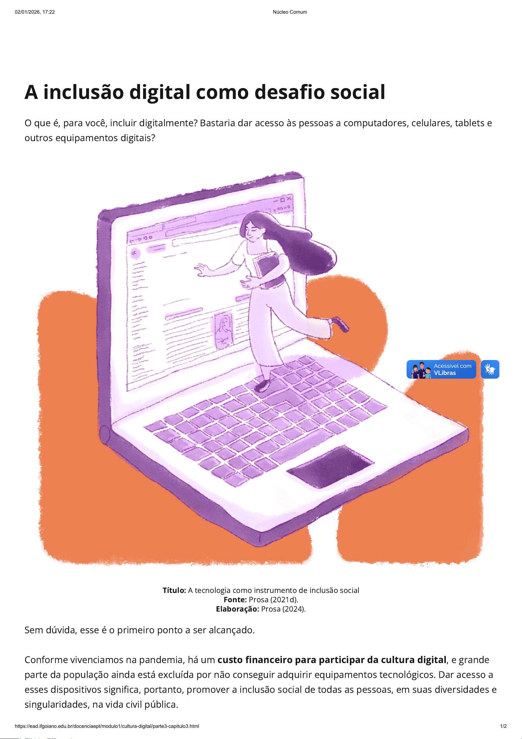 A inclusão digital como desafio social O que é, para você, incluir digitalmente? Bastaria dar acesso às pessoas a computadores, celulares, tablets e outros equipamentos digitais? Título: A tecnologia como instrumento de inclusão social Fonte: Prosa (2021d). Elaboração: Prosa (2024). Sem dúvida, esse é o primeiro ponto a ser alcançado. Conforme vivenciamos na pandemia, há um custo financeiro para participar da cultura digital, e grande parte da população ainda está excluída por não conseguir adquirir equipamentos tecnológicos. Dar acesso a esses dispositivos significa, portanto, promover a inclusão social de todas as pessoas, em suas diversidades e singularidades, na vida civil pública. 02/01/2026, 17:22 Núcleo Comum https://ead.ifgoiano.edu.br/docenciaept/modulo1/cultura-digital/parte3-capitulo3.html 1/2 2024| SETEC-MEC | LANTEC/PROSA-UFSC. Todos os direitos reservados. Já a inclusão digital, conforme nos explicam Fernandes e Braga, no Dicionário crítico de educação e tecnologias e de educação a distância, envolve o “acesso frequente ou facilitado a computadores e à internet, bem como a outros equipamentos de tecnologias de informação e comunicação (TICs)” (2018, p. 333, grifos nossos) (Fernandes; Braga, 2018, p. 333). No entanto, isso não é suficiente para considerar alguém incluído digitalmente, pois também é imprescindível que as pessoas tenham as habilidades que lhes permitam fazer uso das tecnologias digitais “de forma autônoma e crítica para busca e tratamento da informação, utilização de serviços on-line, comunicação, entretenimento, educação e produção de conteúdos, entre outras possibilidades” (Fernandes; Braga, 2018, p. 333). Voltar Avançar Leitura Página 16 de 25 02/01/2026, 17:22 Núcleo Comum https://ead.ifgoiano.edu.br/docenciaept/modulo1/cultura-digital/parte3-capitulo3.html 2/2 http://www.acessoainformacao.gov.br/ http://www.acessoainformacao.gov.br/ http://www.brasil.gov.br/ http://www.brasil.gov.br/ https://ead.ifgoiano.edu.br/docenciaept/modulo1/cultura-digital/parte3-capitulo2.html https://ead.ifgoiano.edu.br/docenciaept/modulo1/cultura-digital/parte3.capitulo4.html