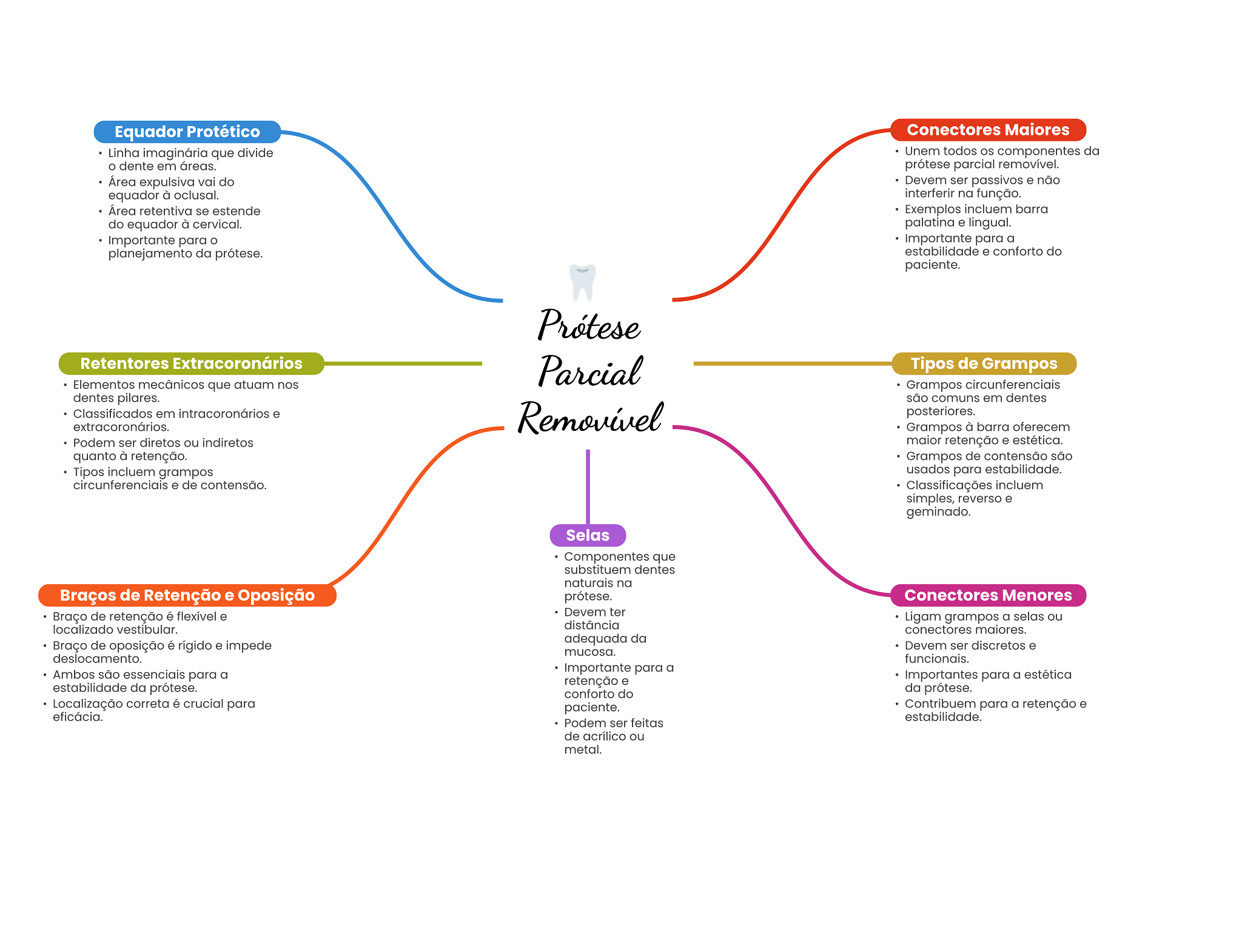 Equador Protético Conectores Maiores Linha imaginária que divide Unem todos os componentes da dente em áreas. prótese parcial removível. Área expulsiva vai do Devem ser passivos e não equador à oclusal. interferir na função. Área retentiva se estende Exemplos incluem barra do equador à cervical. palatina e lingual. Importante para Importante para a planejamento da prótese. estabilidade e conforto do paciente. Prótese Retentores Extracoronários Parcial Tipos de Grampos Elementos mecânicos que atuam nos Grampos circunferenciais dentes pilares. são comuns em dentes Classificados em intracoronários e Removivel posteriores. extracoronários. Grampos à barra oferecem Podem ser diretos ou indiretos maior retenção e estética. quanto à retenção. Grampos de contensão são Tipos incluem grampos usados para estabilidade. circunferenciais e de contensão. Classificações incluem simples, reverso e geminado. Selas Componentes que substituem dentes naturais na Braços de Retenção e Oposição prótese. Conectores Menores Braço de retenção é flexível e Devem ter Ligam grampos a selas ou localizado vestibular. distância conectores maiores. adequada da Braço de oposição é rígido e impede Devem ser discretos e mucosa. deslocamento. funcionais. Ambos são essenciais para a Importante para a retenção e Importantes para a estética estabilidade da prótese. conforto do da prótese. Localização correta é crucial para paciente. Contribuem para a retenção e eficácia. estabilidade. Podem ser feitas de acrílico ou metal.