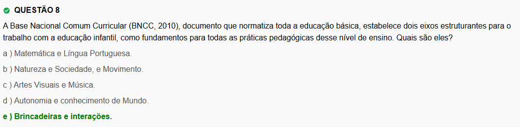QUESTÃO 8 A Base Nacional Comum Curricular (BNCC, 2010), documento que normatiza toda a educação básica, estabelece dois eixos estruturantes para trabalho com a educação infantil, como fundamentos para todas as práticas pedagógicas desse de ensino. Quais são eles? a ) Matemática e Língua Portuguesa. b) Natureza e Sociedade, e c) Artes Visuais e Música. d) Autonomia e conhecimento de Mundo. e ) Brincadeiras e interações.