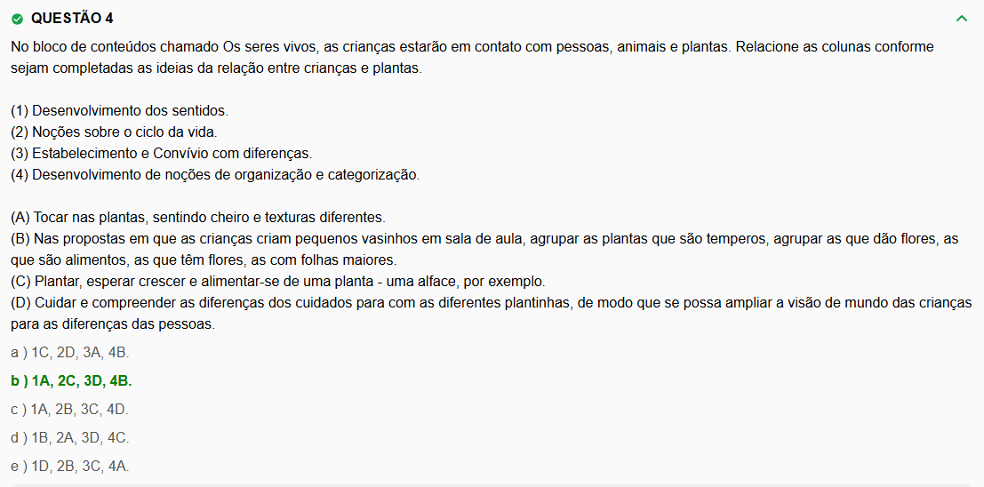 QUESTÃO 4 No bloco de conteúdos chamado Os seres vivos, as crianças estarão em contato com pessoas, animais e plantas. Relacione as colunas conforme sejam completadas as ideias da relação entre crianças e plantas. (1) Desenvolvimento dos sentidos. (2) Noções sobre ciclo da vida. (3) Estabelecimento e Convívio com diferenças. (4) Desenvolvimento de noções de organização e categorização. (A) Tocar nas plantas, sentindo cheiro e texturas diferentes. (B) Nas propostas em que as crianças criam pequenos vasinhos em sala de aula, agrupar as plantas que são temperos, agrupar as que dão flores, as que são alimentos, as que têm flores, as com folhas maiores. (C) Plantar, esperar crescer e alimentar-se de uma planta uma alface, por exemplo. (D) Cuidar e compreender as diferenças dos cuidados para com as diferentes plantinhas, de modo que se possa ampliar a visão de mundo das crianças para as diferenças das pessoas. a) 1C, 2D, 3A, 4B. b) 1A, 2C, 3D, 4B. c) 1A, 2B, 3C, 4D. d) 1B, 2A, 3D, 4C. e ) 1D, 2B, 3C, 4A.