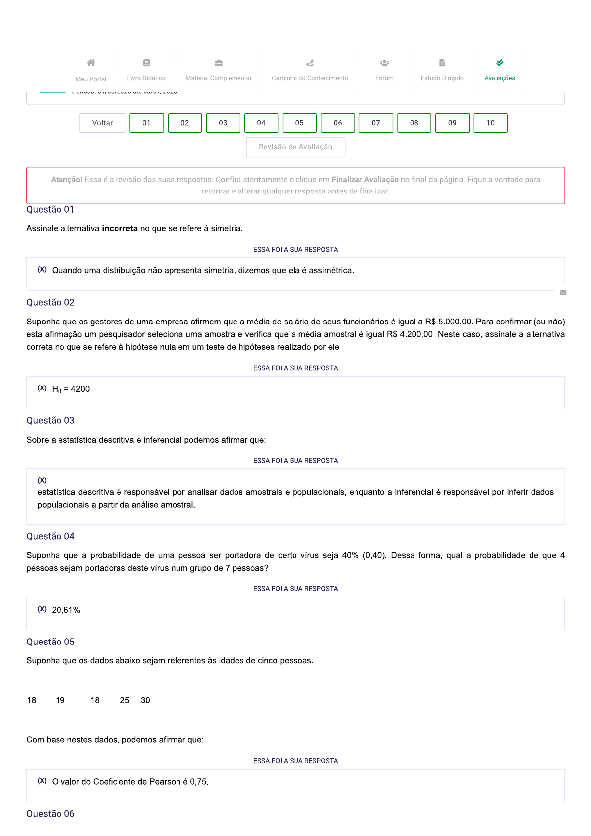 Meu Portal Livro Didático Material Complementar Caminho do Conhecimento Fórum Estudo Dirigido Avaliações Voltar 01 02 03 04 05 06 07 08 09 10 Revisão de Avaliação Atenção! Essa é a revisão das suas respostas. Confira atentamente e clique em Finalizar Avaliação no final da página. Fique a vontade para retornar e alterar qualquer resposta antes de finalizar. Questão 01 Assinale alternativa incorreta no que se refere à simetria. ESSA FOI A SUA RESPOSTA Quando uma distribuição não apresenta simetria, dizemos que ela é assimétrica. Questão 02 Suponha que os gestores de uma empresa afirmem que a média de salário de seus funcionários é igual a R$ 5.000,00. Para confirmar (ou não) esta afirmação um pesquisador seleciona uma amostra e verifica que a média amostral é igual R$ 4.200,00. Neste caso, assinale a alternativa correta no que se refere à hipótese nula em um teste de hipóteses realizado por ele ESSA FOI A SUA RESPOSTA (X) 4200 Questão 03 Sobre a estatística descritiva e inferencial podemos afirmar que: ESSA FOI A SUA RESPOSTA (X) estatística descritiva é responsável por analisar dados amostrais e populacionais, enquanto a inferencial é responsável por inferir dados populacionais a partir da análise amostral. Questão 04 Suponha que a probabilidade de uma pessoa ser portadora de certo vírus seja 40% (0,40). Dessa forma, qual a probabilidade de que 4 pessoas sejam portadoras deste vírus num grupo de 7 pessoas? ESSA FOI A SUA RESPOSTA (X) 20,61% Questão 05 Suponha que os dados abaixo sejam referentes às idades de cinco pessoas. 18 19 18 25 30 Com base nestes dados, podemos afirmar que: ESSA FOI A SUA RESPOSTA (X) valor do Coeficiente de Pearson é 0,75. Questão 06Sobre os gráficos é incorreto dizer que: Meu Portal Livro Didático Material Complementar Caminho do Conhecimento Fórum Estudo Dirigido Avaliações Questão 07 Suponha que, em uma caixa, haja 3 bolas brancas, 5 bolas pretas e 2 bolas azuis. Se uma única bola for retirada ao acaso, qual a probabilidade de que seja azul ou preta? ESSA FOI A SUA RESPOSTA (X) 70% Questão 08 Suponha que cinco pessoas tenham sido entrevistadas para preencher a uma vaga de emprego e o conjunto abaixo representa a idade de cada candidato. 18 21 21 22 25 Calcule a curtose referente a esta distribuição e assinale a alternativa correta. ESSA FOI A SUA RESPOSTA (X) 1,48 Questão 09 Relacione a correlação entre as variáveis: 1. Regressão múltipla 2. Correlação bivariada 3. Regressão linear simples 4. Variável X 5. Variável y Relaciona apenas duas variáveis. Analisa duas variáveis. Relaciona mais de duas variáveis. Variável dependente. Variável independente. ESSA FOI A SUA RESPOSTA (X) 2-3-1-5-4. Questão 10 Suponha que uma amostra de tamanho n = 49 tenha sido extraída de uma população cuja variância seja = 14 para testar a seguinte hipótese sobre a média populacional: Suponha ainda que a média encontrada na amostra tenha sido Sendo assim, calcule a estatística de teste (Z) e assinale a alternativa correta. ESSA FOI A SUA RESPOSTA(X) Z = 1,5 Meu Portal Livro Didático Material Complementar Caminho do Conhecimento Fórum Estudo Dirigido Avaliações