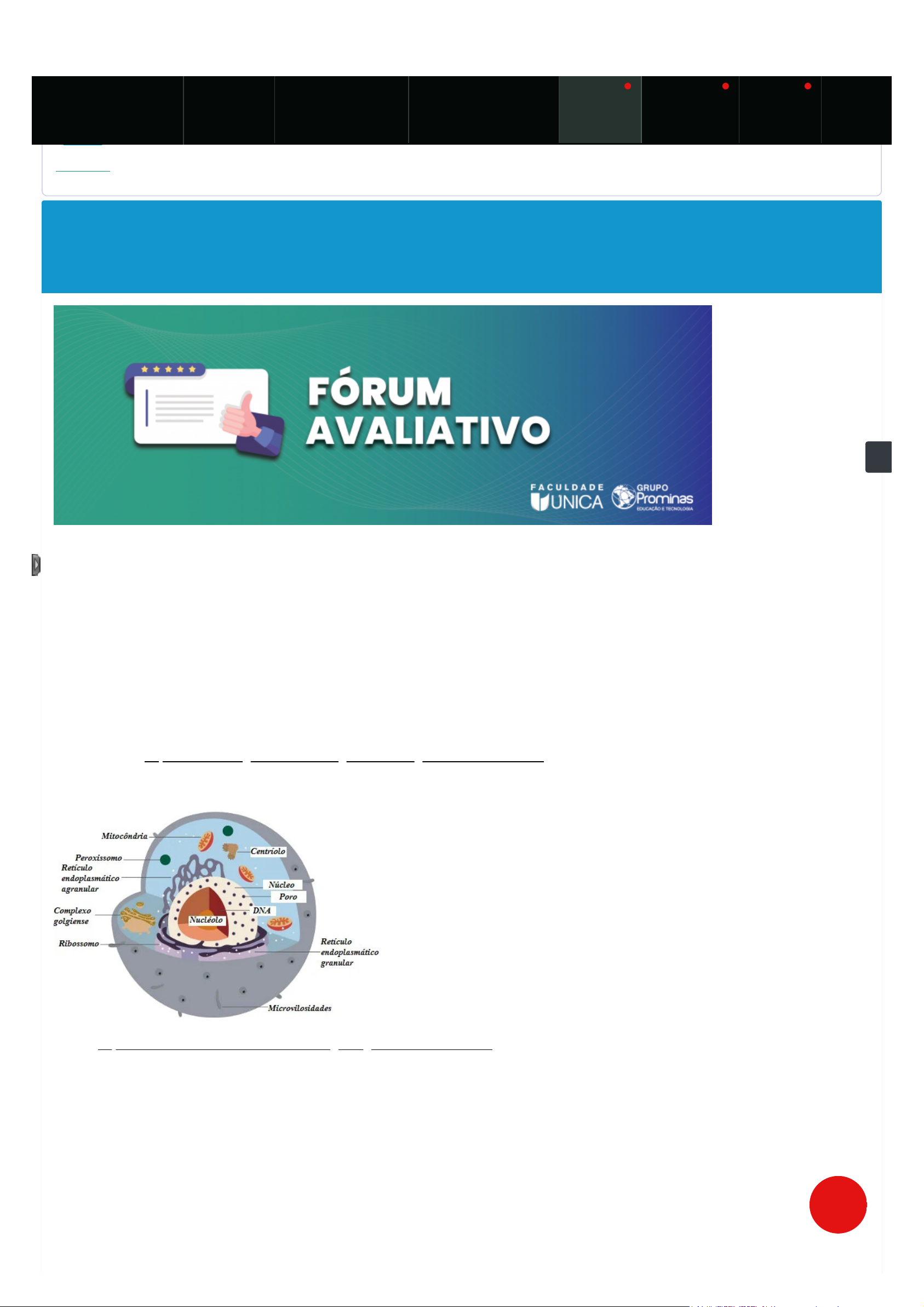 21/03/23, 15:56 Pincel Atômico - Sistema de Gestão Escolar https://faculdadeunica.pincelatomico.net.br/academico/sala_virtual.php?turmaDisc=de76b4605dabb2d4050dbc3b26e2d91a# 1/2 Sala Virtual / Fórum Bioquímica Período: 15/03/2023 até 21/04/2023 [820536] FÓRUM AVALIATIVO Período: 17/03/2023 00:00:00 até 31/03/2023 23:59:59 Pontuação Máxima: 10,00 TÍTULO: ORGANELAS CELULARES E SUAS PRINCIPAIS FUNÇÕES CONTEXTUALIZAÇÃO As organelas celulares são estruturas encontradas no citoplasma das células. Enquanto nas células eucarióticas, é encontrada uma variedade de organelas, nas células procarióticas, apenas um único tipo é encontrado: os ribossomos. As organelas apresentam uma grande variedade de funções, mas todas possuem um objetivo principal: manter a célula viva e funcionando adequadamente. No caso dos seres unicelulares, as organelas são responsáveis pela sobrevivência deles. De uma maneira geral, podemos dizer que as organelas celulares funcionam como verdadeiros órgãos. Disponível em: https://www.biologianet.com/biologia-celular/organelas-celulares.htm. acesso em:30/09/2020- 20:38 IMAGEM REPRESENTATIVA Fonte: https://mundoeducacao.uol.com.br/biologia/organelas-celulares.htm Publicado por: Vanessa Sardinha dos Santos PROPOSTA DA ATIVIDADE Com base em que estudamos sobre organelas celulares, bem como na contextualização acima e em pesquisas, relate em apenas um parágrafo (mínimo 5 e máximo 8 linhas), abordando sobre 3 tipos de organelas celulares e suas respectivas funções desenvolvidas. CRITÉRIOS DE AVALIAÇÃO - Discorra um parágrafo (mínimo 5 e máximo 8 linhas) observando a Norma Culta da Língua Portuguesa. Meu Portal Livro Didático Material Complementar Caminho do Conhecimento Fórum Estudo Dirigido Avaliações https://www.biologianet.com/biologia-celular/organelas-celulares.htm https://mundoeducacao.uol.com.br/biologia/organelas-celulares.htm https://faculdadeunica.pincelatomico.net.br/academico/index.php https://faculdadeunica.pincelatomico.net.br/externos/apostilaView.php?hash=a8240cb8235e9c493a0c30607586166c javascript:void(0) 21/03/23, 15:56 Pincel Atômico - Sistema de Gestão Escolar https://faculdadeunica.pincelatomico.net.br/academico/sala_virtual.php?turmaDisc=de76b4605dabb2d4050dbc3b26e2d91a# 2/2 - A postagem precisa estar coerente com a contextualização e a proposta da atividade informadas acima. - Seja sucinto e coerente. DICAS FINAIS - Fique atento(a) ao seu e-mail, pois o tutor poderá enviar um e-mail para você, solicitando uma nova postagem. - Evite deixar suas postagens para o último dia, pois o espaço para debates ficará pequeno e o tema pouco explorado. - A nota do fórum será registrada a partir da correção do professor/tutor e estará disponível na data informada em seu CRONOGRAMA. - Não postar anexos de qualquer espécie. As postagens devem ser registradas no corpo do fórum. - A cópia de texto dos colegas ou da internet reduzirá a nota a zero. Para mais informações, segue os links sobre a ABNT, bem como, o vídeo com as orientações para inserir citações e referências nos trabalhos acadêmicos. - https://www.normasabnt.org/ - https://www.youtube.com/watch?v=gR-4H5QFL8o ELIZÂNGELA SOUZA LOPES Aluno 17/03/2023 16:54:32 EL Entre as organelas celulares temos os lisossomos, que são estruturas esféricas ricas em enzimas, estão presentes nas células eucarióticas, tendo como principal função a digestão intracelular. Temos também, as mitocôndrias que são encontradas em células eucariontes, apresentam formato esférico ou alongado, possuem duas membranas e são responsáveis pelo processo de respiração celular, que é quando a célula produz energia para realizar suas atividades. Outra organela celular são os ribossomos, que são organelas não membranosas presentes em todas as células. São compostos por RNA ribossomal e proteínas, tendo como função a de atuar na síntese de proteínas, por isso são encontradas em maior quantidade em células com alta taxa de sintese protéica. MARIANA MONTEIRO DOS SANTOS DIAS Aluno 18/03/2023 12:51:52 M As organelas celulares são membranas com funções especializadas. O núcleo tem como objetivo o armazenamento da informação genética, o retículo endoplamático liso se relaciona com a síntese de lipídios que é o metabolismo de carboidratos e processos de desintoxicação e o lisossomo atua na digestão intracelular. 1 Meu Portal Livro Didático Material Complementar Caminho do Conhecimento Fórum Estudo Dirigido Avaliações https://www.normasabnt.org/ https://www.youtube.com/watch?v=gR-4H5QFL8o https://faculdadeunica.pincelatomico.net.br/academico/index.php https://faculdadeunica.pincelatomico.net.br/externos/apostilaView.php?hash=a8240cb8235e9c493a0c30607586166c javascript:void(0)