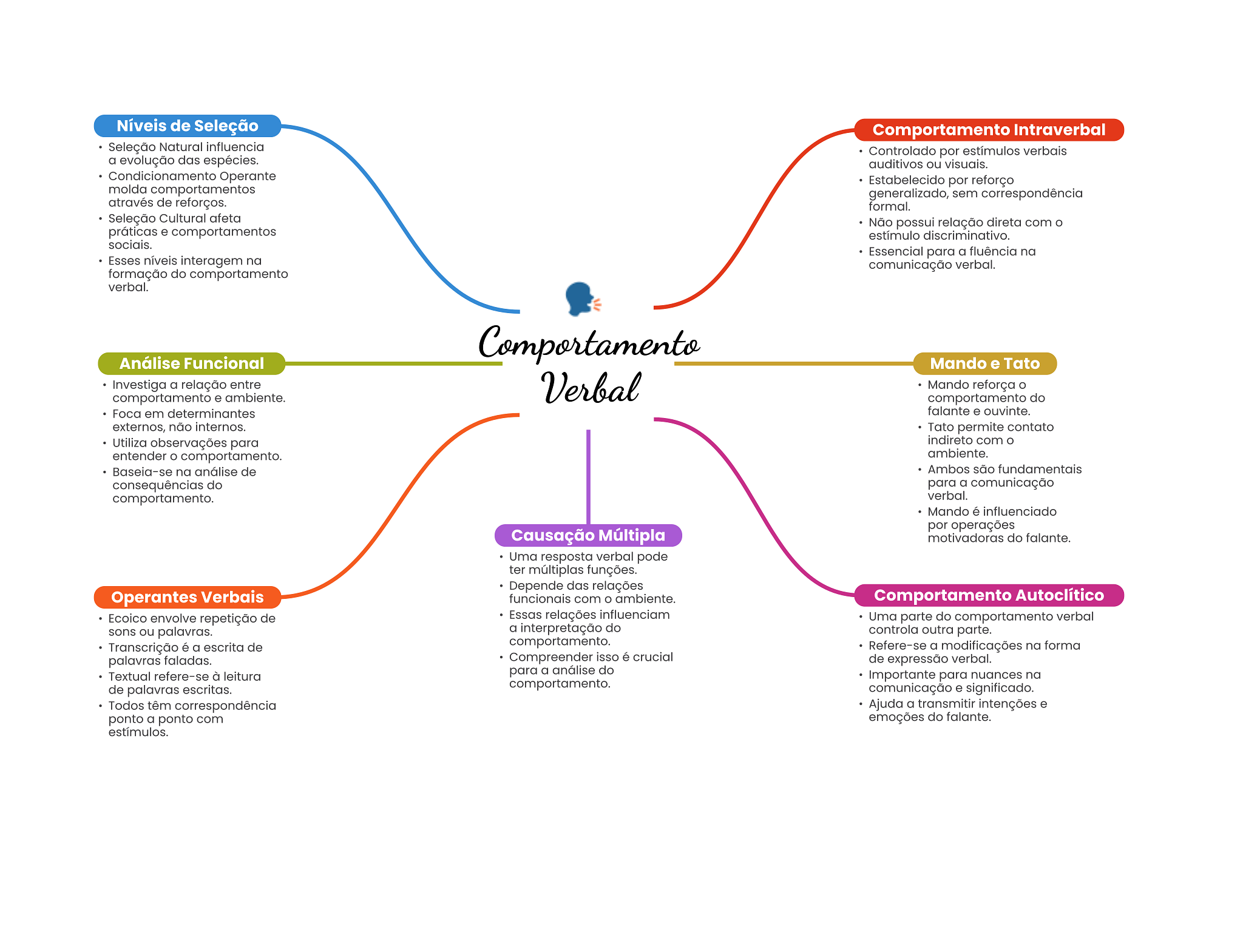 Níveis de Seleção Comportamento Intraverbal Seleção Natural influencia Controlado por estímulos verbais a evolução das espécies. auditivos ou visuais. Condicionamento Operante Estabelecido por reforço molda comportamentos generalizado, sem correspondência através de reforços. formal. Seleção Cultural afeta Não possui relação direta com práticas e comportamentos estímulo discriminativo. sociais. Essencial para a fluência na Esses níveis interagem na comunicação verbal. formação do comportamento verbal. Comportamento Análise Funcional Mando e Tato Investiga a relação entre Verbal Mando reforça comportamento e ambiente. comportamento do Foca em determinantes falante e ouvinte. externos, não internos. Tato permite contato Utiliza observações para indireto com O entender O comportamento. ambiente. Baseia-se na análise de Ambos são fundamentais consequências do para a comunicação comportamento. verbal. Mando é influenciado por operações Causação Múltipla motivadoras do falante. Uma resposta verbal pode ter múltiplas funções. Depende das relações Operantes Verbais funcionais com ambiente. Comportamento Autoclítico Ecoico envolve repetição de Essas relações influenciam Uma parte do comportamento verbal sons ou palavras. a interpretação do controla outra parte. Transcrição é a escrita de comportamento. Refere-se a modificações na forma palavras faladas. Compreender isso é crucial de expressão verbal. Textual refere-se à leitura para a análise do Importante para nuances na de palavras escritas. comportamento. comunicação e significado. Todos têm correspondência Ajuda a transmitir intenções e ponto a ponto com emoções do falante. estímulos.