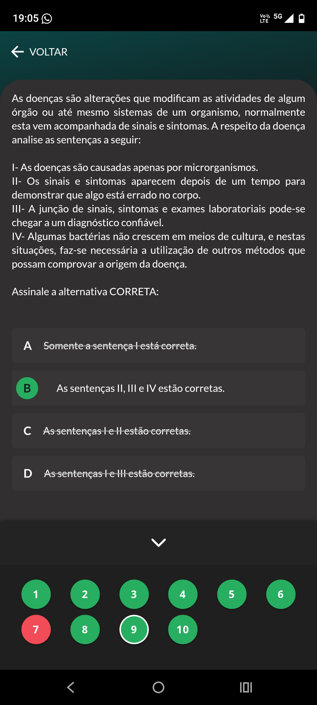 19:05 5G LTE VOLTAR As doenças são alterações que modificam as atividades de algum órgão ou até mesmo sistemas de um organismo, normalmente esta vem acompanhada de sinais e sintomas. respeito da doença analise as sentenças a seguir: I- As doenças são causadas apenas por microrganismos. II- Os sinais e sintomas aparecem depois de um tempo para demonstrar que algo está errado no corpo. III- A junção de sinais, sintomas e exames laboratoriais pode-se chegar a um diagnóstico confiável. IV- Algumas bactérias não crescem em meios de cultura, e nestas situações, faz-se necessária a utilização de outros métodos que possam comprovar a origem da doença. Assinale a alternativa CORRETA: A Somente a sentença está correta. As sentenças II, III e IV estão corretas. c As sentenças le H estão corretas. D As sentenças le estão corretas. 1 2 3 4 5 6 7 8 9 10