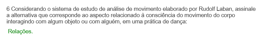 6 Considerando sistema de estudo de análise de movimento elaborado por Rudolf Laban, assinale a alternativa que corresponde ao aspecto relacionado à consciência do movimento do corpo interagindo com algum objeto ou com alguém, em uma prática de dança: Relações.