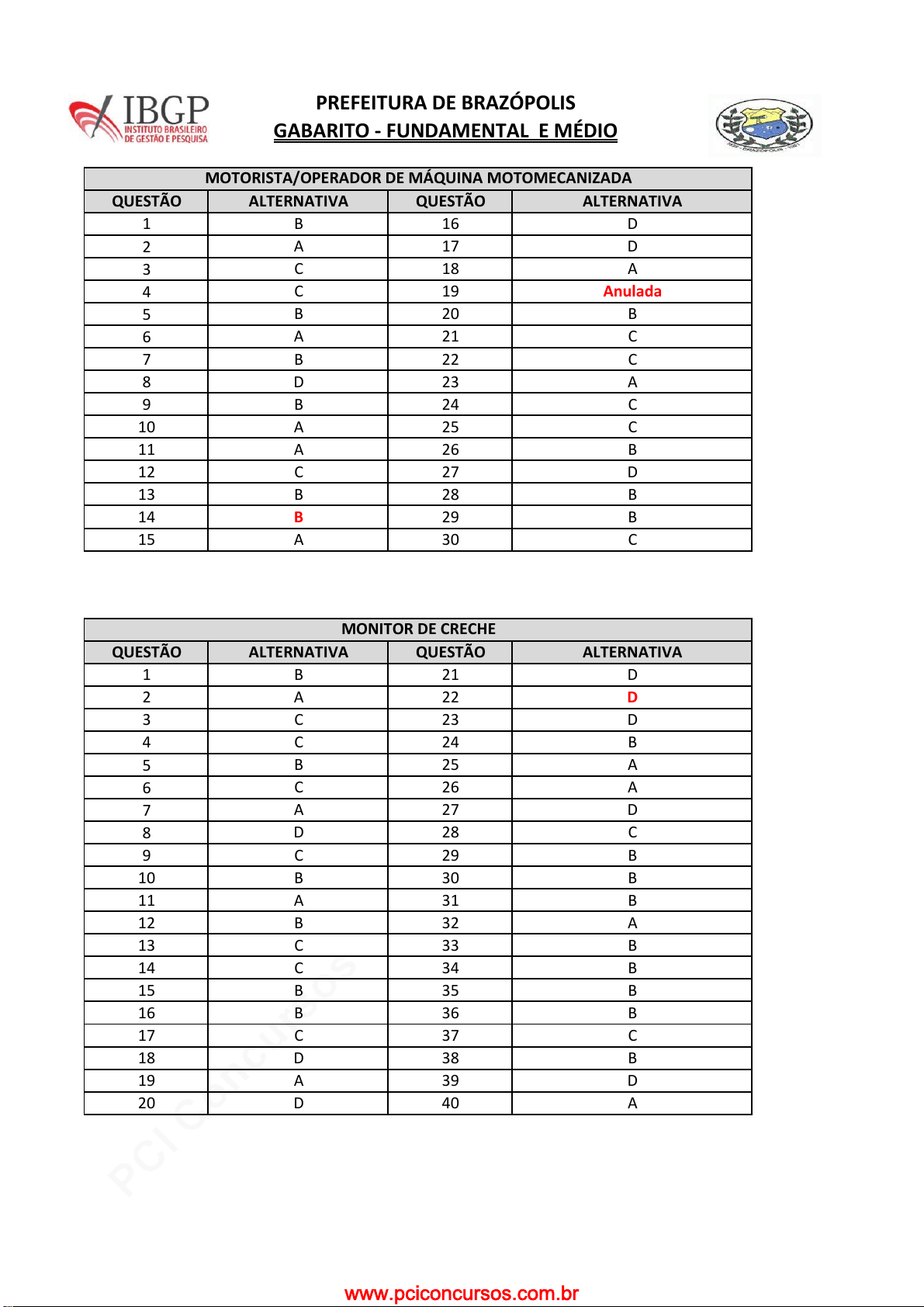 pcimarkpci MjgwNDowMTRjOjAyMjg6ODQ1ZDplMGFjOjhmMGY6MjVkNDo3NGFi:TW9uLCAxMiBKYW4gMjAyNiAwODozMjoyOCAtMDMwMA== www.pciconcursos.com.br QUESTÃO ALTERNATIVA QUESTÃO ALTERNATIVA 1 B 16 D 2 A 17 D 3 C 18 A 4 C 19 Anulada 5 B 20 B 6 A 21 C 7 B 22 C 8 D 23 A 9 B 24 C 10 A 25 C 11 A 26 B 12 C 27 D 13 B 28 B 14 B 29 B 15 A 30 C QUESTÃO ALTERNATIVA QUESTÃO ALTERNATIVA 1 B 21 D 2 A 22 D 3 C 23 D 4 C 24 B 5 B 25 A 6 C 26 A 7 A 27 D 8 D 28 C 9 C 29 B 10 B 30 B 11 A 31 B 12 B 32 A 13 C 33 B 14 C 34 B 15 B 35 B 16 B 36 B 17 C 37 C 18 D 38 B 19 A 39 D 20 D 40 A PREFEITURA DE BRAZÓPOLIS GABARITO - FUNDAMENTAL E MÉDIO MOTORISTA/OPERADOR DE MÁQUINA MOTOMECANIZADA MONITOR DE CRECHE www.pciconcursos.com.br pcimarkpci MjgwNDowMTRjOjAyMjg6ODQ1ZDplMGFjOjhmMGY6MjVkNDo3NGFi:TW9uLCAxMiBKYW4gMjAyNiAwODozMjoyOCAtMDMwMA== www.pciconcursos.com.br QUESTÃO ALTERNATIVA QUESTÃO ALTERNATIVA 1 B 21 C 2 B 22 D 3 B 23 C 4 D 24 C 5 D 25 A 6 A 26 A 7 B 27 B 8 A 28 B 9 C 29 Anulada 10 B 30 D 11 A 31 D 12 A 32 D 13 D 33 A 14 B 34 A 15 C 35 C 16 A 36 A 17 B 37 C 18 C 38 D 19 C 39 D 20 B 40 B QUESTÃO ALTERNATIVA QUESTÃO ALTERNATIVA 1 B 21 C 2 B 22 D 3 B 23 C 4 D 24 C 5 D 25 A 6 A 26 A 7 B 27 B 8 A 28 B 9 C 29 Anulada 10 B 30 D 11 A 31 D 12 A 32 A 13 D 33 D 14 B 34 C 15 C 35 B 16 A 36 A 17 B 37 D 18 C 38 D 19 C 39 A 20 B 40 C ASSISTENTE SOCIAL NUTRIÇÃO PREFEITURA DE BRAZÓPOLIS GABARITO - SUPERIOR www.pciconcursos.com.br