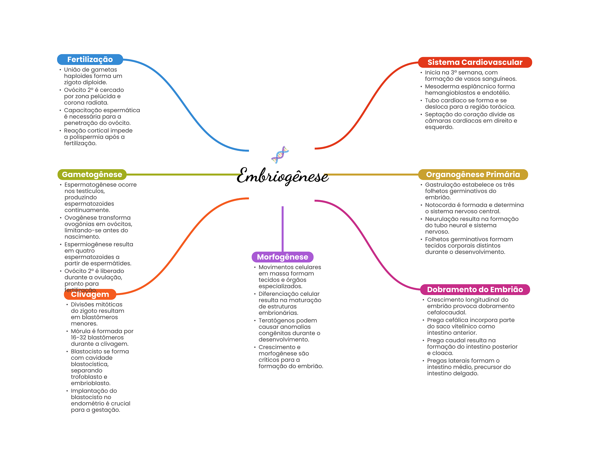 Fertilização Sistema Cardiovascular União de gametas Inicia na semana, com haploides forma um formação de vasos sanguíneos. zigoto diploide. Ovócito 2° é cercado Mesoderma esplâncnico forma hemangioblastos e endotélio. por zona pelúcida e corona radiata. Tubo cardíaco se forma e se desloca para a região torácica. Capacitação espermática é necessária para a Septação do coração divide as penetração do ovócito. câmaras cardíacas em direito e Reação cortical impede esquerdo. a polispermia após a fertilização. Gametogênese Embriogênese Organogênese Primária Espermatogênese ocorre Gastrulação estabelece OS três nos testículos, folhetos germinativos do produzindo embrião. espermatozoides Notocorda é formada e determina continuamente. sistema nervoso central. Ovogênese transforma Neurulação resulta na formação ovogônias em ovócitos, do tubo neural e sistema limitando-se antes do nervoso. nascimento. Folhetos germinativos formam Espermiogênese resulta tecidos corporais distintos em quatro durante desenvolvimento. espermatozoides a Morfogênese partir de espermátides. Movimentos celulares Ovócito 2° é liberado em massa formam durante a ovulação, tecidos e órgãos pronto para especializados. fertilização Dobramento do Embrião Clivagem Diferenciação celular resulta na maturação Crescimento longitudinal do Divisões mitóticas de estruturas embrião provoca dobramento do zigoto resultam embrionárias. cefalocaudal. em blastômeros Teratógenos podem Prega cefálica incorpora parte menores. causar anomalias do saco vitelínico como Mórula é formada por congênitas durante intestino anterior. 16-32 blastômeros durante a clivagem. Prega caudal resulta na Crescimento e formação do intestino posterior Blastocisto se forma morfogênese são e cloaca. com cavidade críticos para a Pregas laterais formam blastocística, formação do embrião. intestino médio, precursor do separando trofoblasto e intestino delgado. embrioblasto. Implantação do blastocisto no endométrio é crucial para a gestação.