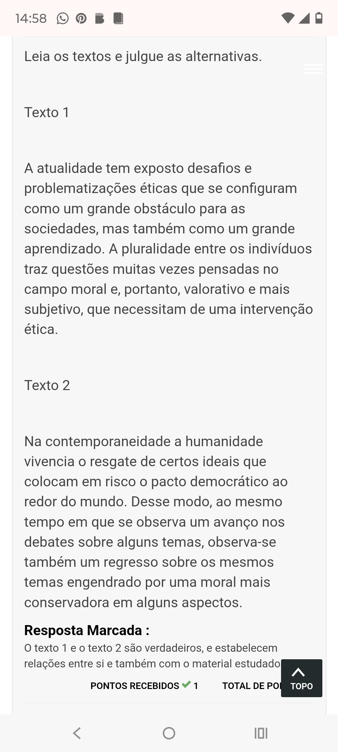 14:58 Leia os textos e julgue as alternativas. Texto 1 A atualidade tem exposto desafios e problematizações éticas que se configuram como um grande obstáculo para as sociedades, mas também como um grande aprendizado. A pluralidade entre os indivíduos traz questões muitas vezes pensadas no campo moral e, portanto, valorativo e mais subjetivo, que necessitam de uma intervenção ética. Texto 2 Na contemporaneidade a humanidade vivencia resgate de certos ideais que colocam em risco pacto democrático ao redor do mundo. Desse modo, ao mesmo tempo em que se observa um avanço nos debates sobre alguns temas, observa-se também um regresso sobre os mesmos temas engendrado por uma moral mais conservadora em alguns aspectos. Resposta Marcada : texto 1 e o texto 2 são verdadeiros, e estabelecem relações entre si e também com o material estudado PONTOS RECEBIDOS 1 TOTAL DE POI TOPO