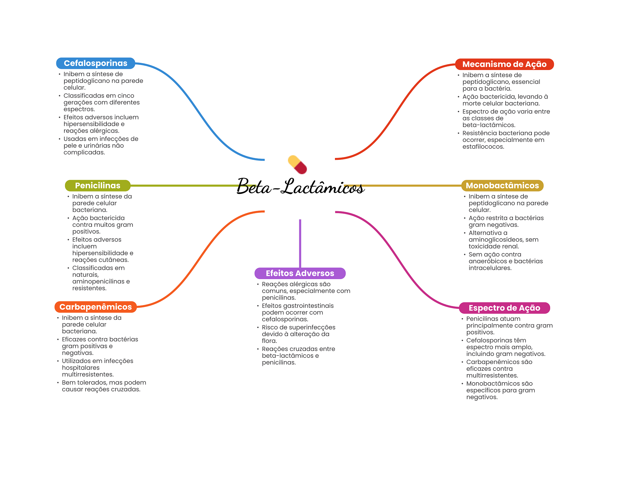 Cefalosporinas Mecanismo de Ação Inibem a síntese de Inibem a síntese de peptidoglicano na parede peptidoglicano, essencial celular. para a bactéria. Classificadas em cinco Ação bactericida, levando à gerações com diferentes morte celular bacteriana. espectros. Espectro de ação varia entre Efeitos adversos incluem as classes de hipersensibilidade e beta-lactâmicos. reações alérgicas. Resistência bacteriana pode Usadas em infecções de ocorrer, especialmente em pele e urinárias não estafilococos. complicadas. Penicilinas Beta-Lactâmicos Monobactâmicos Inibem a síntese da Inibem a síntese de parede celular peptidoglicano na parede bacteriana. celular. Ação bactericida Ação restrita a bactérias contra muitos gram gram negativas. positivos. Alternativa a Efeitos adversos aminoglicosídeos, sem incluem toxicidade renal. hipersensibilidade e Sem ação contra reações cutâneas. anaeróbicos e bactérias Classificadas em intracelulares. naturais, Efeitos Adversos aminopenicilinas e Reações alérgicas são resistentes. comuns, especialmente com penicilinas. Carbapenêmicos Efeitos gastrointestinais Espectro de Ação podem ocorrer com Inibem a síntese da cefalosporinas. Penicilinas atuam parede celular Risco de superinfecções principalmente contra gram bacteriana. devido à alteração da positivos. Eficazes contra bactérias flora. Cefalosporinas têm gram positivas e Reações cruzadas entre espectro mais amplo, negativas. beta-lactâmicos e incluindo gram negativos. Utilizados em infecções penicilinas. Carbapenêmicos são hospitalares eficazes contra multirresistentes. multirresistentes. Bem tolerados, mas podem Monobactâmicos são causar reações cruzadas. específicos para gram negativos.