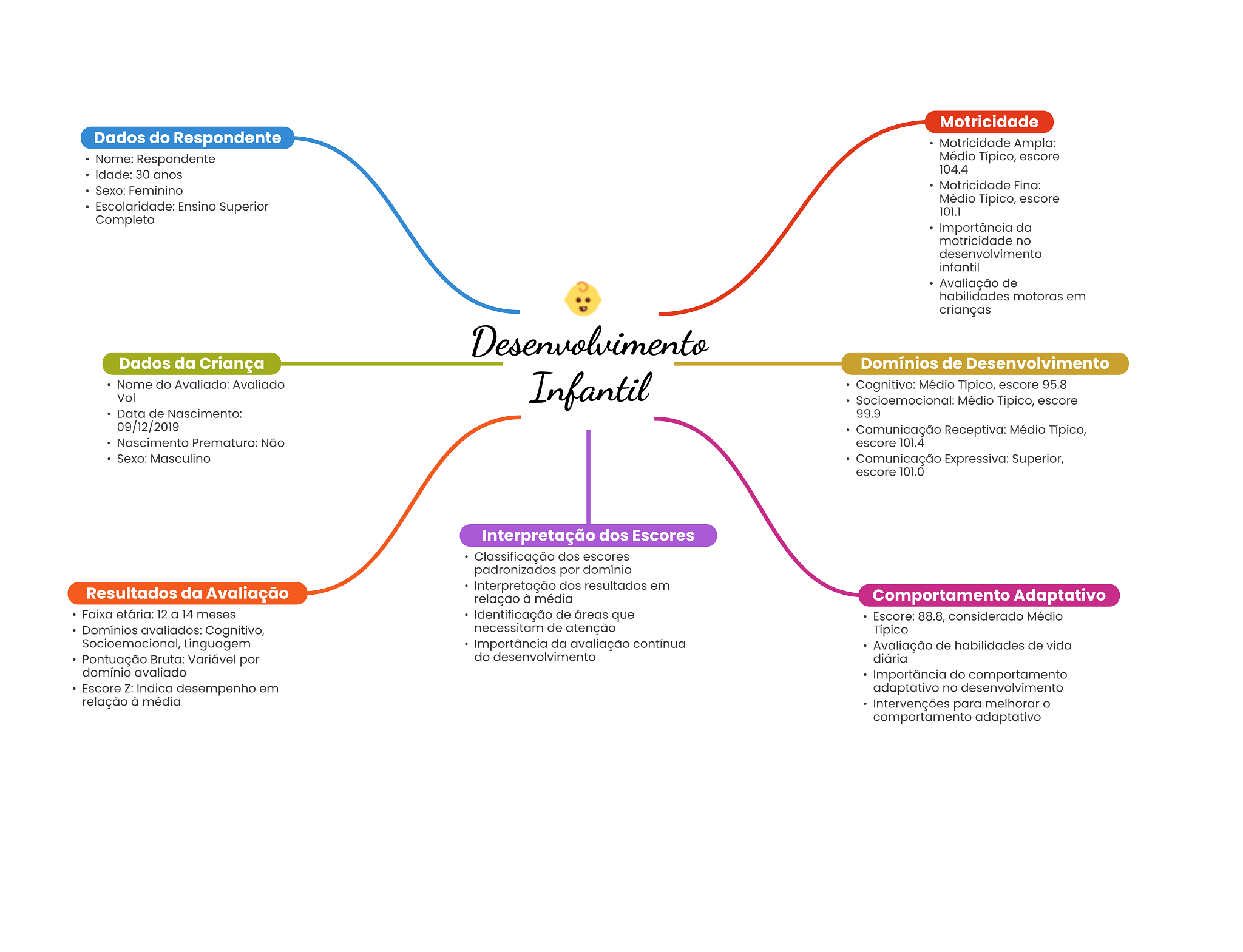 Motricidade Dados do Respondente Motricidade Ampla: Nome: Respondente Médio Típico, escore Idade: 30 anos 104.4 Sexo: Feminino Motricidade Fina: Médio Típico, escore Escolaridade: Ensino Superior 101.1 Completo Importância da motricidade no desenvolvimento infantil Avaliação de habilidades motoras em crianças Desenvolvimento Dados da Criança Domínios de Desenvolvimento Nome do Avaliado: Avaliado Infantil Cognitivo: Médio Típico, escore 95.8 Vol Socioemocional: Médio Típico, escore Data de Nascimento: 99.9 09/12/2019 Comunicação Receptiva: Médio Típico, Nascimento Prematuro: Não escore 101.4 Sexo: Masculino Comunicação Expressiva: Superior, escore 101.0 Interpretação dos Escores Classificação dos escores padronizados por domínio Resultados da Avaliação Interpretação dos resultados em relação à média Comportamento Adaptativo Faixa etária: 12 a 14 meses Identificação de áreas que Escore: 88.8, considerado Médio Domínios avaliados: Cognitivo, necessitam de atenção Típico Socioemocional, Linguagem Importância da avaliação contínua Avaliação de habilidades de vida Pontuação Bruta: Variável por do desenvolvimento diária domínio avaliado Importância do comportamento Escore Z: Indica desempenho em adaptativo no desenvolvimento relação à média Intervenções para melhorar comportamento adaptativo