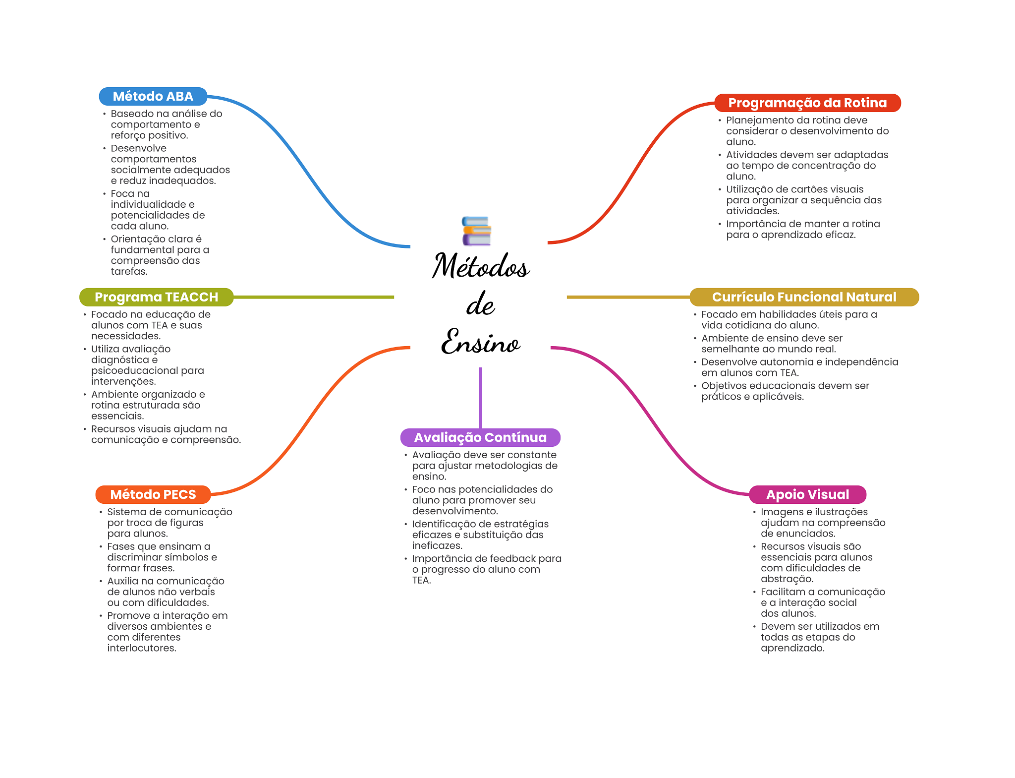 Método ABA Programação da Rotina Baseado na análise do comportamento e Planejamento da rotina deve reforço positivo. considerar desenvolvimento do aluno. Desenvolve comportamentos Atividades devem ser adaptadas socialmente adequados ao tempo de concentração do e reduz inadequados. aluno. Foca na Utilização de cartões visuais individualidade e para organizar a sequência das potencialidades de atividades. cada aluno. Importância de manter a rotina Orientação clara é para O aprendizado eficaz. fundamental para a compreensão das tarefas. Métodos Programa TEACCH de Currículo Funcional Natural Focado na educação de Focado em habilidades úteis para a alunos com TEA e suas vida cotidiana do aluno. necessidades. Utiliza avaliação Ensino Ambiente de ensino deve ser semelhante ao mundo real. diagnóstica e Desenvolve autonomia e independência psicoeducacional para em alunos com TEA. intervenções. Objetivos educacionais devem ser Ambiente organizado e práticos e aplicáveis. rotina estruturada são essenciais. Recursos visuais ajudam na comunicação e compreensão. Avaliação Contínua Avaliação deve ser constante para ajustar metodologias de ensino. Método PECS Foco nas potencialidades do aluno para promover seu Apoio Visual Sistema de comunicação desenvolvimento Imagens e ilustrações por troca de figuras Identificação de estratégias ajudam na compreensão para alunos. eficazes e substituição das de enunciados. Fases que ensinam a ineficazes. Recursos visuais são discriminar símbolos e Importância de feedback para essenciais para alunos formar frases. progresso do aluno com com dificuldades de Auxilia na comunicação TEA. abstração. de alunos não verbais Facilitam a comunicação ou com dificuldades. e a interação social Promove a interação em dos alunos. diversos ambientes e Devem ser utilizados em com diferentes todas as etapas do interlocutores. aprendizado.