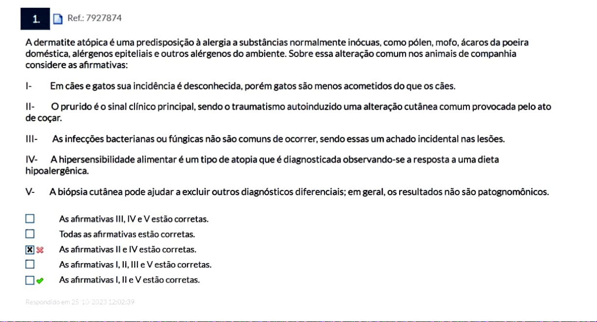 1 Ref.:7927874 A dermatite atópica é uma predisposição à alergia a substâncias normalmente inócuas, como pólen, mofo, ácaros da poeira doméstica, alérgenos epiteliais e outros alérgenos do ambiente. Sobre essa alteração comum nos animais de companhia considere as afirmativas: IV Em cãese gatos sua incidência é desconhecida, porém gatos são menos acometidos do que os cães. O prurido é o sinal clínico principal, sendo o traumatismo autoinduzido uma alteração cutânea comum provocada pelo ato de coçar. As infecções bacterianas ou fúngicas não são comuns de ocorrer, sendo essas um achado incidental nas lesões. A hipersensibilidade alimentaré um tipo de atopia que é diagnosticada observando-se a resposta a uma dieta hipoalergênica. A biópsia cutânea pode ajudar a excluir outros diagnósticos diferenciais; em geral, os resultados não são patognomônicos. As afirmativas II, IVeVestão corretas. Todas as afirmativas estão corretas. As afirmativas Il e IV estão corretas. As afirmativas I, II, Il e Vestão corretas. As afirmativas I, Il e V estão corretas. Respondido em 25 10 2023 12:02:39 2. D Ref.: 7927875 O lúpus eritrematoso discóide LED (cutâneo) é uma das doenças imunomediadas mais comuns em cães e envolve predonimantemente o plano nasal, face e orelhas, sendo as mucosas menos acometidas. Caracteriza-se primariamente por despigmentação e eros�o/ ulceração do plano nasal. Sobre seu diagnóstico é incorreto afirmar: É comum encontrar alta concentração de globulina beta e gama à eletroforese sérica. A biópsia de pele éo método de diagnóstico de escolha e deve ser realizada em lesões ulceradas onde encontraremos dermatite liquenoide e apoptose com graus variados de mucina dérmica. Pode-se encontrar no exame laboratorial complementar proteinúria decorrente da glomerulonefrite, anemia hemolítica e leucopenia. Algumas doenças infecciosas como leishmaniose e esporotricose podem também compor o diagnóstico diferencial de LED. E necessário realizar o diagnóstico diferencial de carcinoma escamocelular que pode acometer tambémo plano nasal de cães. 3. Ref.: 7927878 Um cão é atendido no setor de dermatologia do hospital com a queixa principal de dor no ouvido, apresenta histórico de otite recorrente e dermatite atópica. Durante o exame foi avaliado dor, odor forte, presença de secreção ceruminolítica escura nos dois condutos, porém na avaliação otoscópica não foi possível verificar se houve ou não rompimento da membrana timpânica. Em relação aos exames complementares, possível diagnóstico e o tratamento mais adequado, respectivamente, assinale a resposta com a ordem correta: Citologia, cultura e antibiograma, radiografia; otite externa, antibióticoe anti-inflamatório sistêmico e ceruminolítico com Ph ácido. Biopsia, cultura e antibiograma, radiografia; otite bilateral externa e interna; antibiótico e anti-inflamatório tópico e ceruminolítico com Ph neutro. Citologia, cultura e antibiograma, tomografia computadorizada; otite bilateral externa e interna, antibiótico e anti-inflamatório tópico e ceruminolítico com Ph neutro. Biopsia, cultura e antibiograma, ultrassonografia; otite externa, antibióticoe anti-inflamatório tópico e ceruminolítico com Ph ácido. Citologia, cultura e antibiograma, tomograf1a computadorizada; otite bilateral interna, antibiótico sistêmico e ceruminolítico com Ph ácido. Respondido em 25 10:2023 12:32:50 4 Ref.: 7927876 O termo otite deriva da presença de um processo inflamatório englobando diversas estruturas e tecidos do conduto auditivo, sendo causada por diversos fatores. Sobre suas principais causas e consequências, marque a alternativa correta: Fatores predisponentes causam modificação no ambiente habitual do conduto auricular externo, como ocorre em cães submetidos a baixas temperaturas. Bactérias como Pseudomonas aeruginosa são mais comumente cultivadas na otite externa. Aotite interna pode causar déficits vestibulares, nistagmo, desvio de cabeça., ataxia e relutância para mover a cabeça. A otite média pode ser causada por parasitas como Otodects cynotis e seu não tratamento pode levara surdez e achados neurológicos. As causas secundárias, como manipulação incorreta do pavilhäo auricular, principalmente pelos tutores dos cães, levam ao aumento de bactérias e leveduras já presentes no conduto. Respondido em0411/2023 21:11:55 5. Ref.: 7927881 A catarata é caracterizada pela opacidade do cristalino que se desenvolve devido a transtornos metabólicos que envolvem alterações bioquímicas, principalmernte relacionadas à coagulação de proteínas. Sobre os principais sinais clínicos, assinale a alternativa INCORRETA: Para uma avaliação completa da lente sugere-se dilatação da pupila com tropicamida. Os principais sinais são a opacificação da lente ea diminuição da acuidade visual do animal relatada pelo tutor. O exame de fundo de olho normal exciui a presença de catarata. Oreflexo pupilar à luz de ser positivo em qualquer estágio da catarata, pois não há interferência significativa na passagem dos raios luminosos que atingema retina. Aglicose sanguínea e o exame de urina devem ser realizados em todos os pacientes com perda de visão súbita e opacidade do cristalino. Rspondicka em 1/11202249 6. Ref.: 7927882 Sobre o diagnóstico do glaucoma em cães e gatos, considere as afirmativas a seguir: A tonometria é o exame clínico de mensuração da PIO (pressão intra ocular) importante no diagnóstico e monitoração de pacientes com glaucoma. Na oftalmoscopia indireta utiliza-se um oftalmoscópio, oqual proporciona imagem de uma pequena área do fundo com maior detalhamento, já na oftalmoscopia direta utiliza-se uma lente, comumente de 20D, e uma fonte de luz focal entre o avaliador e o paciente, fornecendo uma imagem ampla do fundo de olho, porém com menos detalhes e de forma invertida. AUSG ocular é fortemente indicada par