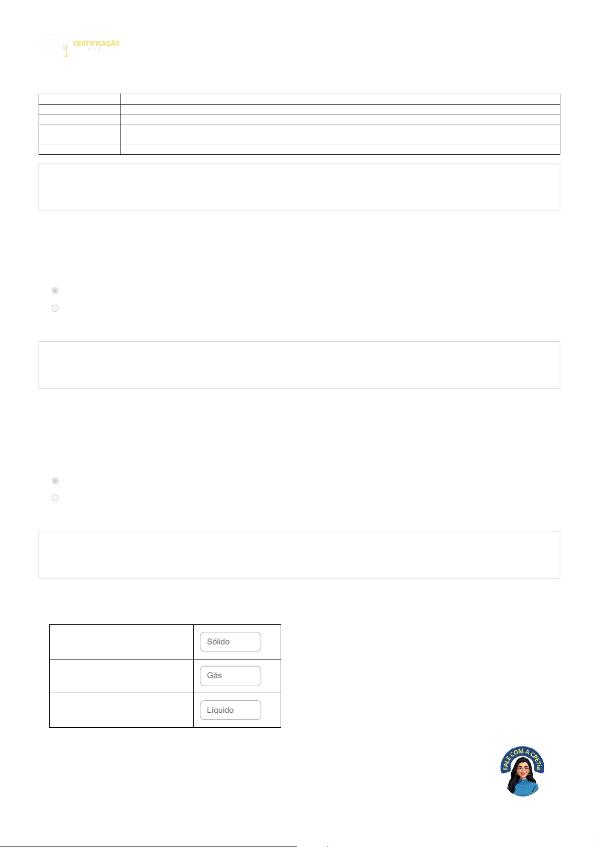 Iniciado em quinta-feira, 8 jan. 2026, 10:00 Estado Finalizada Concluída em quinta-feira, 8 jan. 2026, 10:04 Tempo empregado 3 minutos 58 segundos Avaliar 8,67 de um máximo de 10,00(86,67%) Questão 1 Correto Atingiu 1,00 de 1,00 Questão 2 Incorreto Atingiu 0,00 de 1,00 Questão 3 Correto Atingiu 1,00 de 1,00 Nos fluidos ideais, consideremos que não existe atrito entre as moléculas que se deslocam quando o fluido escoa, nem atrito entre o fluido e as paredes do condutor. Escolha uma opção: Verdadeiro Falso "É observado que, ao mergulhar em uma piscina ou mesmo no mar, a "pressão" aumenta à medida em que é maior a profundidade que você alcança. Ou seja, ocorre uma variação de pressão, em função da profundidade". Este comportamento se dá devido a densidade da água acima do corpo do mergulhador. Escolha uma opção: Verdadeiro Falso Associe: Forma definida e volume definido. __________ Forma indefinida e volume indefinido. __________ Forma indefinida e volume definido. __________ Sólido Gás Líquido Sua resposta está correta. Instalações Hidráulicas - Água Fria e Quente - sg JC 08/01/26, 10:05 Exercícios de Fixação - Aula 01: Hidrostática I (Complementar): Revisão da tentativa https://www.certificacaotecnica.com.br/mod/quiz/review.php?attempt=11557540&cmid=46587 1/4 https://www.certificacaotecnica.com.br/dashboard/index.php?page=0&tour_guide=0 https://www.certificacaotecnica.com.br/dashboard/index.php?page=264&icon=excelencia https://cpetintegracao.com.br/rediratendimento.php Questão 4 Correto Atingiu 1,00 de 1,00 Questão 5 Correto Atingiu 1,00 de 1,00 Questão 6 Correto Atingiu 1,00 de 1,00 Caracteriza-se por ser uma grandeza adimensional: Escolha uma opção: a. Peso específico b. Densidade relativa c. Empuxo d. Massa específica e. Vazão Sua resposta está correta. Ao mantermos constante o volume de uma amostra ao aumentarmos sua massa, qual é o comportamento da sua densidade? Escolha uma opção: a. Aumenta b. Permanece igual c. Diminui d. Permanece constante, porém, o peso específico da substância analisada aumenta e. Permanece constante, porém, o peso específico da substância analisada diminui Sua resposta está correta. Associe: Relação entre massa e volume. __________ Usa-se a água como substância de referência para sua determinação. __________ Fundamenta-se utilizando a 2ª lei Newtoniana. __________ Massa específica Densidade relativa Peso específico Sua resposta está correta. Instalações Hidráulicas - Água Fria e Quente - sg JC 08/01/26, 10:05 Exercícios de Fixação - Aula 01: Hidrostática I (Complementar): Revisão da tentativa https://www.certificacaotecnica.com.br/mod/quiz/review.php?attempt=11557540&cmid=46587 2/4 https://www.certificacaotecnica.com.br/dashboard/index.php?page=0&tour_guide=0 https://www.certificacaotecnica.com.br/dashboard/index.php?page=264&icon=excelencia https://cpetintegracao.com.br/rediratendimento.php Questão 7 Correto Atingiu 1,00 de 1,00 Questão 8 Parcialmente correto Atingiu 0,67 de 1,00 Questão 9 Correto Atingiu 1,00 de 1,00 Uma diferença muito importante entre líquido e gás é a miscibilidade. Os líquidos nem sempre são miscíveis entre si. Os gases, ao contrário, sempre se misturam homogeneamente. Escolha uma opção: Verdadeiro Falso Associe: Superfície livre de um líquido em equilíbrio. __________ Líquidos de diferentes densidades. __________ Força exercida por um líquido sobre uma superfície qualquer. __________ Perpendicular à superfície Imiscibilidade Perpendicular à superfície Sua resposta está parcialmente correta. Você selecionou corretamente 2. Qual a massa de um corpo de volume 1 m³, se este corpo é feito de ferro? Dado: densidade do ferro=7,85 g/cm³. Escolha uma opção: a. Não existe alternativa correta b. 7850 g c. 78,5 Kg d. 7 850 000 Kg e. 7850 Kg Sua resposta está correta. Instalações Hidráulicas - Água Fria e Quente - sg JC 08/01/26, 10:05 Exercícios de Fixação - Aula 01: Hidrostática I (Complementar): Revisão da tentativa https://www.certificacaotecnica.com.br/mod/quiz/review.php?attempt=11557540&cmid=46587 3/4 https://www.certificacaotecnica.com.br/dashboard/index.php?page=0&tour_guide=0 https://www.certificacaotecnica.com.br/dashboard/index.php?page=264&icon=excelencia https://cpetintegracao.com.br/rediratendimento.php Questão 10 Correto Atingiu 1,00 de 1,00 Líquidos e gases são classificados como fluidos por conterem exatamente as mesmas propriedades e comportamento no estudo da hidrostática. Escolha uma opção: Verdadeiro Falso ◀ Anterior Próximo ▶ Instalações Hidráulicas - Água Fria e Quente - sg JC 08/01/26, 10:05 Exercícios de Fixação - Aula 01: Hidrostática I (Complementar): Revisão da tentativa https://www.certificacaotecnica.com.br/mod/quiz/review.php?attempt=11557540&cmid=46587 4/4 https://www.certificacaotecnica.com.br/mod/url/view.php?id=135081&forceview=1 https://www.certificacaotecnica.com.br/mod/lti/view.php?id=46588&forceview=1 https://www.certificacaotecnica.com.br/dashboard/index.php?page=0&tour_guide=0 https://www.certificacaotecnica.com.br/dashboard/index.php?page=264&icon=excelencia https://cpetintegracao.com.br/rediratendimento.php