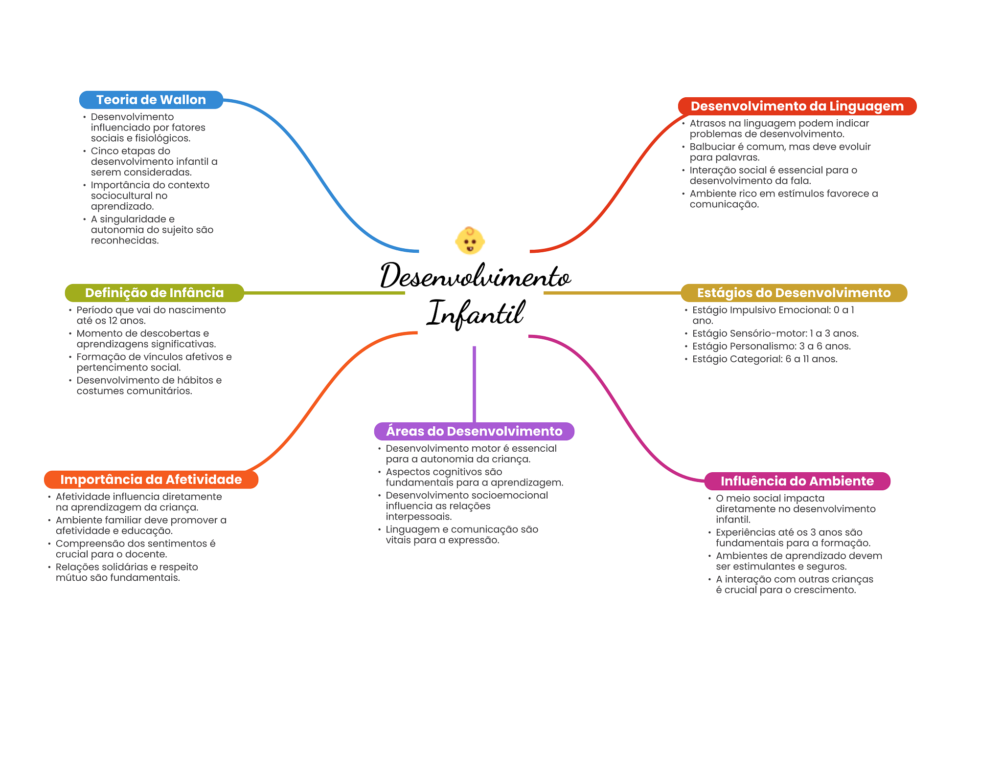 Teoria de Wallon Desenvolvimento da Linguagem Desenvolvimento influenciado por fatores Atrasos na linguagem podem indicar sociais e fisiológicos. problemas de desenvolvimento. Cinco etapas do Balbuciar é comum, mas deve evoluir desenvolvimento infantil a para palavras. serem consideradas. Interação social é essencial para Importância do contexto da fala. sociocultural no Ambiente rico em estímulos favorece a aprendizado. comunicação. A singularidade e autonomia do sujeito são reconhecidas. Desenvolvimento Definição de Infância Estágios do Desenvolvimento Período que vai do nascimento Infantil Estágio Impulsivo Emocional: 0 a 1 até OS 12 anos. ano. Momento de descobertas e Estágio Sensório-motor: 1 a 3 anos. aprendizagens significativas. Estágio Personalismo: 3 a 6 anos. Formação de vínculos afetivos e Estágio Categorial: 6 a 11 anos. pertencimento social. Desenvolvimento de hábitos e costumes comunitários. Áreas do Desenvolvimento motor é essencial para a autonomia da criança. Aspectos cognitivos são Importância da Afetividade fundamentais para a aprendizagem. Influência do Ambiente Afetividade influencia diretamente Desenvolvimento socioemocional meio social impacta na aprendizagem da criança. influencia as relações diretamente no desenvolvimento Ambiente familiar deve promover a interpessoais. infantil. afetividade e educação. Linguagem e comunicação são Experiências até 3 anos são Compreensão dos sentimentos é vitais para a expressão. fundamentais para a formação. crucial para docente. Ambientes de aprendizado devem Relações solidárias e respeito ser estimulantes e seguros. mútuo são fundamentais. A interação com outras crianças é crucial para crescimento.