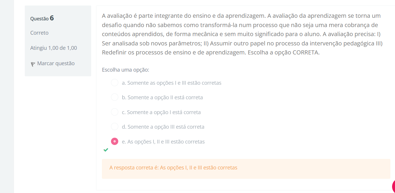 Questão 6 A avaliação é parte integrante do ensino e da aprendizagem. A avaliação da aprendizagem se torna um desafio quando não sabemos como transformá-la num processo que não seja uma mera cobrança de Correto conteúdos aprendidos, de forma mecânica e sem muito significado para 0 aluno. A avaliação precisa: I) Ser analisada sob novos parâmetros; II) Assumir outro papel no processo da intervenção pedagógica III) Atingiu 1,00 de 1,00 Redefinir processos de ensino e de aprendizagem. Escolha a opção CORRETA. Marcar questão Escolha uma opção: a. Somente as opções I e III estão corretas b. Somente a opção está correta C. Somente a opção está correta d. Somente a opção III está correta e. As opções I, e III estão corretas A resposta correta é: As opções I, II e III estão corretas