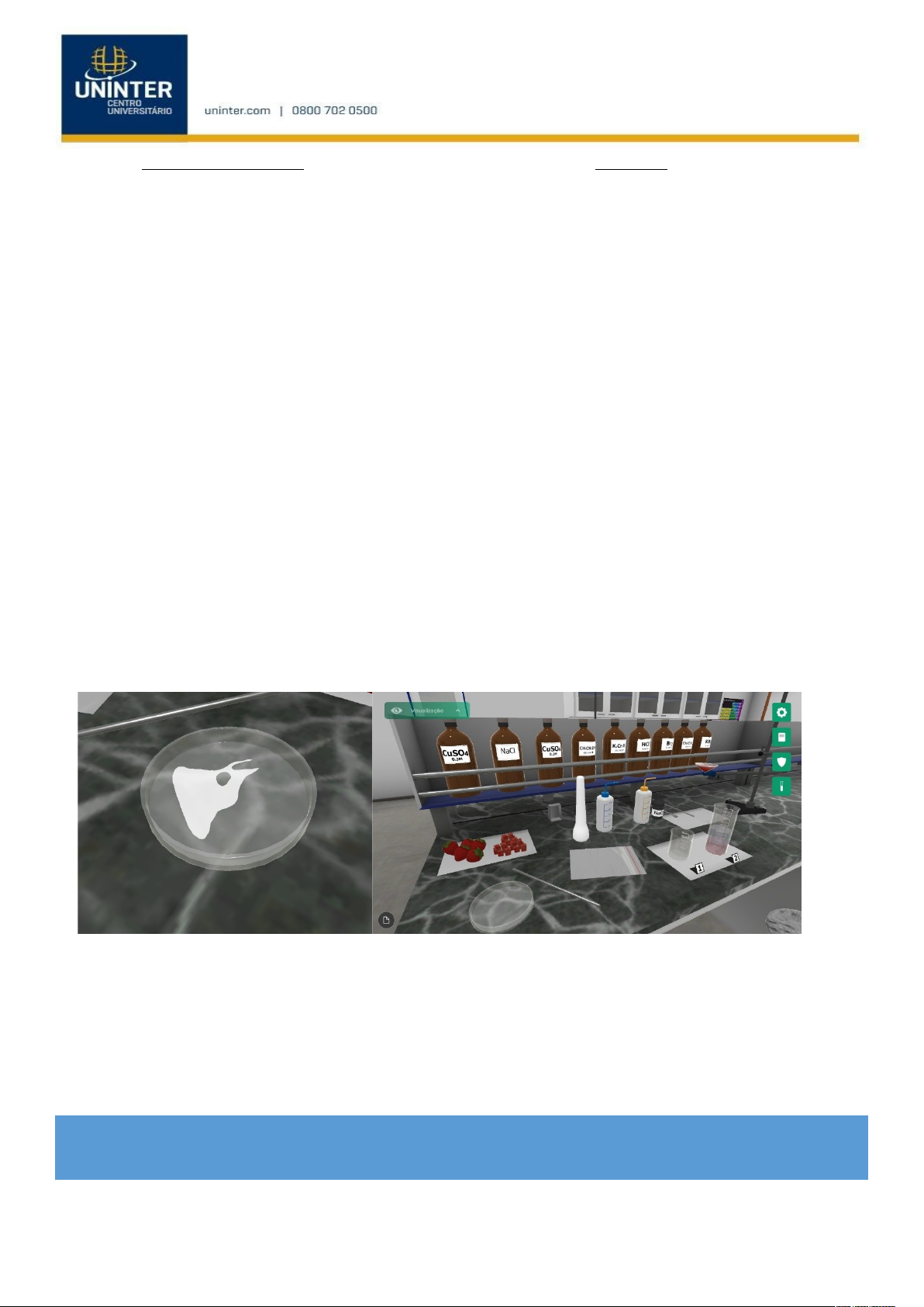 Disciplina: Bioquímica Relatório das Atividades Práticas Prof. Fernando Carvalho Aluno(a): Henrique Vital Melo________________________ RU: 4916879______ ATIVIDADE PRÁTICA – LABORATÓRIO VIRTUAL Com base no experimento realizado e nos conhecimentos adquiridos na disciplina de Bioquímica, responda às questões abaixo: 1. Quais são as funções químicas que compõem o DNA? Quais os nucleotídeos presentes no DNA? E qual a função básica de cada um deles? R: Um grupo fosfato, um açúcar (desoxirribose) e uma base nitrogenada. Os nucleotídeos são: adenina (A) Participa do armazenamento e transmissão da informação genética; guanina (G) ajuda a manter a estrutura e integridade da molécula de DNA; citosina (C) Contribui para a fidelidade da informação genética; e timina (T) Ajuda a estabilizar a dupla hélice do DNA. 2. Os vírus são organismos que não possuem DNA, mas possuem uma macromolécula chamada de RNA, qual é a diferença básica entre eles? R: A diferença básica entre essas moléculas é que na molécula de DNA existem duas longas fitas de nucleotídeos enroladas em forma de dupla hélice, enquanto na molécula de RNA existe apenas uma única fita, sintetizada pelo próprio DNA 3. Após o experimento realizado no laboratório virtual, o precipitado foi transferido para uma placa de Petri, com base em seus conhecimentos, o que compunha esse precipitado? R: Moléculas de DNA. Pode haver também pequenas quantidades de proteínas ou resíduos celulares, mas o principal componente é o DNA. Adicione as fotos tiradas durante a realização do experimento utilizando o Laboratório Virtual ATIVIDADE PRÁTICA – POLO DE APOIO PRESENCIAL Com base no experimento realizado e nos conhecimentos adquiridos na disciplina de Bioquímica, responda às questões abaixo: 1. Por que é necessário macerar a fruta?? Ao invés de macerar, poderia ser triturada em liquidificador ou aparelho similar? Por quê? R: A ação de amassar o morango é realizada para romper a parede celular das células, isso ajuda a quebrar a estrutura física do morango e a liberar seu conteúdo celular. Não é recomendada o uso de liquidificador ou triturador, pois pode quebrar suas moléculas e dificultar a visualização e extração do DNA. 2. Em que etapa do procedimento ocorre o rompimento das membranas das células? Explique. R: Na etapa do maceramento da fruta, isso ajuda a romper as paredes das células, liberando seu conteúdo. 3. Na prática, qual a função do sal de cozinha? R: O cloreto de sódio ajuda a neutralizar as cargas negativas do DNA, o que permite que ele se una e forme aglomerados, pois as moléculas de DNA passam a não sofrer repulsão. 4. E o detergente, qual é sua função? R: A ação do detergente ajuda a dissolver as membranas celulares e nucleares, que são compostas de fosfolipídios. Isso libera o conteúdo das células, incluindo o DNA. 5. Qual é a função do álcool durante o procedimento? R: O álcool frio faz com que o DNA precipite, pois o DNA não é solúvel em álcool, ou seja, o DNA aparece na superfície da solução em forma de uma substância esbranquiçada, fibrosa que pode ser vista a olho nu. 6. Por que você não pode ver a dupla hélice do DNA extraído? R: Porque a dupla hélice do DNA é microscópica, ou seja, muito pequena para ser vista sem instrumentos específicos. 7. Adicione fotos ou desenhos do que você conseguiu visualizar ao microscópio. Não esqueça de adicionar, também, as fotos tiradas durante a realização do experimento. Imagens microscopias do DNA do morango Imagens microscopias do DNA da banana 04/02/2025 1 image4.jpeg image5.jpeg image6.jpeg image7.jpeg image8.jpeg image9.jpeg image10.jpeg image11.jpeg image12.jpeg image13.jpeg image14.jpeg image1.jpeg image2.jpeg image3.jpeg image15.png