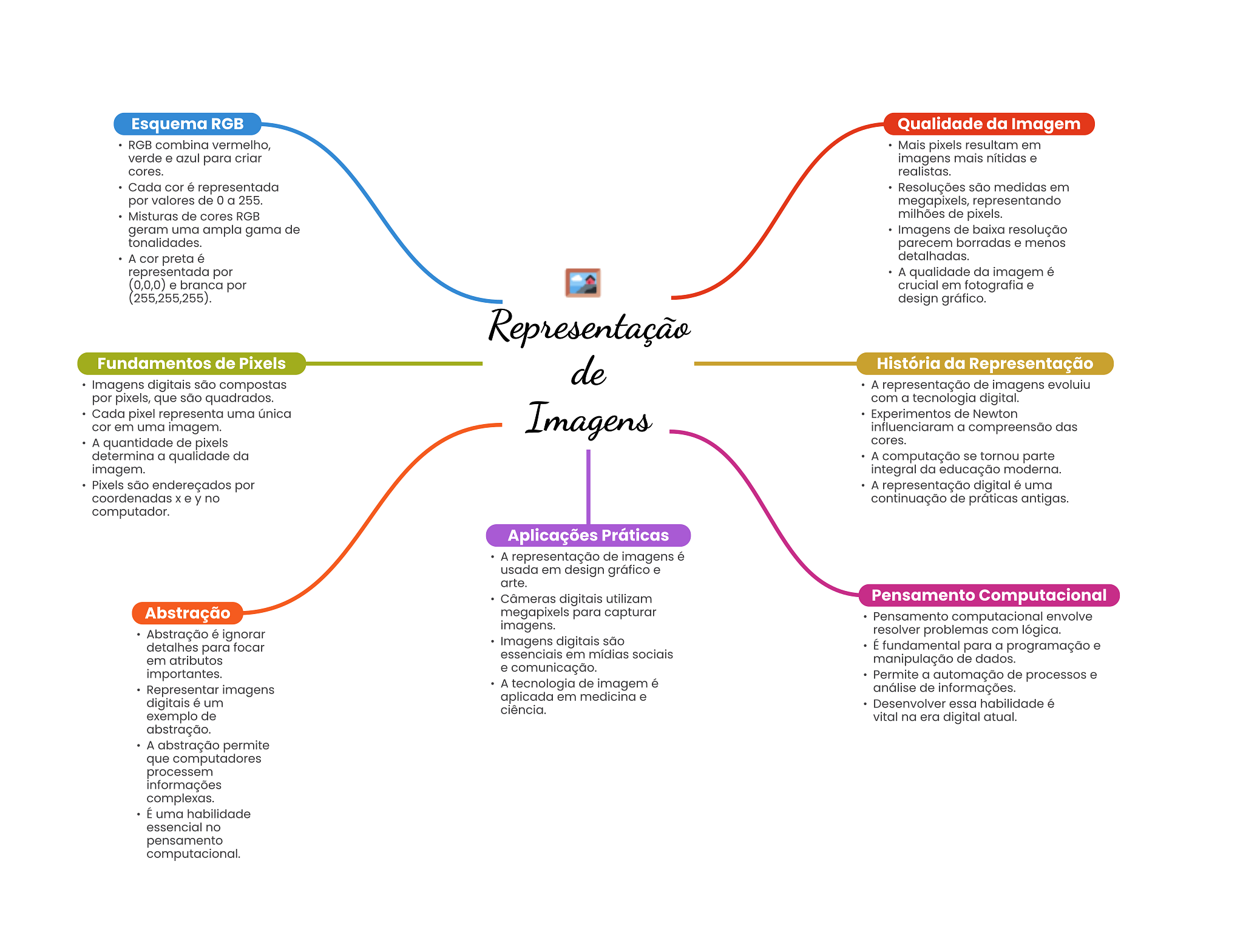 Esquema RGB Qualidade da Imagem RGB combina vermelho, Mais pixels resultam em verde e azul para criar imagens mais nítidas e cores. realistas. Cada cor é representada Resoluções são medidas em por valores de 0 a 255. megapixels, representando Misturas de cores RGB milhões de pixels. geram uma ampla gama de Imagens de baixa resolução tonalidades. parecem borradas e menos A cor preta é detalhadas. representada por A qualidade da imagem é (0,0,0) e branca por crucial em fotografia e (255,255,255). design gráfico. Representação Fundamentos de Pixels de História da Representação Imagens digitais são compostas A representação de imagens evoluiu por pixels, que são quadrados. com a tecnologia digital. Cada pixel representa uma única Imagens Experimentos de Newton cor em uma imagem. influenciaram a compreensão das A quantidade de pixels cores. determina a qualidade da A computação se tornou parte imagem. integral da educação moderna. Pixels são endereçados por A representação digital é uma coordenadas X e y no continuação de práticas antigas. computador. Aplicações Práticas A representação de imagens é usada em design gráfico e arte. Câmeras digitais utilizam Pensamento Computacional Abstração megapixels para capturar Pensamento computacional envolve imagens. Abstração é ignorar resolver problemas com lógica. detalhes para focar Imagens digitais são É fundamental para a programação e essenciais em mídias sociais em atributos manipulação de dados. importantes. e comunicação. Permite a automação de processos e Representar imagens A tecnologia de imagem é análise de informações. digitais é um aplicada em medicina e Desenvolver essa habilidade é ciência. exemplo de vital na era digital atual. abstração. A abstração permite que computadores processem informações complexas. É uma habilidade essencial no pensamento computacional.