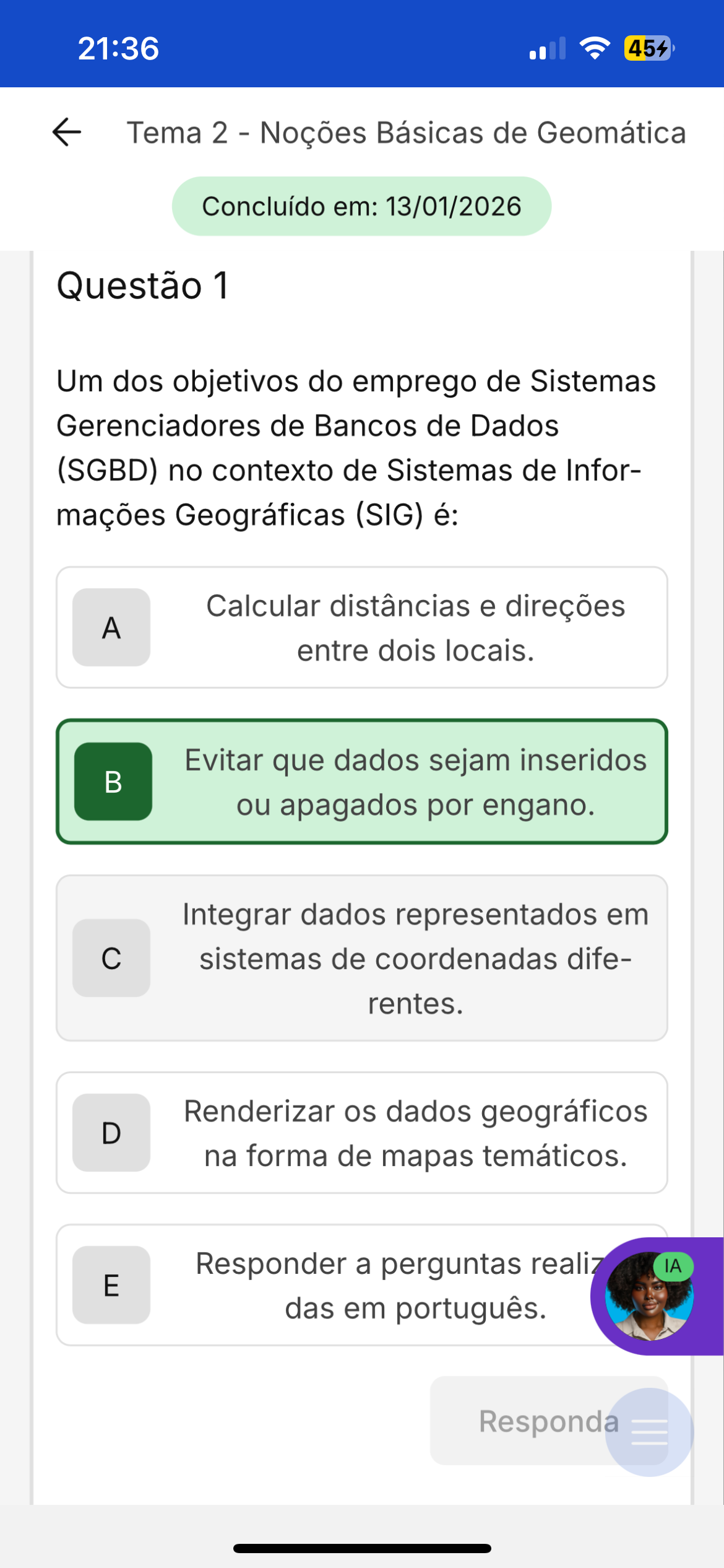 21:36 454 Tema 2 - - Noções Básicas de Geomática Concluído em: 13/01/2026 Questão 1 Um dos objetivos do emprego de Sistemas Gerenciadores de Bancos de Dados (SGBD) no contexto de Sistemas de Infor- mações Geográficas (SIG) é: Calcular distâncias e direções A entre dois locais. Evitar que dados sejam inseridos B ou apagados por engano. Integrar dados representados em c sistemas de coordenadas dife- rentes. Renderizar os dados geográficos D na forma de mapas temáticos. Responder a perguntas realiz IA E das em português. Responda