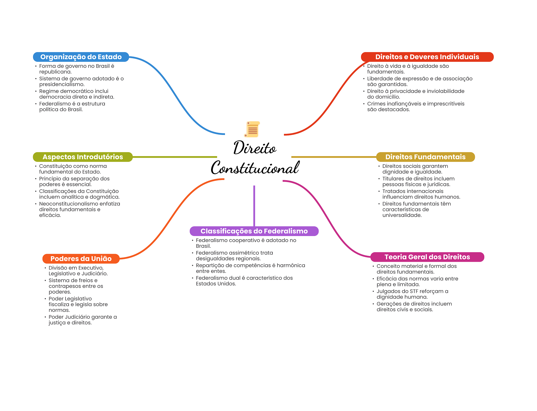 Organização do Estado Direitos e Deveres Individuais Forma de governo no Brasil é Direito à vida e à igualdade são republicana. fundamentais. Sistema de governo adotado é Liberdade de expressão e de associação presidencialismo. são garantidas. Regime democrático inclui Direito à privacidade e inviolabilidade democracia direta e indireta. do domicílio. Federalismo é a estrutura Crimes inafiançáveis e imprescritíveis política do Brasil. são destacados. Direito Aspectos Introdutórios Direitos Fundamentais Constituição como norma Constitucional Direitos sociais garantem fundamental do Estado. dignidade e igualdade. Princípio da separação dos Titulares de direitos incluem poderes é essencial. pessoas físicas e jurídicas. Classificações da Constituição Tratados internacionais incluem analítica e dogmática. influenciam direitos humanos. enfatiza Direitos fundamentais têm direitos fundamentais e características de eficácia. universalidade. Classificações do Federalismo Federalismo cooperativo é adotado no Brasil. Federalismo assimétrico trata Poderes da União desigualdades regionais. Teoria Geral dos Direitos Divisão em Executivo, Repartição de competências é harmônica Conceito material e formal dos entre entes. Legislativo e Judiciário. direitos fundamentais. Sistema de freios e Federalismo dual é característico dos Eficácia das normas varia entre Estados Unidos. contrapesos entre plena e limitada. poderes. Julgados do STF reforçam a Poder Legislativo dignidade humana. fiscaliza e legisla sobre Gerações de direitos incluem normas. direitos civis e sociais. Poder Judiciário garante a justiça e direitos.