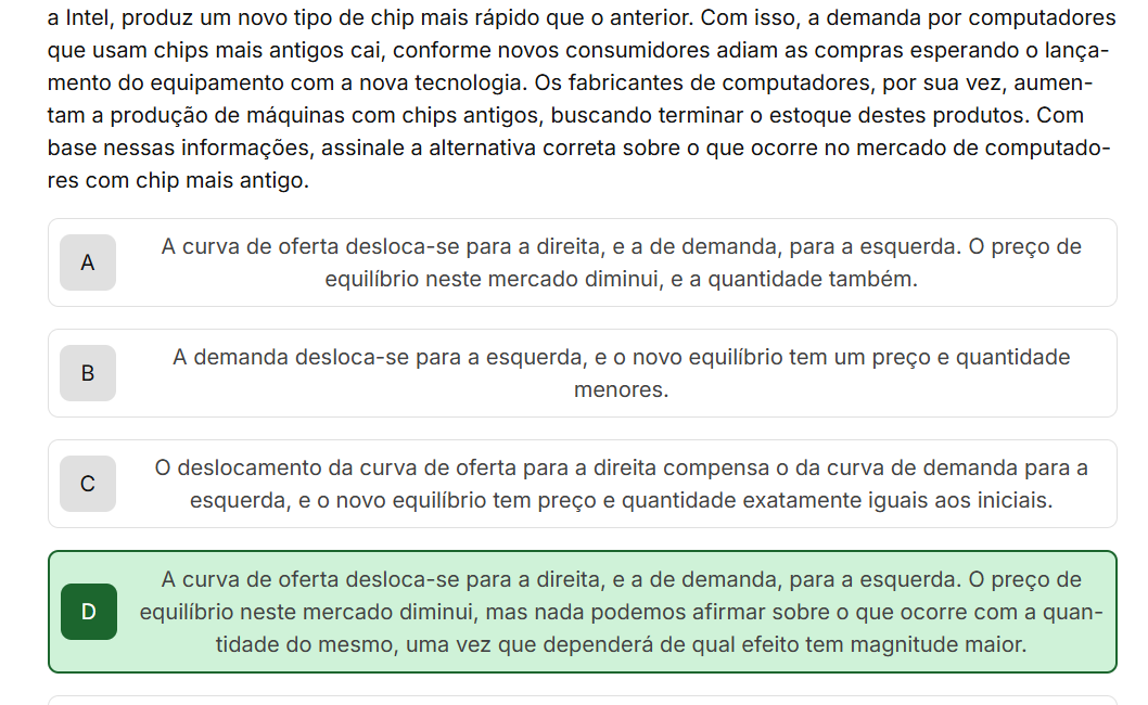 a Intel, produz um novo tipo de chip mais rápido que anterior. Com isso, a demanda por computadores que usam chips mais antigos cai, conforme novos consumidores adiam as compras esperando lança- mento do equipamento com a nova tecnologia. Os fabricantes de computadores, por sua vez, aumen- tam a produção de máquinas com chips antigos, buscando terminar estoque destes produtos. Com base nessas informações, assinale a alternativa correta sobre que ocorre no mercado de computado- res com chip mais antigo. A curva de oferta desloca-se para a direita, e a de demanda, para a esquerda. preço de A equilíbrio neste mercado diminui, e a quantidade também. A demanda desloca-se para a esquerda, e O novo equilíbrio tem um preço e quantidade menores. deslocamento da curva de oferta para a direita compensa da curva de demanda para a esquerda, e novo equilíbrio tem preço e quantidade exatamente iguais aos iniciais. A curva de oferta desloca-se para a direita, e a de demanda, para a esquerda. preço de D equilíbrio neste mercado diminui, mas nada podemos afirmar sobre que ocorre com a quan- tidade do mesmo, uma vez que dependerá de qual efeito tem magnitude maior.