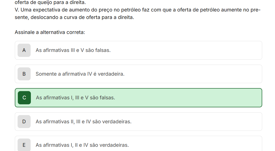 oferta de queijo para a direita. V. Uma expectativa de aumento do preço no petróleo faz com que a oferta de petróleo aumente no pre- sente, deslocando a curva de oferta para a direita. Assinale a alternativa correta: A As afirmativas III e V são falsas. Somente a afirmativa IV é verdadeira. As afirmativas I, III e V são falsas. D As afirmativas II, III e IV são verdadeiras. E As afirmativas I, e IV são verdadeiras.