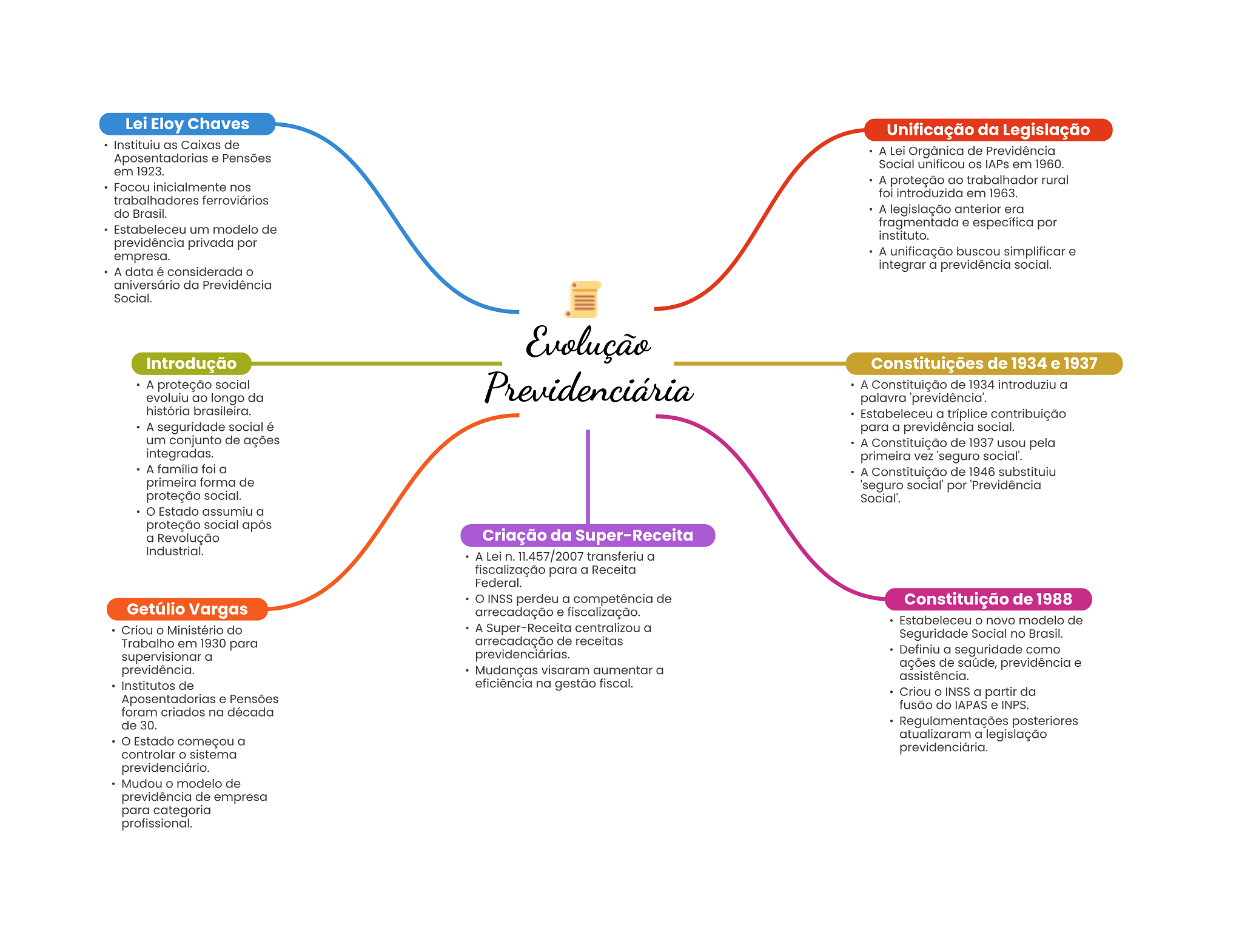 Lei Eloy Chaves Unificação da Legislação Instituiu as Caixas de A Lei Orgânica de Previdência Aposentadorias e Pensões Social unificou IAPs em 1960. em 1923. Focou inicialmente nos A proteção ao trabalhador rural foi introduzida em 1963. trabalhadores ferroviários do Brasil. A legislação anterior era Estabeleceu um modelo de fragmentada e específica por instituto. previdência privada por empresa. A unificação buscou simplificar e A data é considerada integrar a previdência social. aniversário da Previdência Social. Evolução Introdução Constituições de 1934 e 1937 A proteção social evoluiu ao longo da Previdenciária A Constituição de 1934 introduziu a palavra história brasileira. Estabeleceu a tríplice contribuição A seguridade social é para a previdência social. um conjunto de ações A Constituição de 1937 usou pela integradas. primeira vez 'seguro A família foi a A Constituição de 1946 substituiu primeira forma de social' por Previdência proteção social. Social'. Estado assumiu a proteção social após a Revolução Criação da Super-Receita Industrial. A Lei n. 11.457/2007 transferiu a fiscalização para a Receita Federal. INSS perdeu a competência de Constituição de 1988 Getúlio Vargas arrecadação e fiscalização. Estabeleceu novo modelo de Criou Ministério do A Super-Receita centralizou a Seguridade Social no Brasil. Trabalho em 1930 para arrecadação de receitas supervisionar a previdenciárias. Definiu a seguridade como ações de saúde, previdência e previdência. Mudanças visaram aumentar a assistência. Institutos de eficiência na gestão fiscal. Criou INSS a partir da Aposentadorias e Pensões fusão do IAPAS e INPS. foram criados na década de 30. Regulamentações posteriores Estado começou a atualizaram a legislação controlar sistema previdenciária. previdenciário. Mudou modelo de previdência de empresa para categoria profissional.